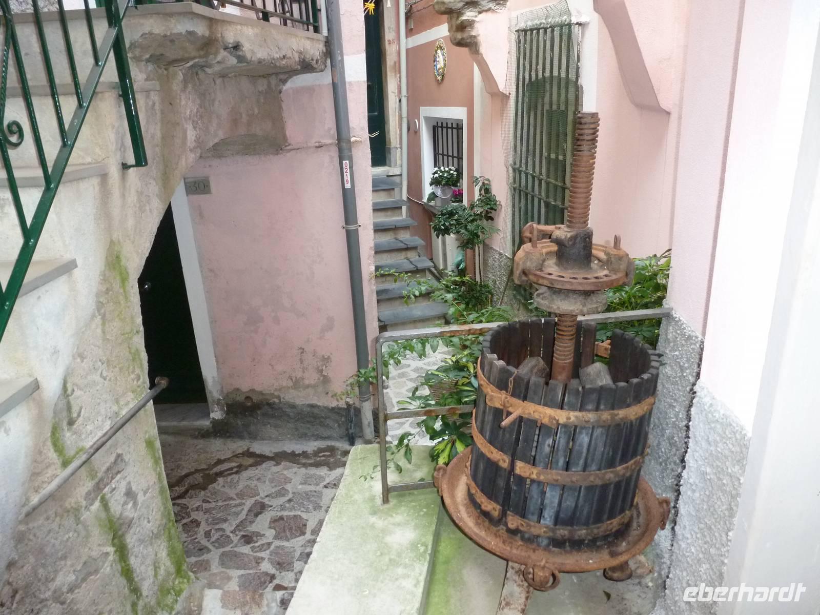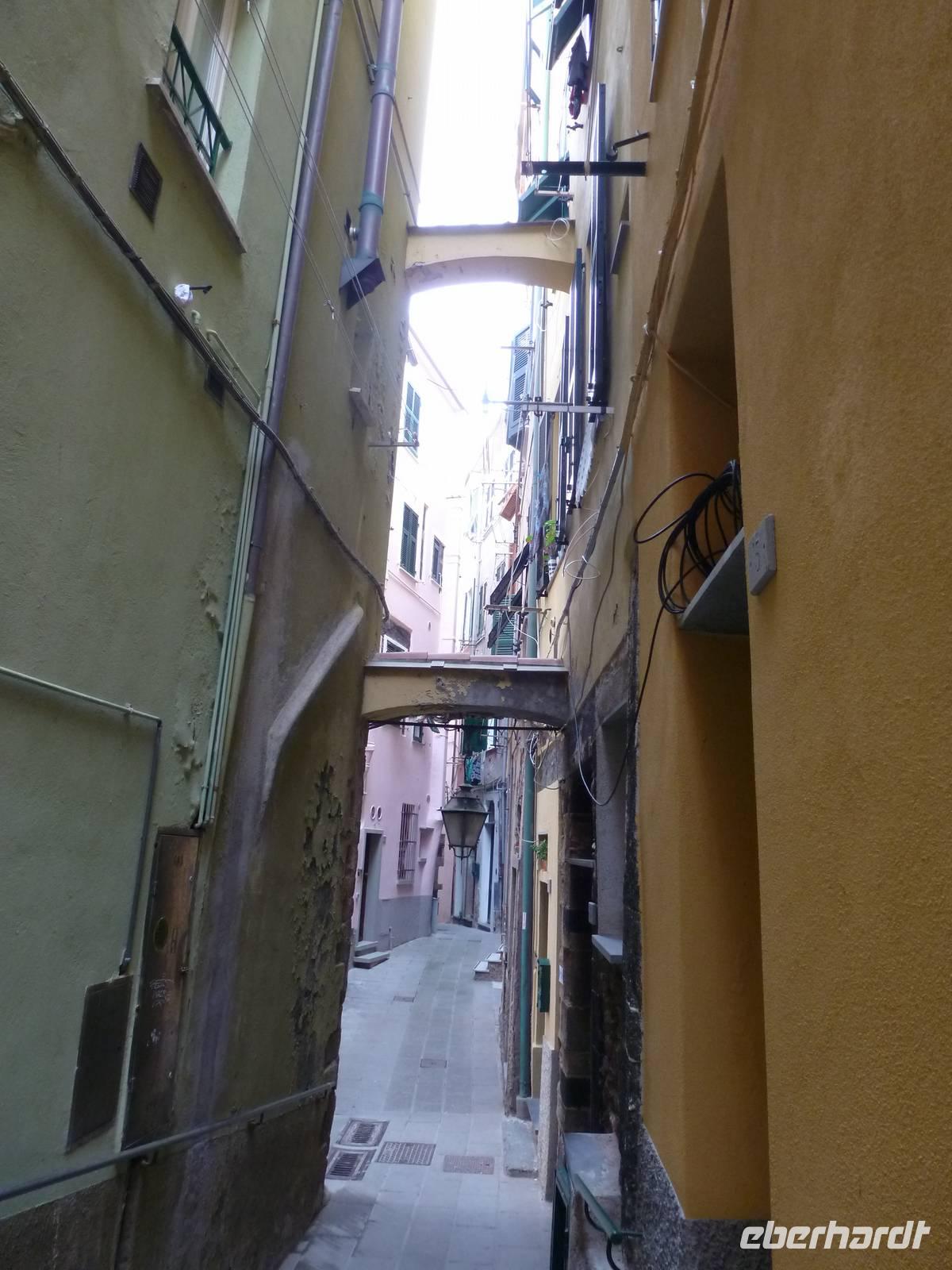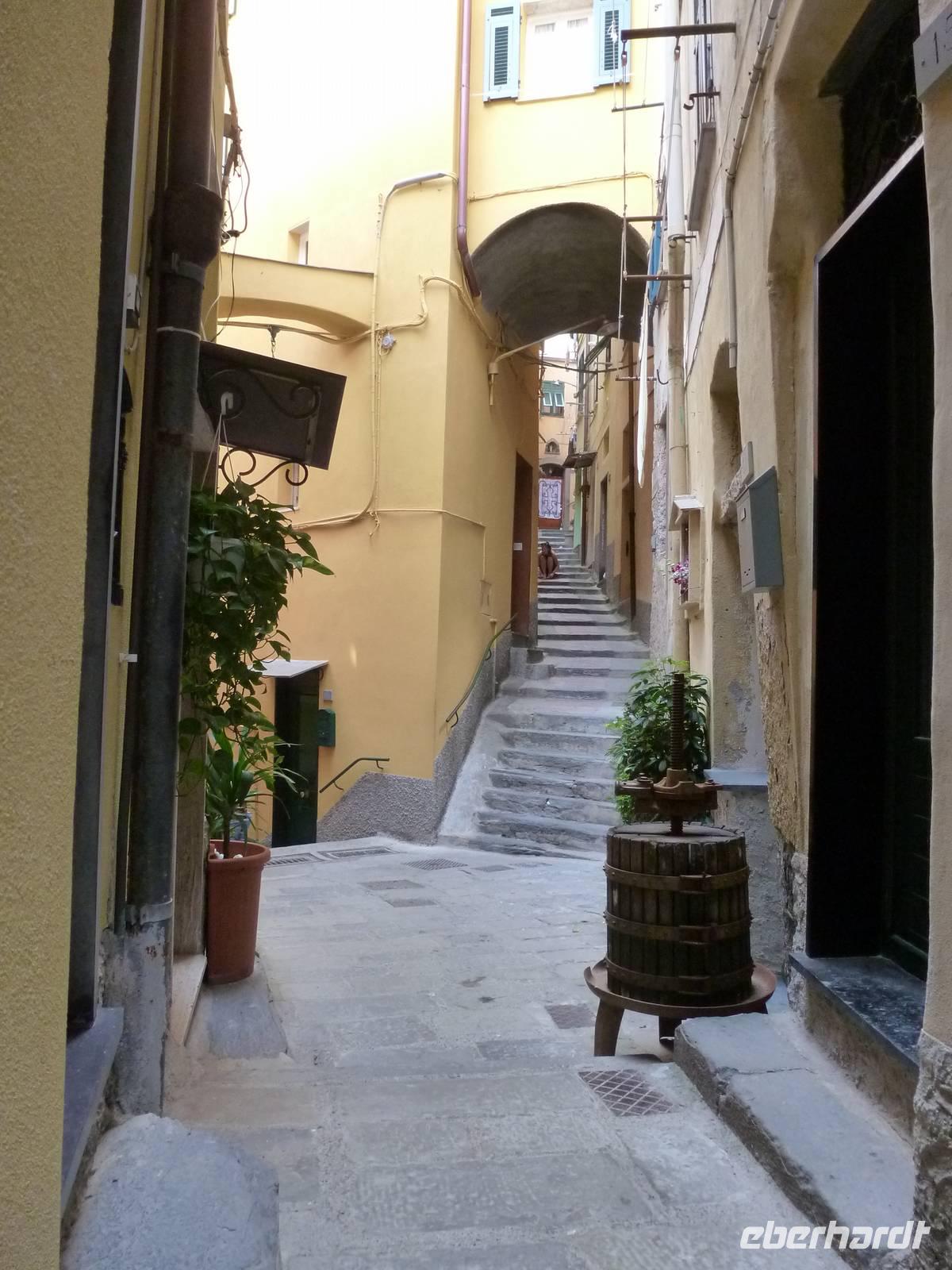 Unsere Endstation mit dem Zug war Riomaggiore (1.800 Einwohner) Die Häuser schmiegen sich rechts und links im Tal des Rio Maior entlang bis zum alten Fischerhafen. In jahrhundertlanger Arbeit haben die Menschen eine einzigartige Kulturlandschaft mit Terrassen aus Trockenmauern geschaffen, um Wein und Oliven zu kultivieren.