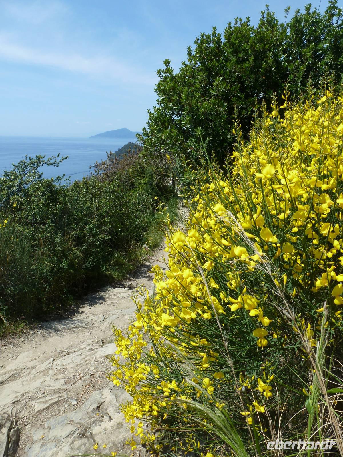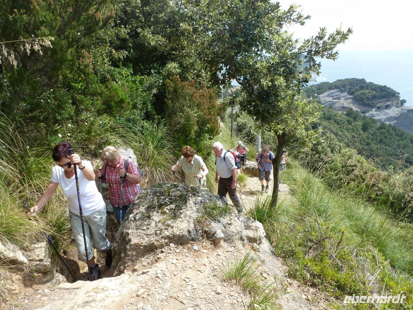 Die Fußgängerzone ist gesäumt von prächtigen Fassaden, z.B. die „Villa Balbi" und Don Luigi. Der kleine Anstieg zur Kirche „Chiesa die Cappuccini" aus dem XVII Jh. lohnt auf jedem Fall, da die Baia del Silenzio „Stille Bucht" , komplett zu bewundern ist. Von der Fußgängergasse Via XXV April führt unser Wanderweg zum Aussichtspunkt Punta Manara. Dort genießen wir in fröhlicher Runde einen Limoncello. Der Ausblick auf die zerklüftete Küste und das azurblaue Mittelmeer mit der Landzunge ist beeindruckend. Ein herrlicher Küstenweg lässt uns die Mittelmeer - Maccia besser kennen lernen und so manche kleine Eidechse sonnt sich auf den Kalksteinen. Der gelbe Ginster, Pechsamenstrauch, rote Spornblume und die weiß blühende Baumheide sind unsere Wegbegleiter.