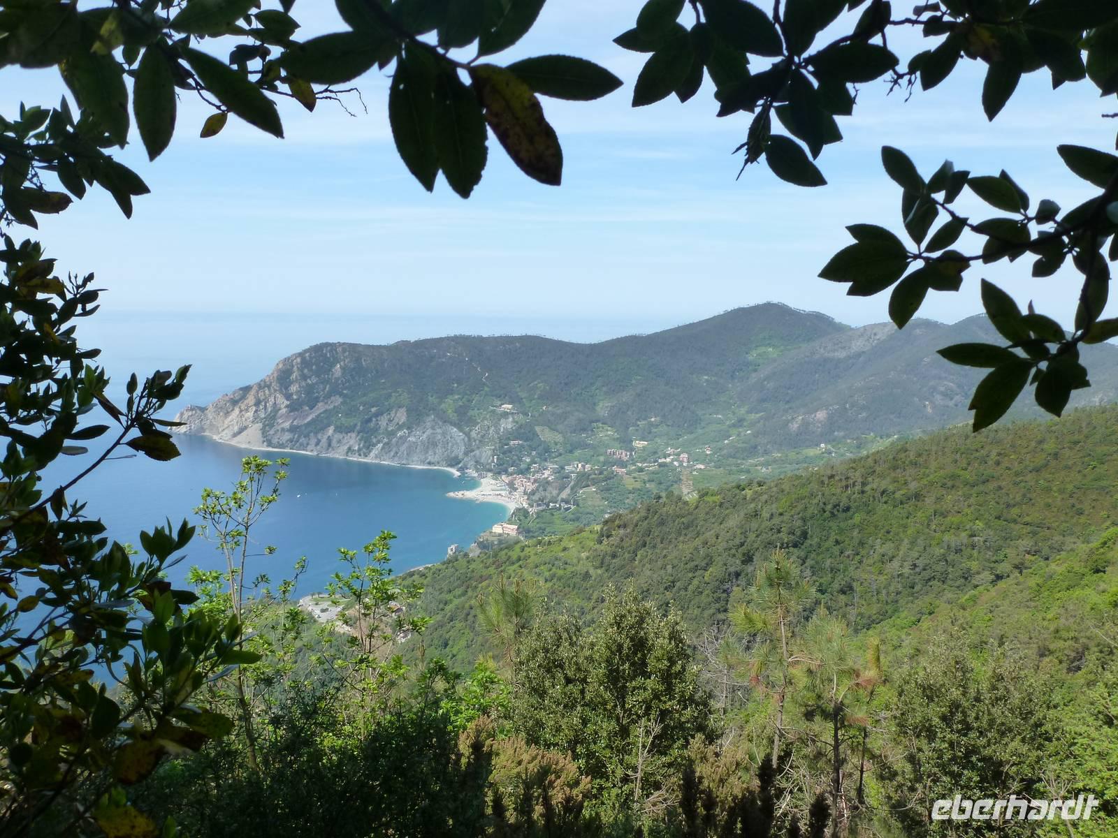 Hier beginnt schließlich der Wanderweg nach Monterosso. Über Stufen und einen gut ausgebauten Weg bahnen wir uns den Weg nach oben. Die Vegetation ist äußerst abwechslungsreich: Baumheide, Erdbeerbäume, Feigenbäume, Lorbeer, Terpetinpistazie und vieles mehr entdecken wir. Der weitere Weg führt durch alten Steineichenwald bis wir schließlich hoch über dem Meer entlang laufen mit einem wunderbaren Blick auf die Küste! Wir genießen die wärmenden Sonnenstrahlen und wandern weiter zur Ruine Sant'Antonio. Damit ist der höchste Punkt unserer Tour erreicht: Punta Mesco 319 m. Ein Gläschen vino della casa tut allen Gästen gut.