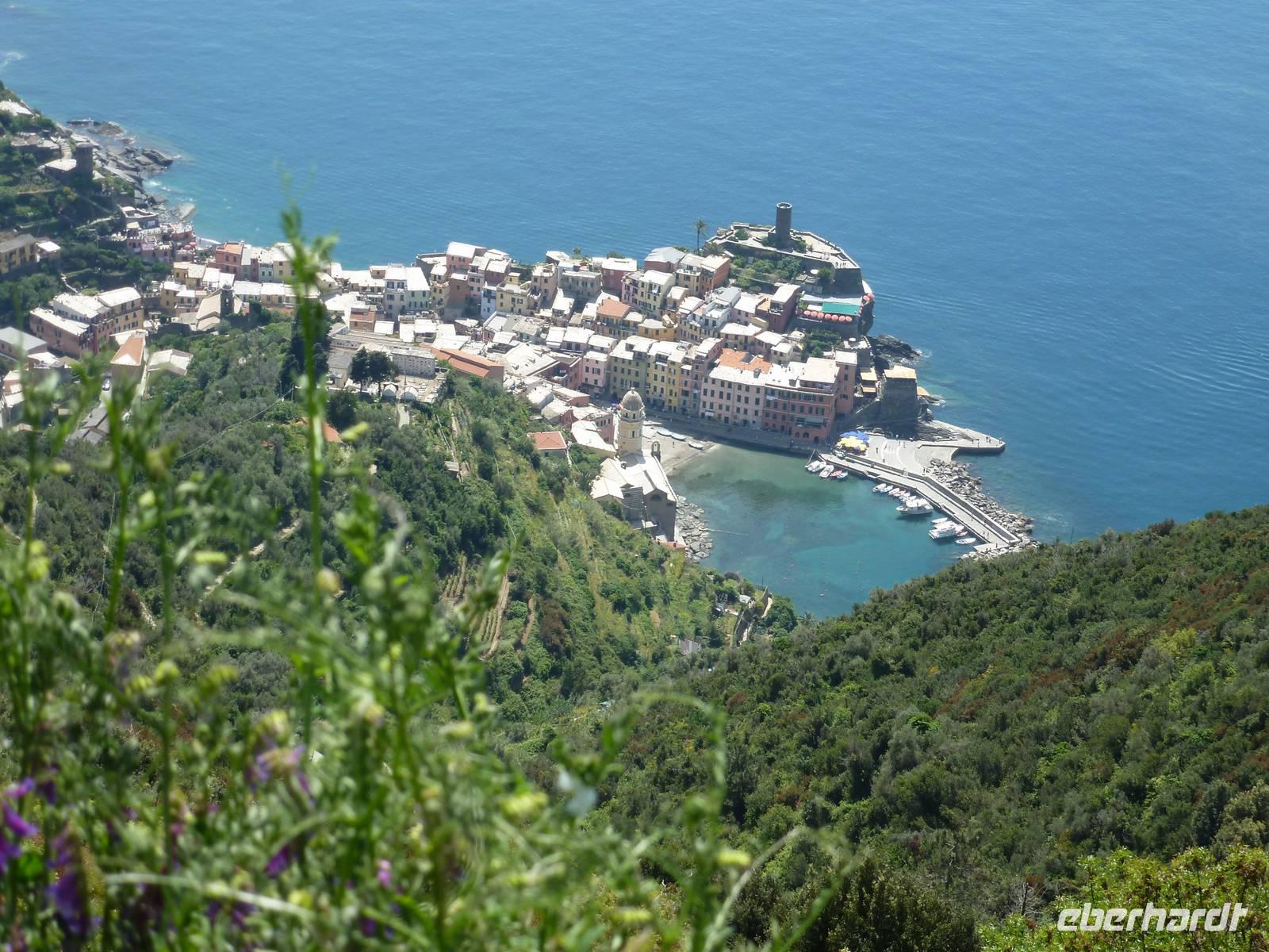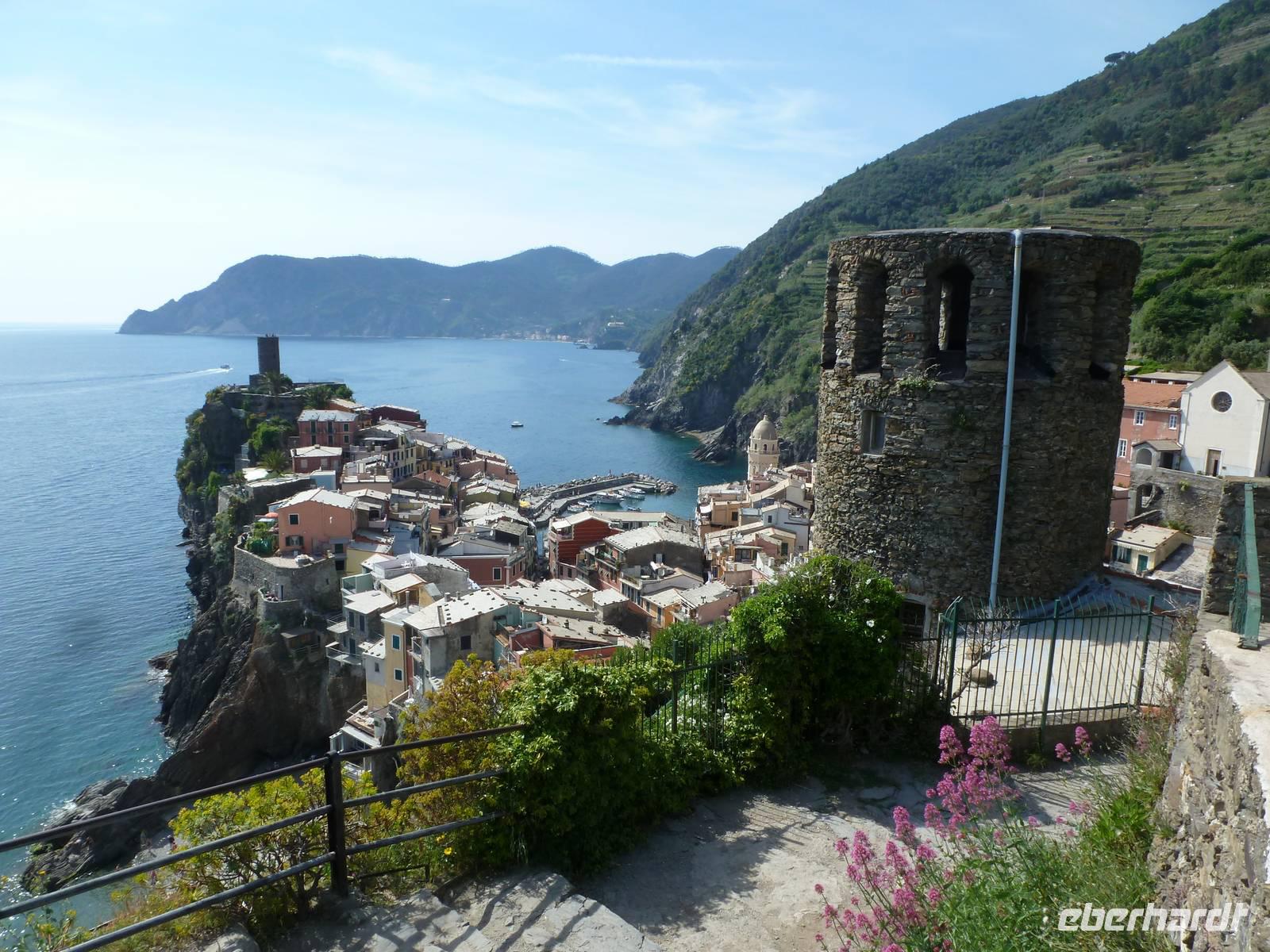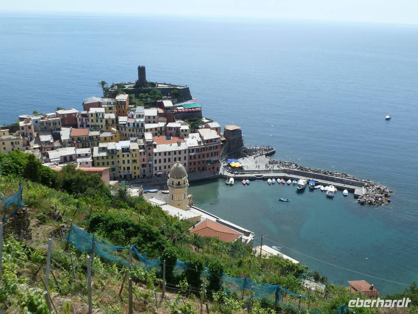 Endlich Vernazza, ganz malerisch liegen die farbenfrohen Häuser in der Bucht und am Hang, die Fischerboote liegen auf der Piazza im Trockenen. Das Castello thront über dem Städtchen - ein Anblick wie aus einem Bilderbuch entsprungen. Die Turmbesteigung bildet den Höhepunkt des heutigen Tages, da der Ausblick gigantisch ist.