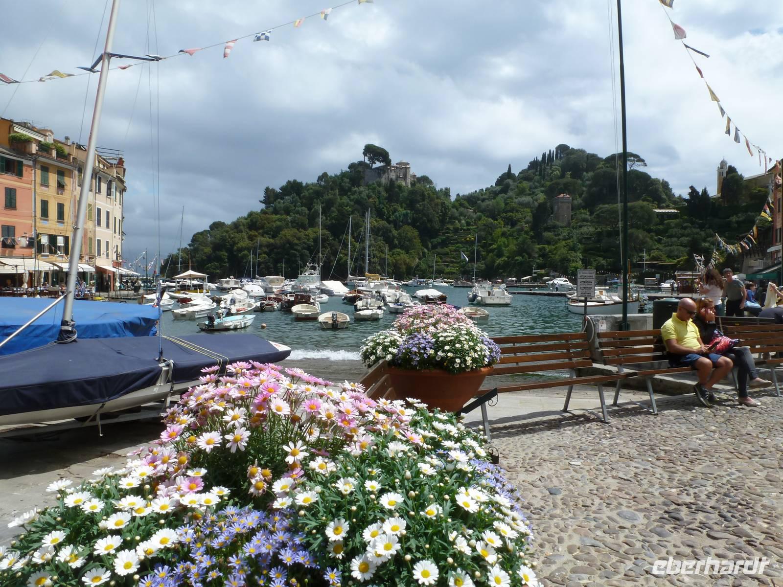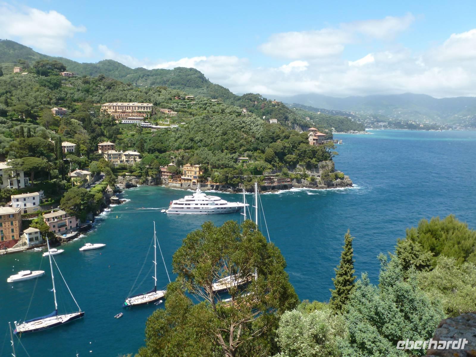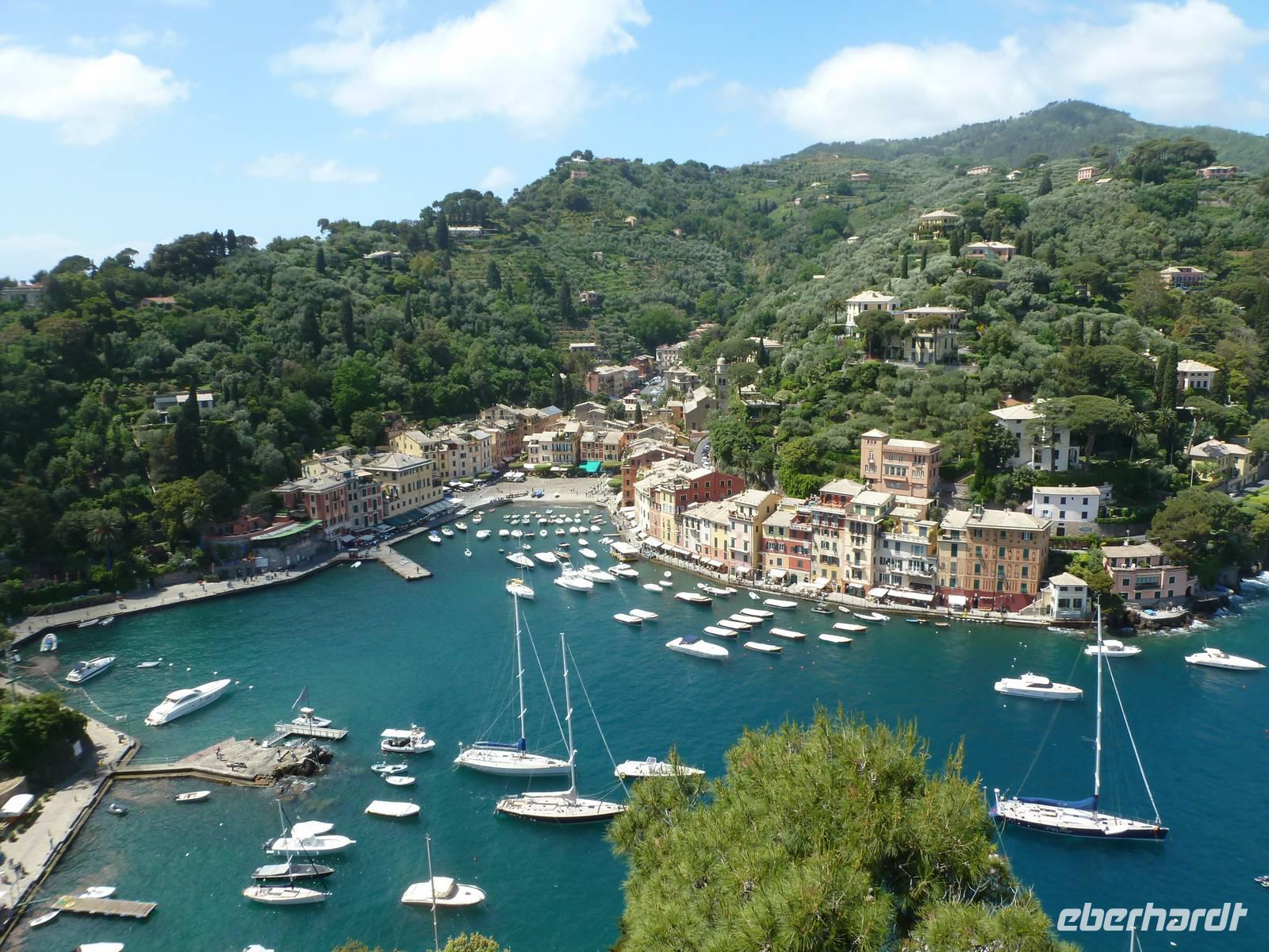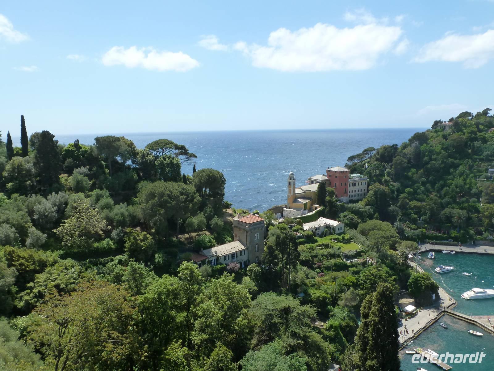 Die Columbusstatue an der Promenade weist uns den Weg und wir spazieren durch einen liebevoll angelegten Park zum Palazzo Durazzo - ein Ensemble von stilvollen Villen mit einem zauberhaften Blick auf den Ort und die weite Bucht. Der prunkvollen Barock - Kirche statten wir einen Besuch ab. Etwas aktiv wollen wir schließlich auch am Genießertag sein und wandern am Meer entlang nach Paraggi. In den Hügeln mit den gepflegten Gärten strahlt eine Villa schöner als die Andere. Zur Cappuccino Pause kehren wir in ein hübsches Strandrestaurant in Paraggi ein und sind somit gestärkt für den weiteren Weg nach Portofino. Weit auf dem Meer erblicken wir zahlreiche Segelboote. Der mondäne Ort Portofino liegt uns zu Füßen, die Häuser schmiegen sich eng an die Marina und viele Restaurants laden zum wohl teuersten Kaffee der Reise ein. Im Hafen von Portofino liegen neben zahlreichen kleinen Booten und Yachten auch kleine Fischerboote. Wir wollen hoch hinaus und spazieren durch die engen Gassen der Stadt zur kleinen Kirche und schließlich zum Castello Brown. Allein schon der Ausblick auf die gesamte Hafenbucht von Portofino ist ein Erlebnis. Die Ausstellung im Castello Braun zeigt berühmte Persönlichkeiten von Film, TV und Politik, die Anfang des 19.Jh. zu Gast in Portofino waren.