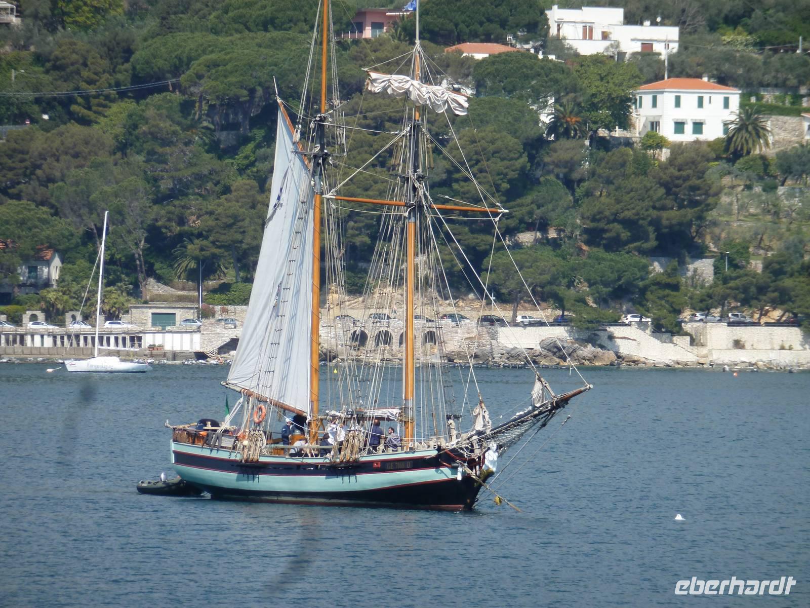 Anschließend unternahmen wir einen Stadtrundgang, beginnend an der Baia delle Favole „Märchenbucht". Dort sahen wir ein altes Segelschiff am Fischerstrand, mit dem Anfang des 19. Jh. der abgebaute Schiefer per Schiff bis nach Sardinien transportiert wurde. Damals war der Schiefer ein wichtiges Exportgut. Heute ist es der Tourismus, der die Region belebt.