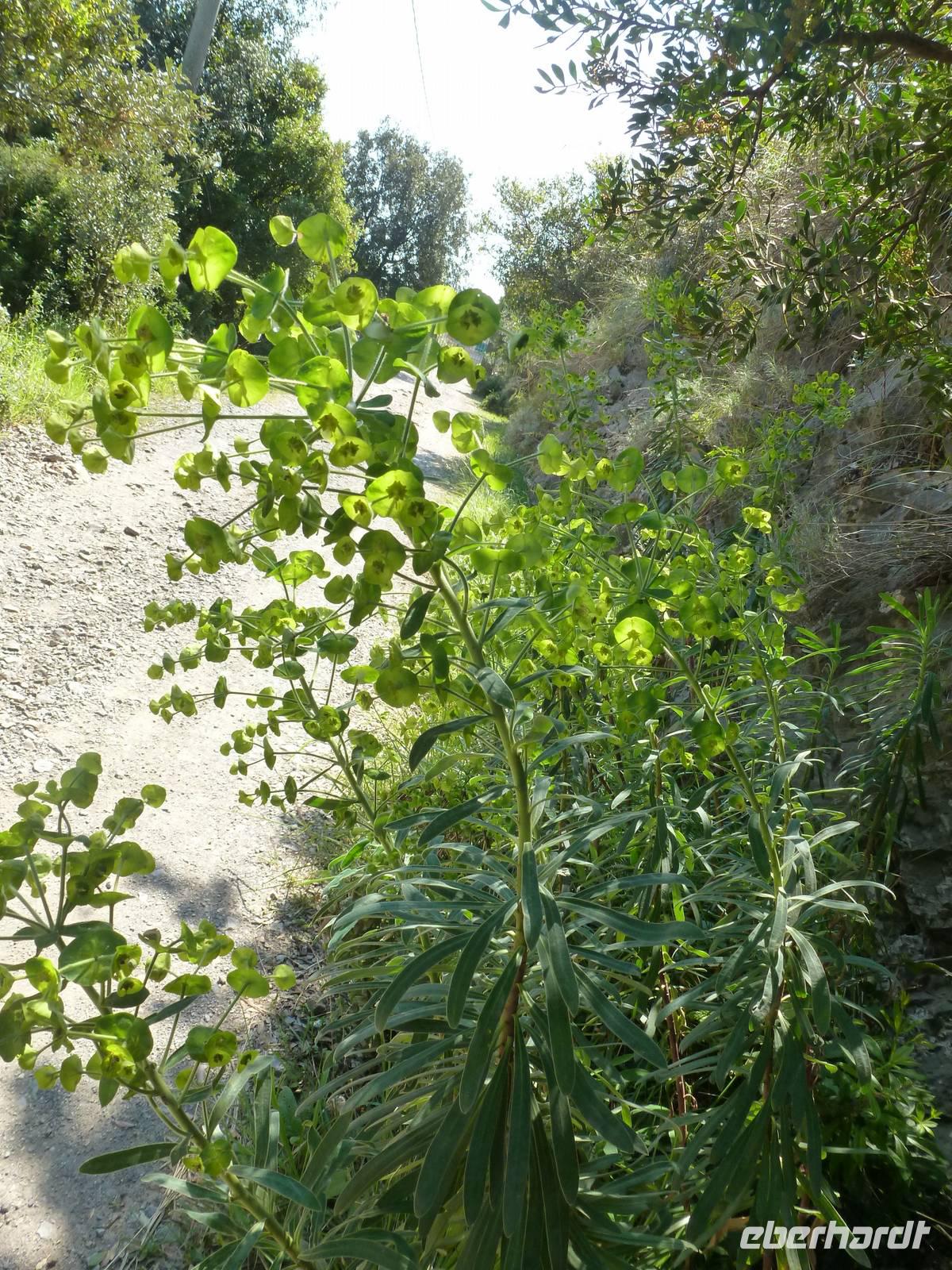 Von Vernazza nach Corniglia sind ca. 200 Höhenmeter zu überwinden, wobei sich der Wanderweg an unzähligen Trockenmauern entlang schlängelt. Der gut markierte Weg ist gesäumt von meterhohen Opuntien, Agaven und alten Olivenbäumen. Das schwarz-graue Schiefergestein gibt einen schönen Kontrast zu dem farbenfrohen und satten Grün der Pflanzen. Wir passieren die typischen Trockenmauern - insgesamt sollen sie etwa 8.000 km Länge haben! Die farbwechselnden Rebstöcke auf den mühevoll angelegten Terrassen sind unsere ständigen Begleiter. Viele Zitronenbäume warten noch auf die Ernte.