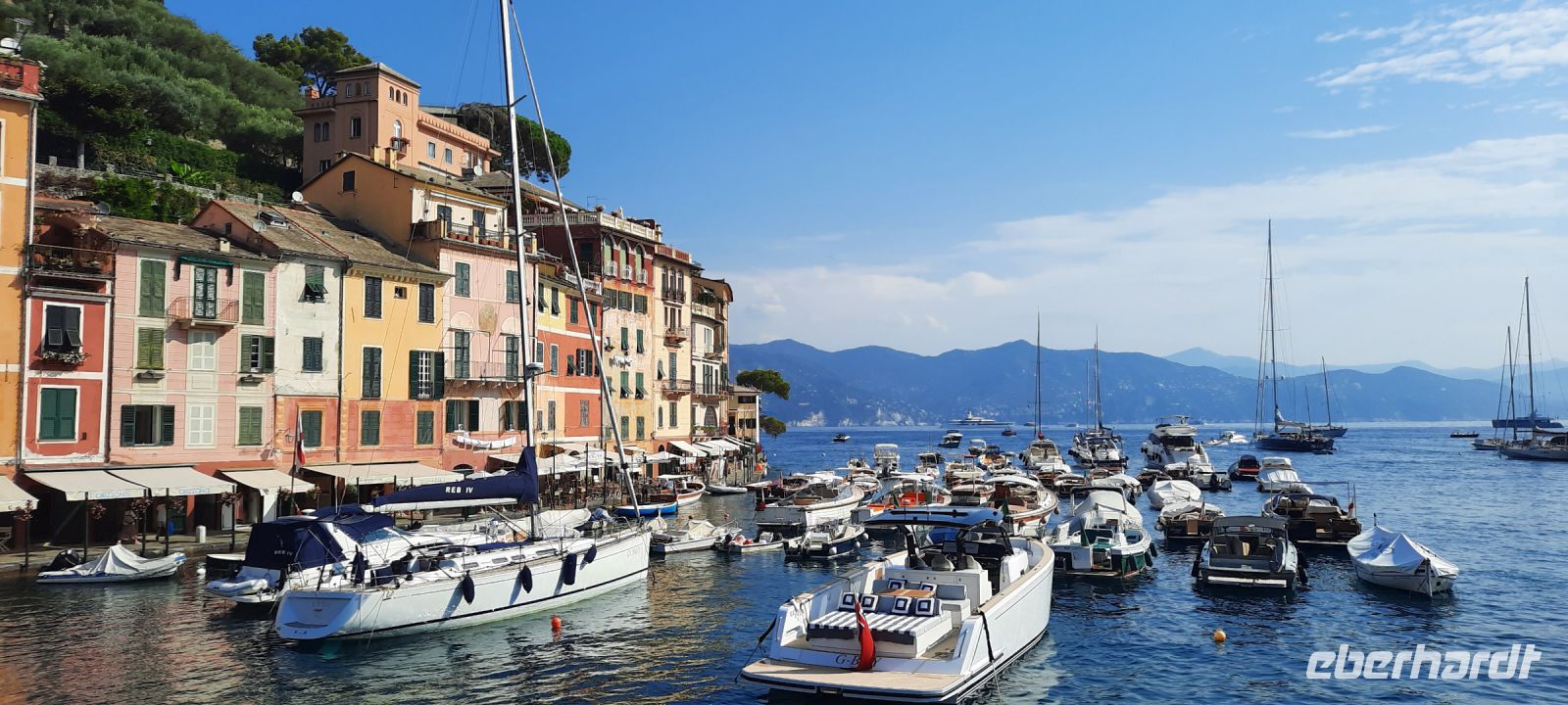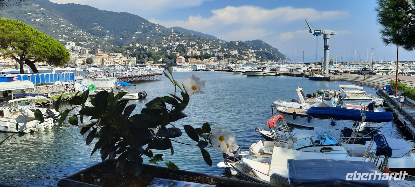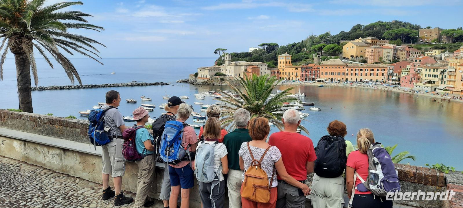 Unser letzter Tag führte uns mit dem Zug in Richtung Genua. In Santa Margherita angekommen bestaunten wir die herrliche Strandpromenade mit ihren herrschaftlichen Häusern aus dem 17./18. Jahrhundert. Geschichtlich ist dieser Ort von großer Bedeutung, denn hier wurde im Hotel „Imperial" der „Vertrag von Rapallo" 1922 unterzeichnet. Damals gehörte Santa Margherita noch zu Rapallo. Die Columbus Statur an der Promenade weist uns den Weg zur Fähre, die uns nach San Fruttuoso brachte. Der Klosterkomplex in San Fruttuoso entstand im frühen 10. Jahrhundert und war Stammsitz der Familie Doria. Es führt keine Straße dort entlang. Lediglich die Fähren oder der Wanderweg des Monte di Portofino ermöglichen der Benediktinerabtei einen Zugang. Nach einem Rundgang durch die Abtei schenkten wir unsere Aufmerksamkeit nur noch dem stetig steigenden Wanderweg des Monte di Portofino. Eingebettet in den Golfo Paradiso blickten wir von oben auf den gewaltigen Klosterkomplex. Fast immer im Schatten schlängelten wir uns Meter um Meter hinauf im National Park von Portofino. Die herrliche Vegetation mit ihren unzähligen Grüntönen tat Geist und Seele richtig gut. An einer schönen Picknickstelle war die Anstrengung schnell verflogen und wir setzten unseren Weg in Richtung Portofino fort. Später lag uns der mondäne Ort zu Füßen, die Häuser schmiegten sich eng an die Marina und viele Restaurants luden zum wohl teuersten Cappuccino der Reise ein. Im Hafen von Portofino liegen neben zahlreichen Booten und Yachten auch kleine Fischerboote. Allein schon der Ausblick auf die gesamte Hafenbucht von Portofino ist ein Erlebnis. Im Anschluss fuhren wir per Schiff nach Santa Margherita und von dort weiter nach Rapallo. Wir passieren die herrliche breite Strandpromenade von Rapallo und unser Weg führt wie immer zum Bahnhof. Mit Sonnenstrahlen und blauem Himmel neigt sich unser herrlicher Genießertag dem Ende entgegen. Der Arrivederci Vino in der Märchenbucht Bucht bildete den Abschluss einer wunderschönen Wanderwoche. Die Wanderdiplome wurden verteilt und es blieb noch Zeit, die pulsierende Fußgängerzone zu durchstreifen. Die Lichter spiegelten sich sanft in der Bucht und die Boote schmiegten sich im Rausch der Wellen.