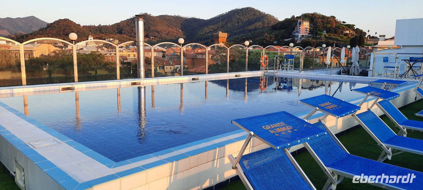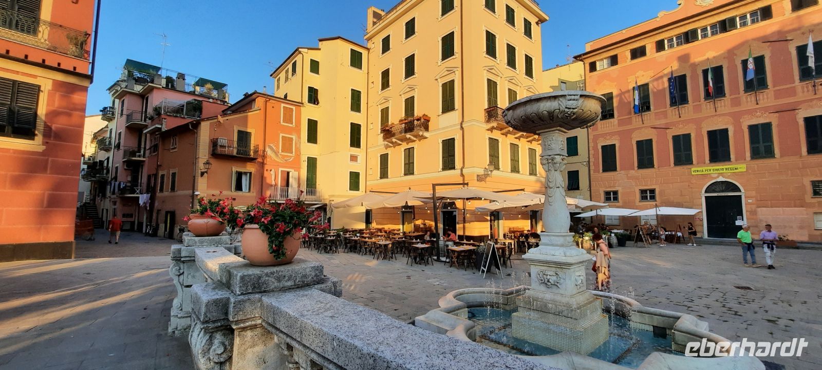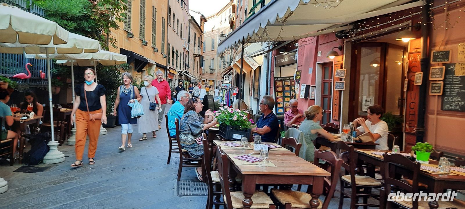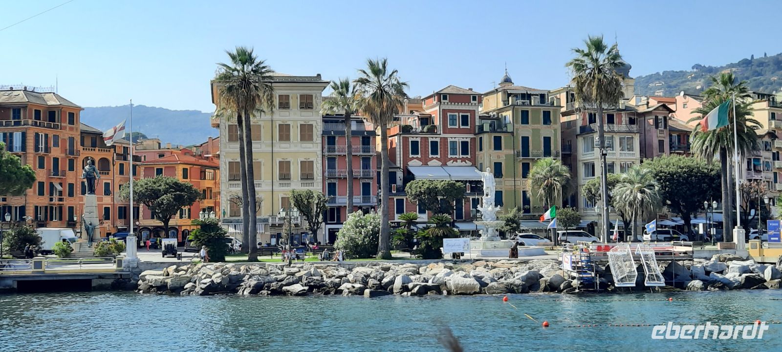 Mit LH starteten wir in Dresden und landeten pünktlich in Frankfurt. Dort sammelte sich unsere Gruppe und gemeinsam flogen wir nach Genua. Italien begrüßt uns mit Sonnenschein und so streiften unsere Blicke die Küste von Portofino, bevor der Landeanflug auf den Airport Genua begann. Auf der Fahrt nach Sestri Levante konnten wir schon einen ersten Eindruck von der malerischen Landschaft bekommen: die Städte und Dörfer Liguriens machen Lust auf mehr... Wie sich die Dörfchen in die Landschaft einpassen und harmonisch verschmelzen, das wollten wir uns genauer ansehen. Unser Hotel „Grande Albergo" lag direkt an der Märchenbucht. Den Nachmittag nutzten wir für einen Spaziergang an der Strandpromenade und ein erstes italienisches Eis zu genießen. Die Fußgängerzone war gesäumt von prächtigen Palästen, z.B. die „Villa Balbi", das Rathaus auf dem Platz „Matteotti" und das Gebäude von Don Luigi (Restaurant), um nur einige zu nennen.