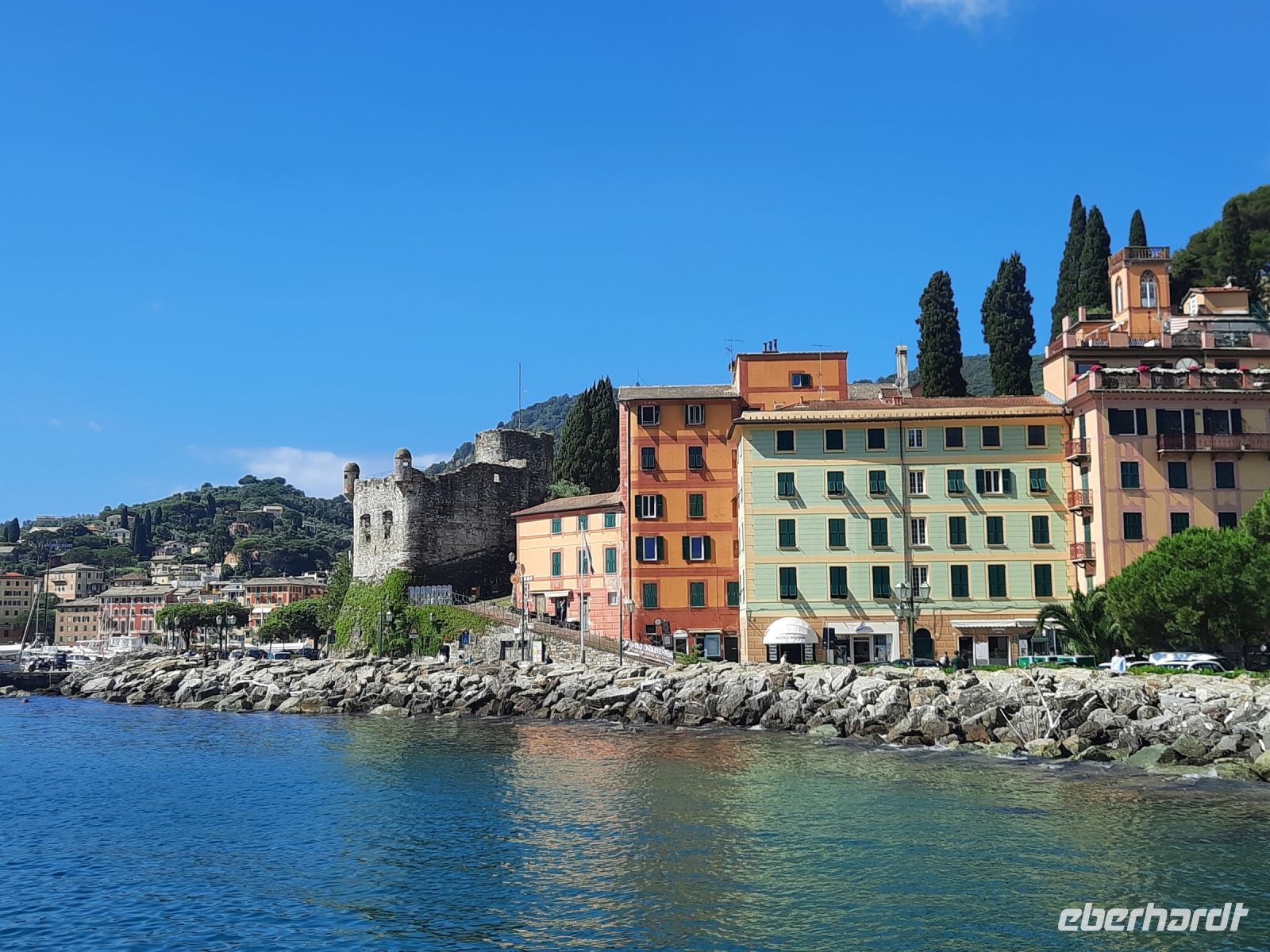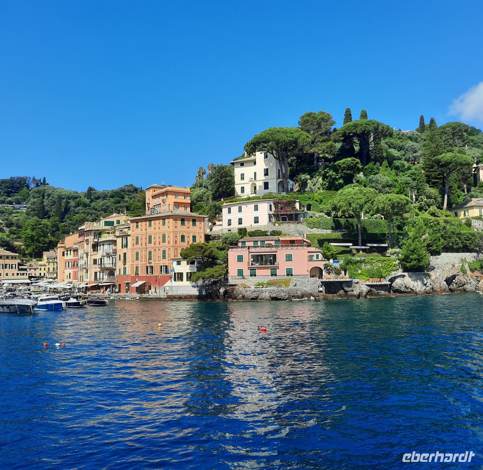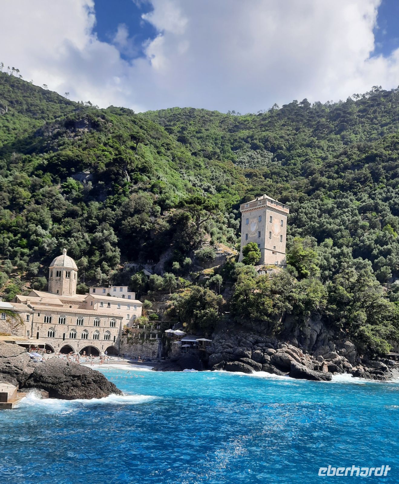 Unser letzter Tag führte uns mit dem Zug in Richtung Genua. In Santa Margherita angekommen bestaunten wir die herrliche Strandpromenade mit ihren herrschaftlichen Häusern aus dem 17./18. Jahrhundert. Geschichtlich ist dieser Ort von großer Bedeutung, denn hier wurde im Hotel „Imperial" der „Vertrag von Rapallo" 1922 unterzeichnet. Damals gehörte Santa Margherita noch zu Rapallo. Die Columbus Statur an der Promenade weist uns den Weg zur Fähre, die uns nach San Fruttuoso brachte. Der Klosterkomplex in San Fruttuoso entstand im frühen 10. Jahrhundert und war Stammsitz der Familie Doria. Es führt keine Straße dort entlang. Lediglich die Fähren oder der Wanderweg des Monte di Portofino ermöglichen der Benediktinerabtei einen Zugang. Nach einem Rundgang durch die Abtei schenkten wir unsere Aufmerksamkeit nur noch dem stetig steigenden Wanderweg des Monte di Portofino. Eingebettet in den Golfo Paradiso blickten wir von oben auf den gewaltigen Klosterkomplex. Fast immer im Schatten schlängelten wir uns Meter um Meter hinauf im National Park von Portofino. Die herrliche Vegetation mit ihren unzähligen Grüntönen tat Geist und Seele richtig gut. So meisterten wir die 460 Höhenmeter . An einer schönen Picknickstelle war die Anstrengung schnell verflogen und wir setzten unseren Weg in Richtung Portofino fort. Später lag uns der mondäne Ort zu Füßen, die Häuser schmiegten sich eng an die Marina und viele Restaurants luden zum wohl teuersten Cappuccino der Reise ein. Im Hafen von Portofino liegen neben zahlreichen Booten und Yachten auch kleine Fischerboote. Allein schon der Ausblick auf die gesamte Hafenbucht von Portofino ist ein Erlebnis. Es waren einfach nur zu viele Menschen in dieser kleinen Bucht, die wir gar nicht richtig genießen konnten. Im Anschluss fuhren wir per Schiff nach Santa Margherita und von dort weiter nach Rapallo. Wir passieren die herrliche breite Strandpromenade von Rapallo und unser Weg führt wie immer zum Bahnhof. Mit Sonnenstrahlen und blauem Himmel neigt sich unser herrlicher Genießertag dem Ende entgegen.