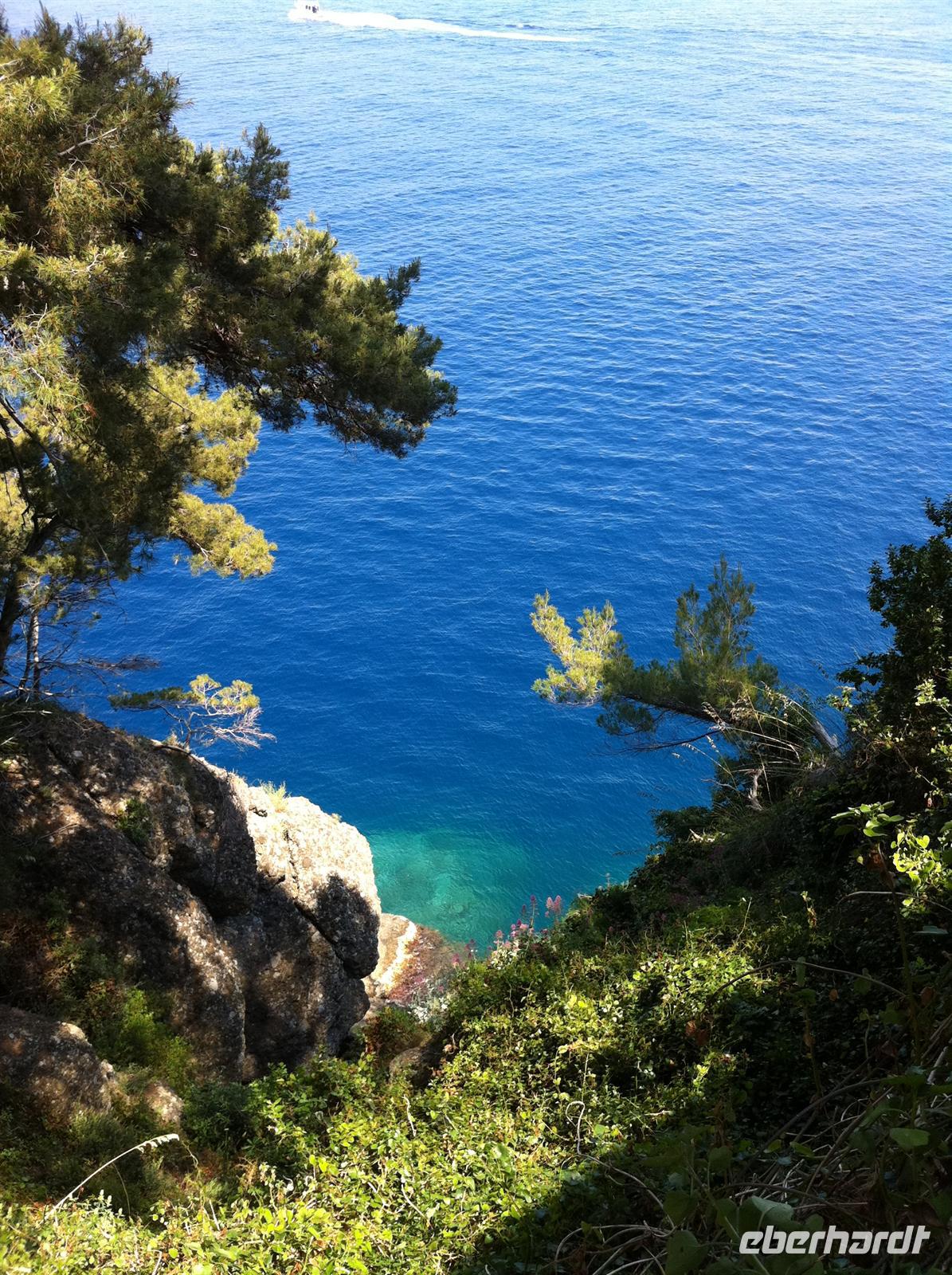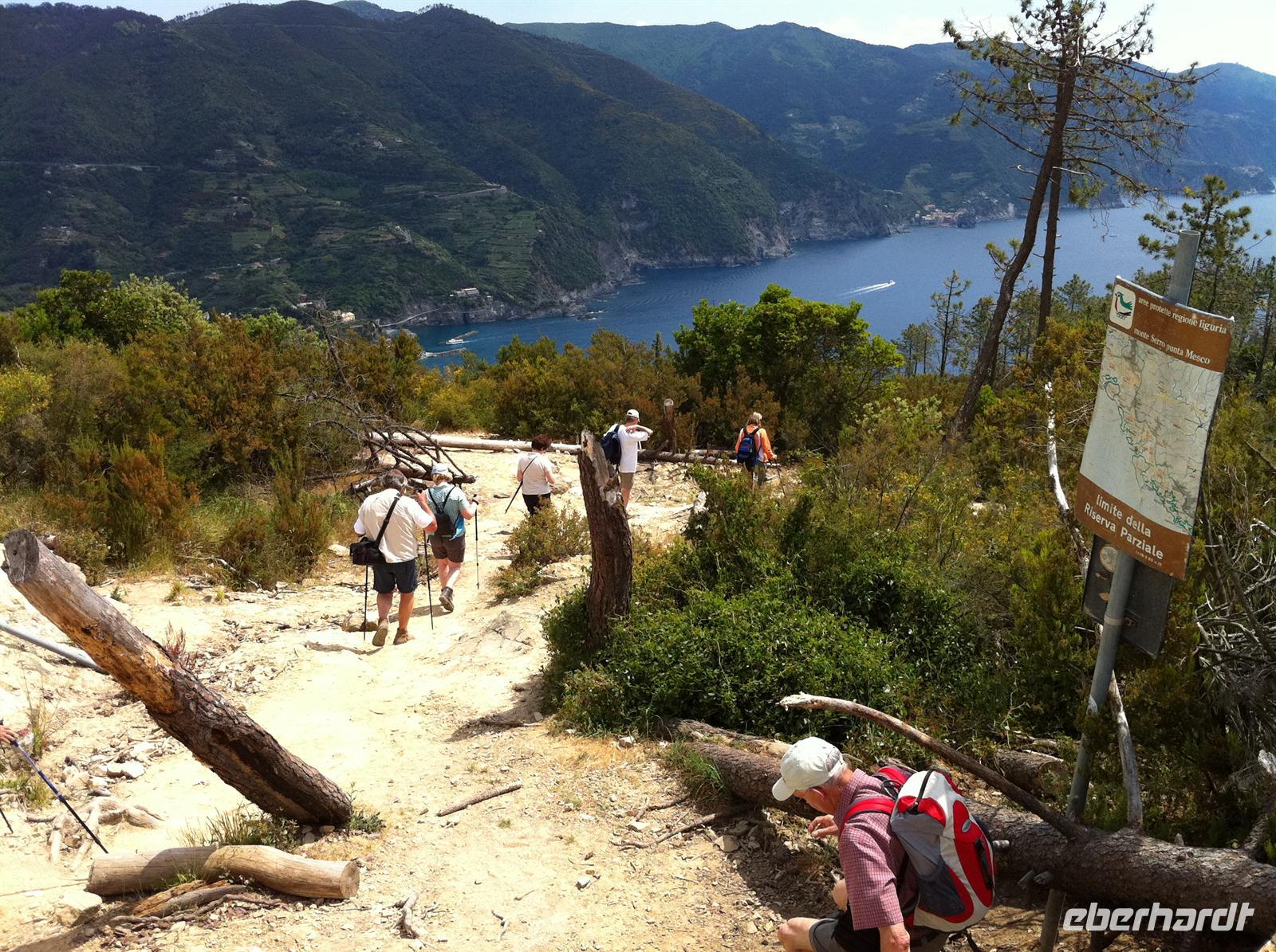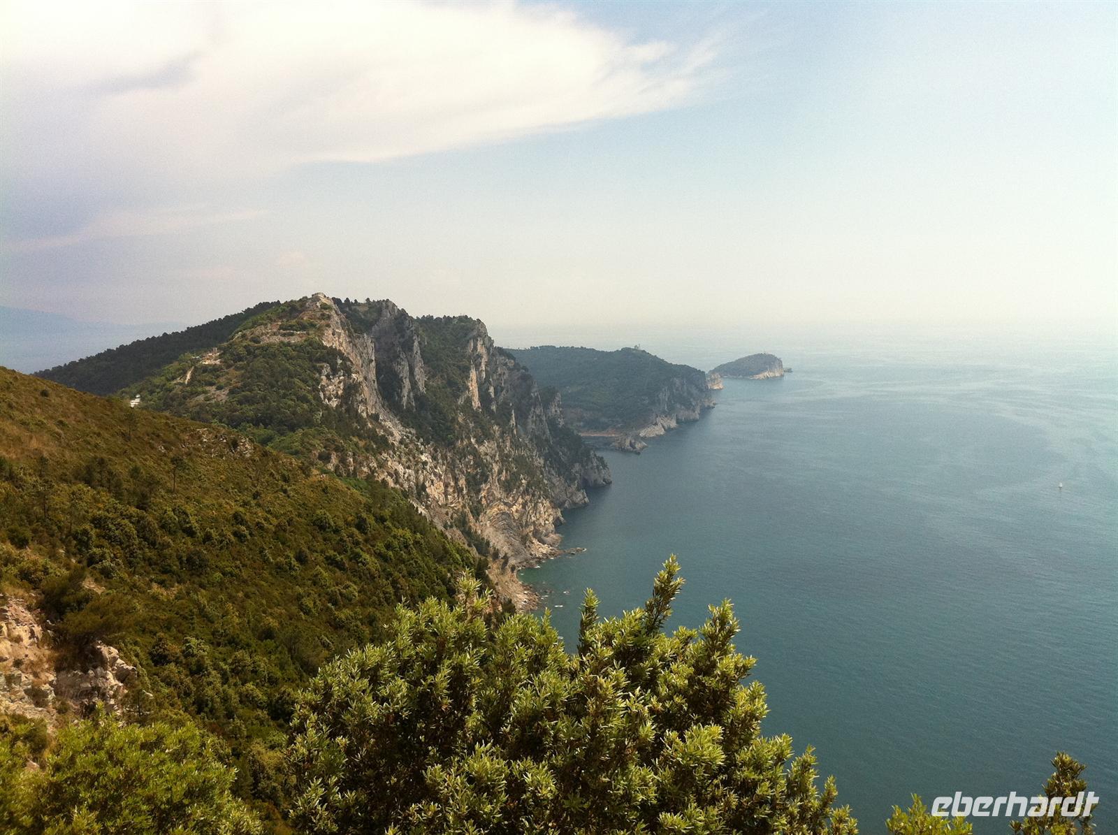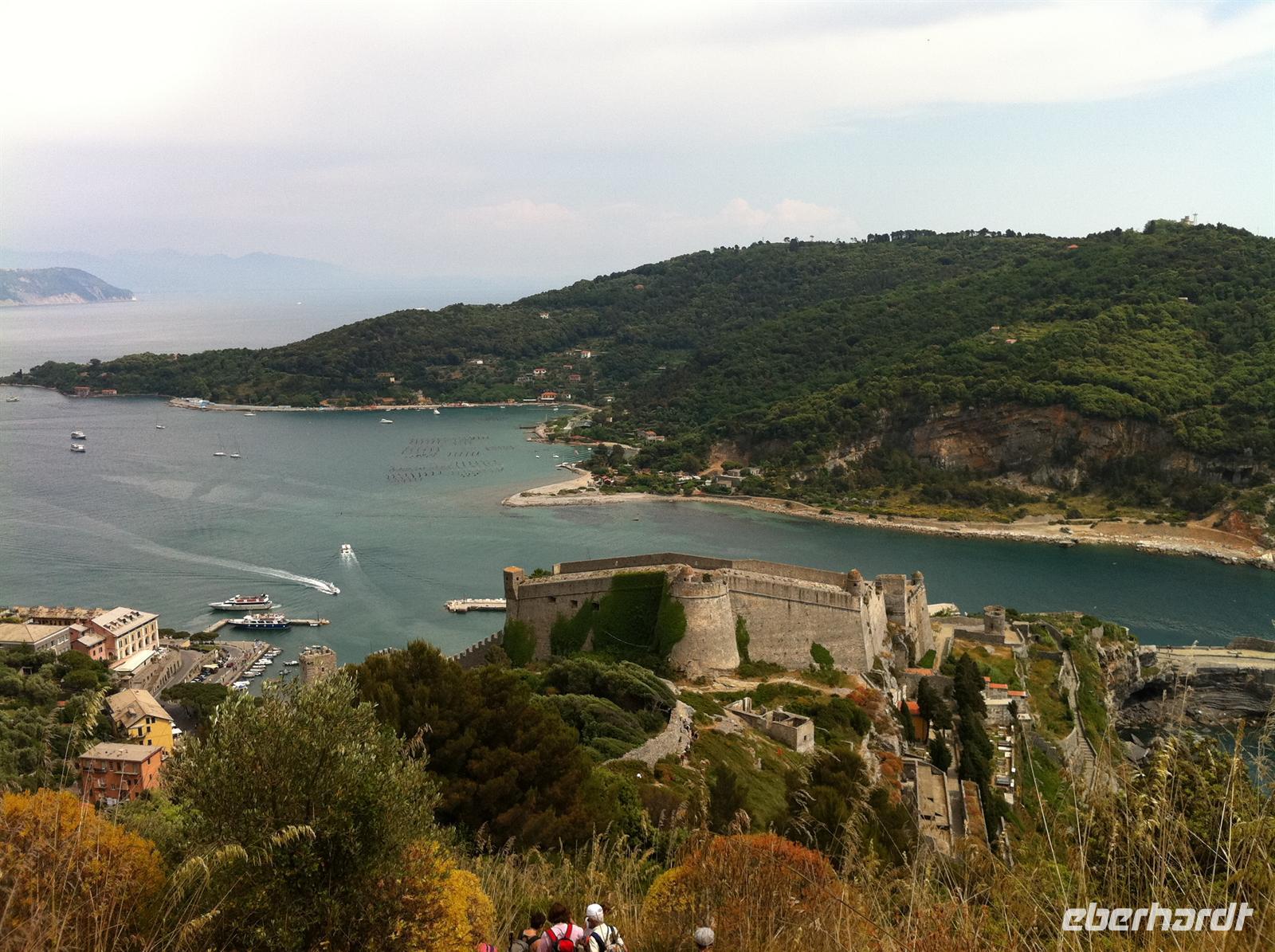 Ab Campiglia beginnt dann der brutale Abstieg. Betina appelliert an unsere Vernunft und unsere Konzentartion. Denn der Wanderweg führt genau entlang der steil abfallenden Küste. Wir werden aber mit atemberaubenden Ausblicken belohnt. Wir sehen La Spezia, die größte Stadt in der Region mit einem großen Hafen.