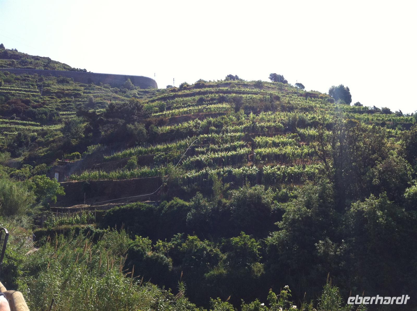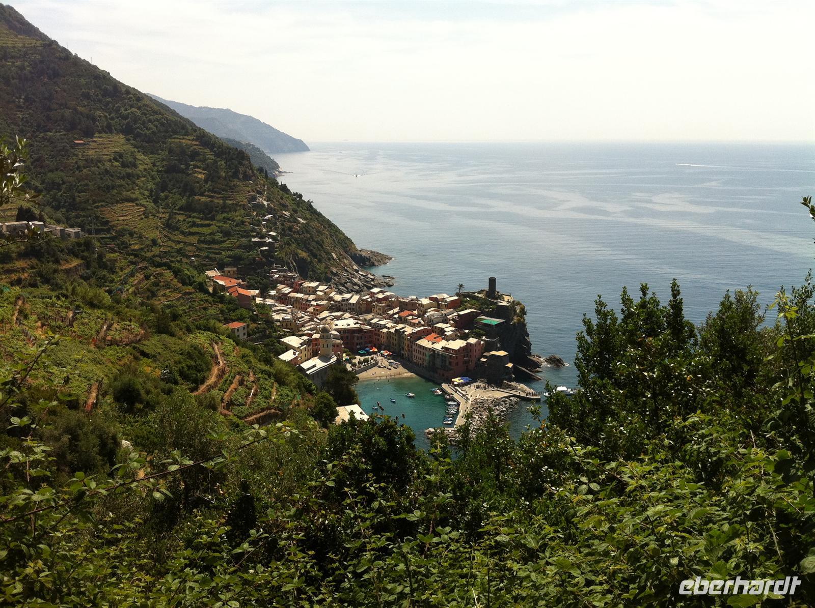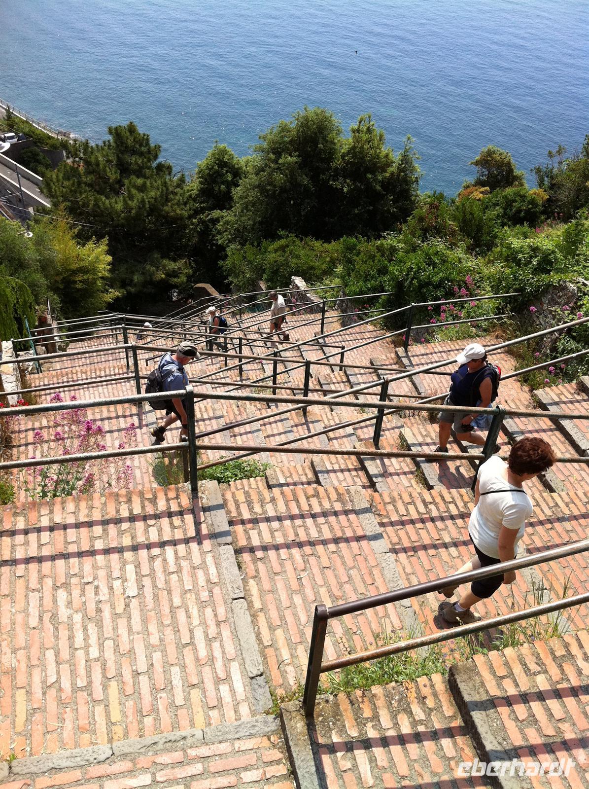 Zugfahren ist bei dieser Reise fester Programmbestandteil. So geht es von Sestri Levante nach Monterosso. Da wir den alten Stadtkern der Stadt am Vortag nicht gesehen haben, laufen wir einmal um den Felsen und erreichen den alten Stadtkern von Monterosso. Heute ist Markt und so haben wir ein wenig Freizeit zum Bummeln. Frisches Obst und Eis ist der Kassenschlager . Anschließend beginnen wir unsere heutige Tageswanderung nach Vernazza. Unzählige Stufen begleiten uns an diesem Tag wieder. Über die typischen Trockenmauern gelangen wir in die Weinberge und Gärten der traditionellen Bauern. Auf unserem Weg haben wir wieder unzählige Rundblicke und grandiose Aussichten. Manchmal ist aber unsere Konzentration gefragt. Denn die schmalen Wanderwege waren heute das erste Mal gut besucht. Nach einer längeren Rast an der Steilküste beginnen wir mit dem angenehmen Abstieg und haben auf unserem Weg schon einen traumhaften Blick auf Vernazza. Kurz vor Vernazza werden wir von Musikanten begrüßt - nur für uns!