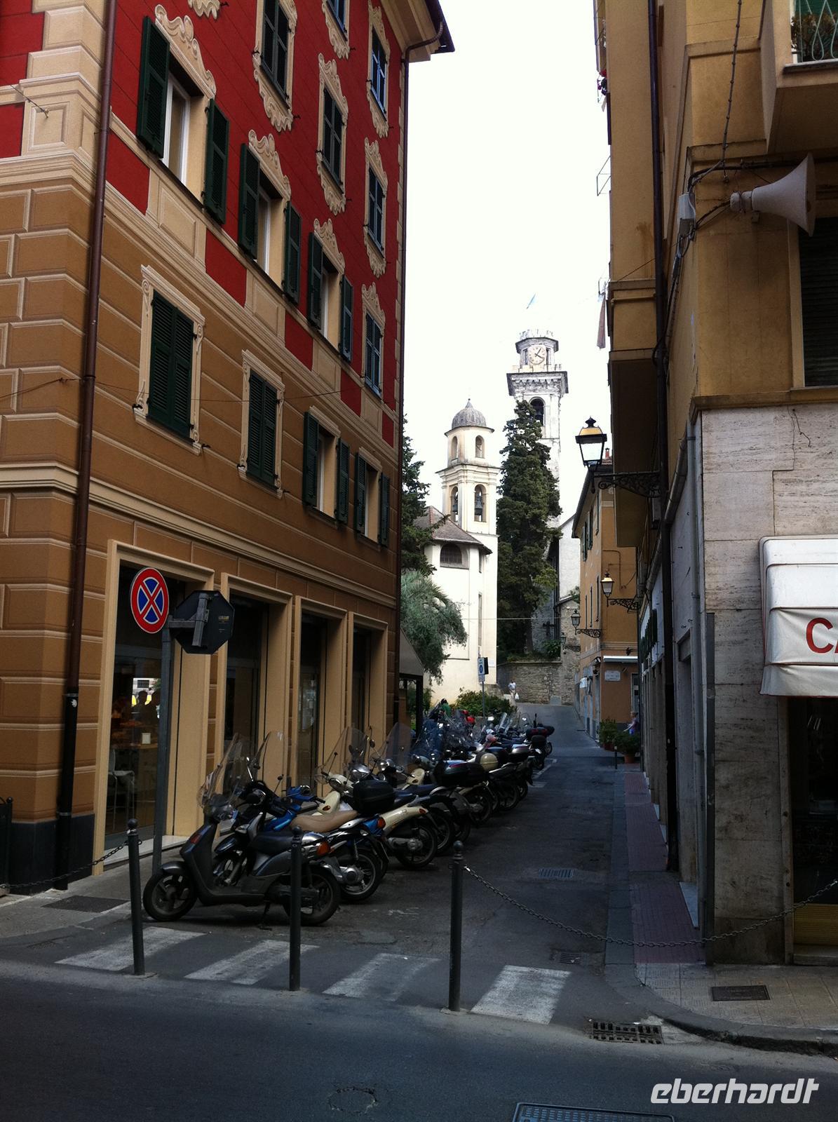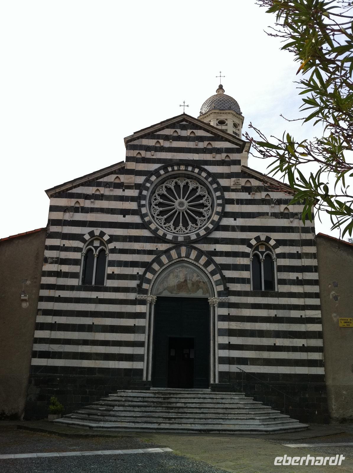 Wir erreichen nun die Pfarrkirche S. Andrea. Die 1226 erbaute und im 15 Jahrhundert erweiterte Kirche ist mit ihrer gestreiften Fassade aus weißem Marmor und grünem Serpentin ein gutes Beispiel der ligurischen Gotik.