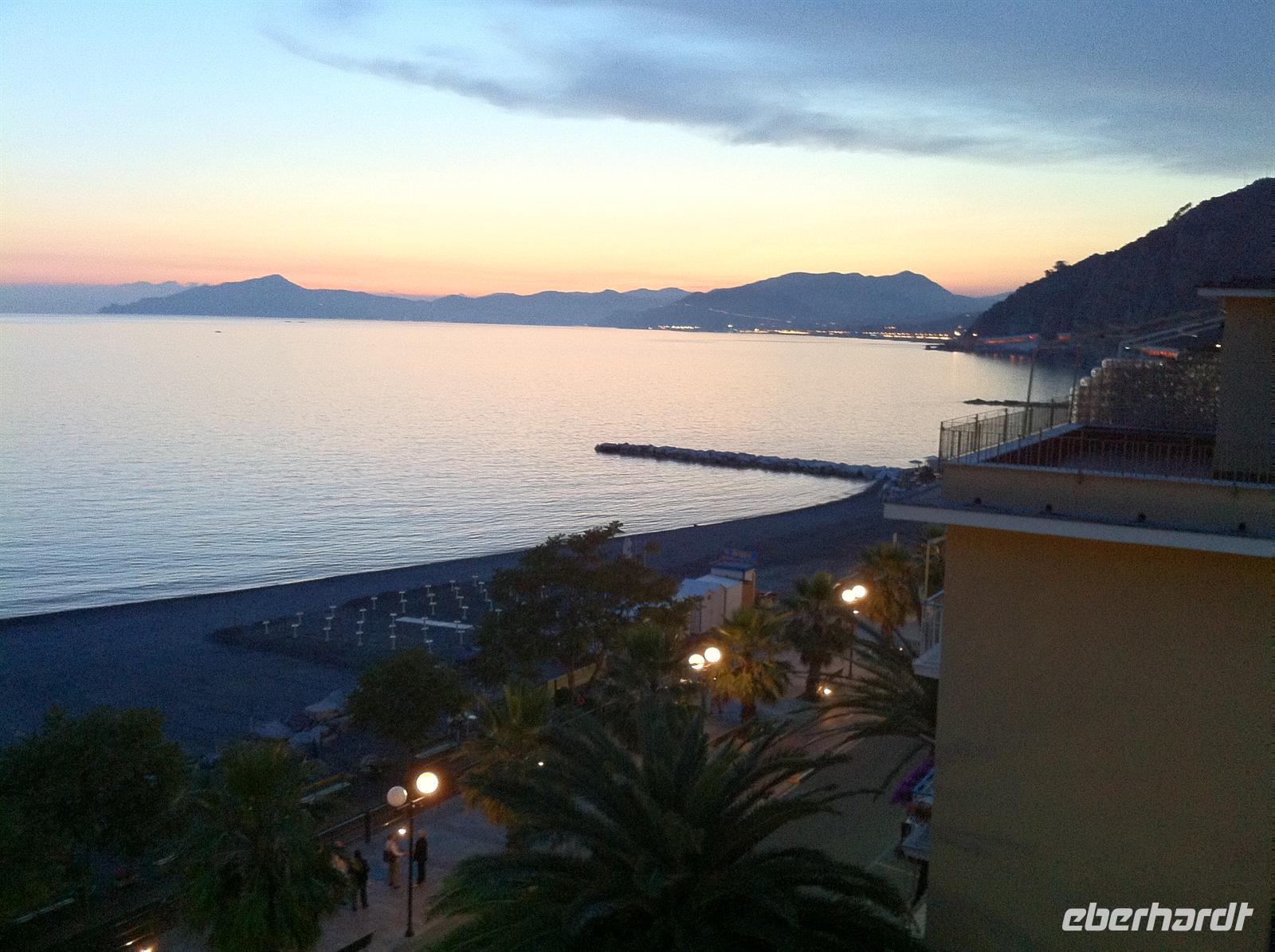 Mit Verspätung fliegen wir in Richtung Süden und landen gegen 21:15 Uhr auf dem internationalen Flughafen „Galilei“ in Pisa. Der Transferbus steht bereit und wir fahren auf direktem Wege in unser Hotel „Celeste“ in Sestri Levante. Franco, der Hoteldirektor, empfängt uns sehr herzlich. Nach dem Zimmerbezug treffen wir uns noch einmal im Hotelrestaurant und lassen uns einen Snack mit Gemüse, Käse, Mozarella und Brot schmecken. Sogar einen Grappa hat Franco für uns parat.