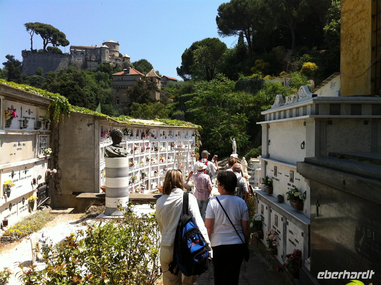Mit der Zugfahrt um 9 Uhr morgens wird leider nichts, da sich die TrenItalia überlegt hat, heute zu streiken. Betina wirbelt ein wenig und bucht schließlich den IC von Sestri Levante nach Rapallo. Dort angekommen, laufen wir gemeinsam zum Meer und steigen auf das Boot nach Portofino. Wir erleben eine wunderschöne Bootsfahrt und sehen die Orte der Reichen und Schönen von der Meerseite aus. Vorbei an Santa Margherita erreichen wir Portofino. Zunächst machen wir einen Spaziergang zum Castello Brown. Auf unserem Weg besichtigen wir die Kirche und den wunderschön angelegten Friedhof des noblen Ortes. Vom Castello Brown haben wir einen atemberaubend schönen Blick auf ganz Portofino, den Yachthafen und auf das offene Meer. Unser Endpunkt ist der Leuchtturm El Faro. Dort gönnen wir uns erst einmal einen erfrischenden Drink. Nach der Freizeit in Portofino fahren wir mit dem Schiff zurück nach Rapallo. Hier haben wir lediglich die schöne Kirche besichtigt und die Freizeit etwas verkürzt, da am Sonntag auch hier die Geschäfte geschlossen haben.
