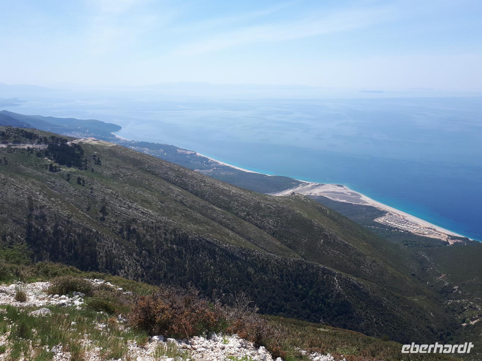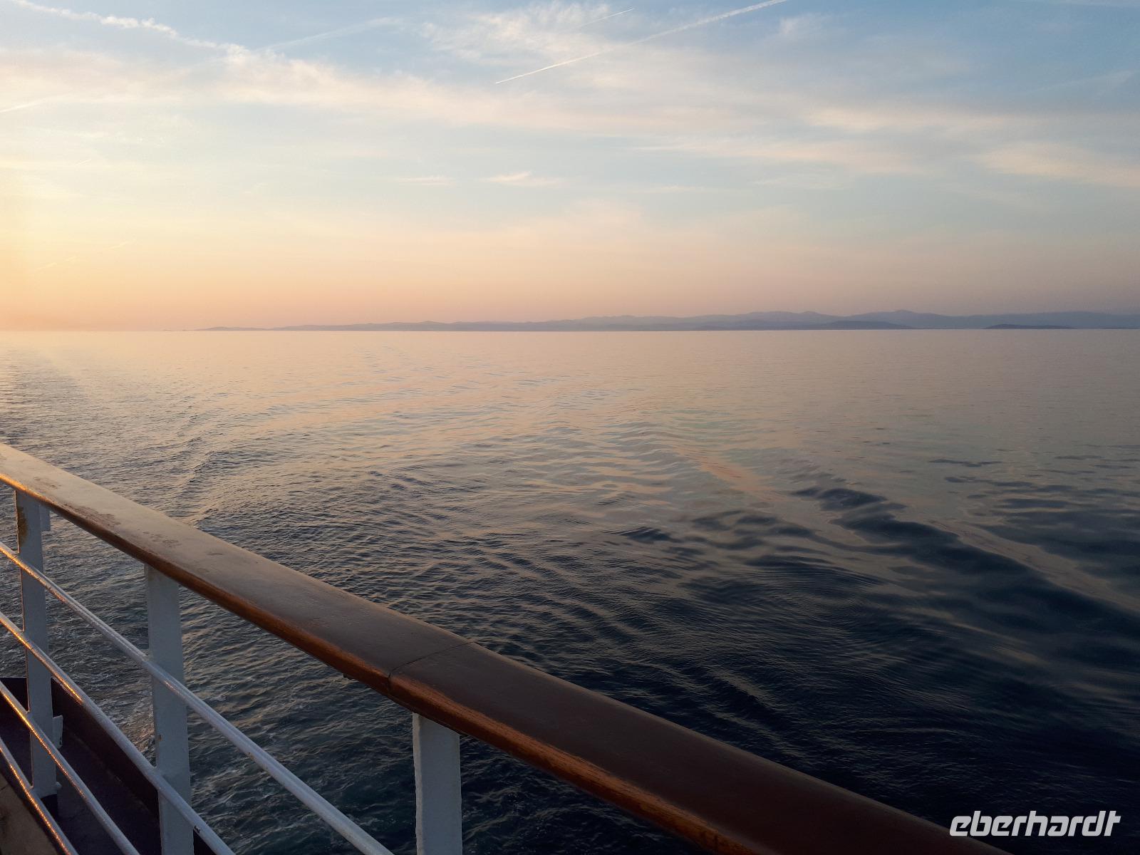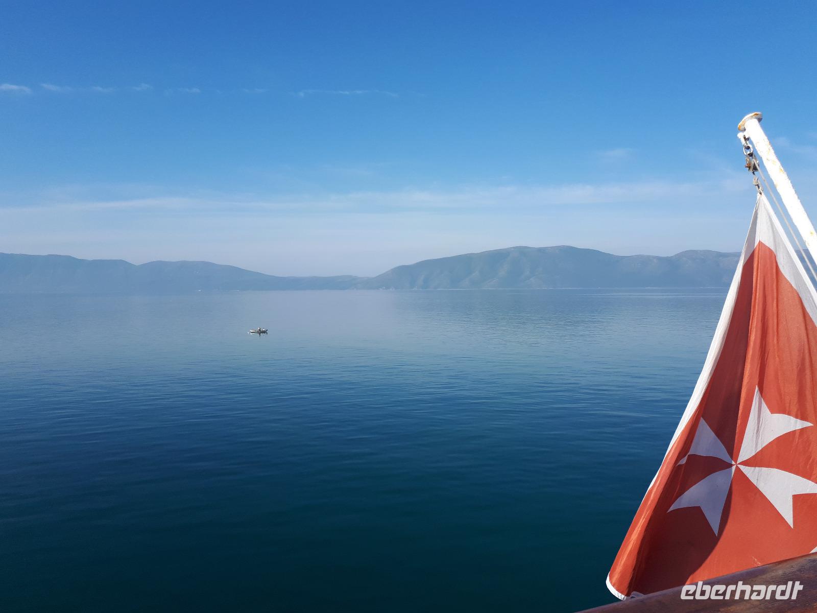Wieder erwartete uns heute perfektes Wetter für unsere Eberhardt-Inklusiv-Wanderung im Llogara-Nationalpark. Unser Bus holte uns pünktlich vom Schiff ab und fuhr zuerst entlang der kurvenreichen Küste. Jürgen erzählte uns die ersten Infos über Albanien und den 1966 gegründeten Nationalpark. Unterwegs erlebten wir mitten in den kurvenreichen Serpentinenstraßen im Gebirge einen Stau und die albanische Art, damit umzugehen. Überall stiegen die Leute aus dem Auto, Musik wurde angeschaltet und die Situation glich eher einem kleinen spontanen Volksfest als einem Verkehrsstau. Schließlich konnten wir weiter fahren und wir kamen gut im Nationalpark an. Dort starteten wir die Wanderung mit fantastischen Ausblicken auf das blaue Meer und die Bergwälder des Nationalparks, die vor allem aus Pinien und Sträuchern, aber auch aus Kiefern, Tannen und Eschen bestehen. Bei einer Picknickpause entspannten wir in den schattigen Plätzen, schauten uns die beeindruckende Gegend ein und einige Wanderer ließen es sich nicht nehmen, noch ein kleines Stückchen hoher zu wandern. Mit einer kleinen Sporteinlage und Konzentrationsübungen bereitete uns Jürgen und Maria auf den Rückweg vor. Belustigt liefen wir wieder zum Ausgangspunkt zurück und kehrten in einem kleinen Restaurant auf der Terrasse ein. Kurzerhand stellten wir eine Tafel zusammen, probierten albanisches Bier bei einer atemberaubenden Aussicht auf die Bucht und den Nationalpark. Wieder an Bord bereiteten wir uns auf den Black & White-Abend vor, freuten uns auf den kommenden Seetag und schwangen am Abend das Tanzbein auf dem Veranda-Deck.