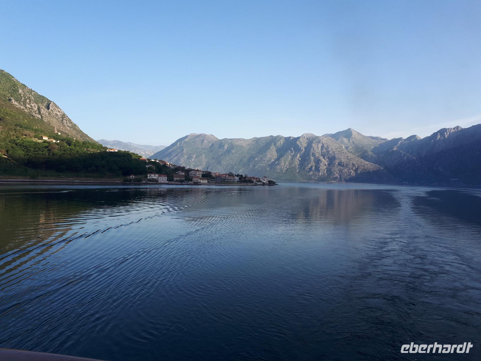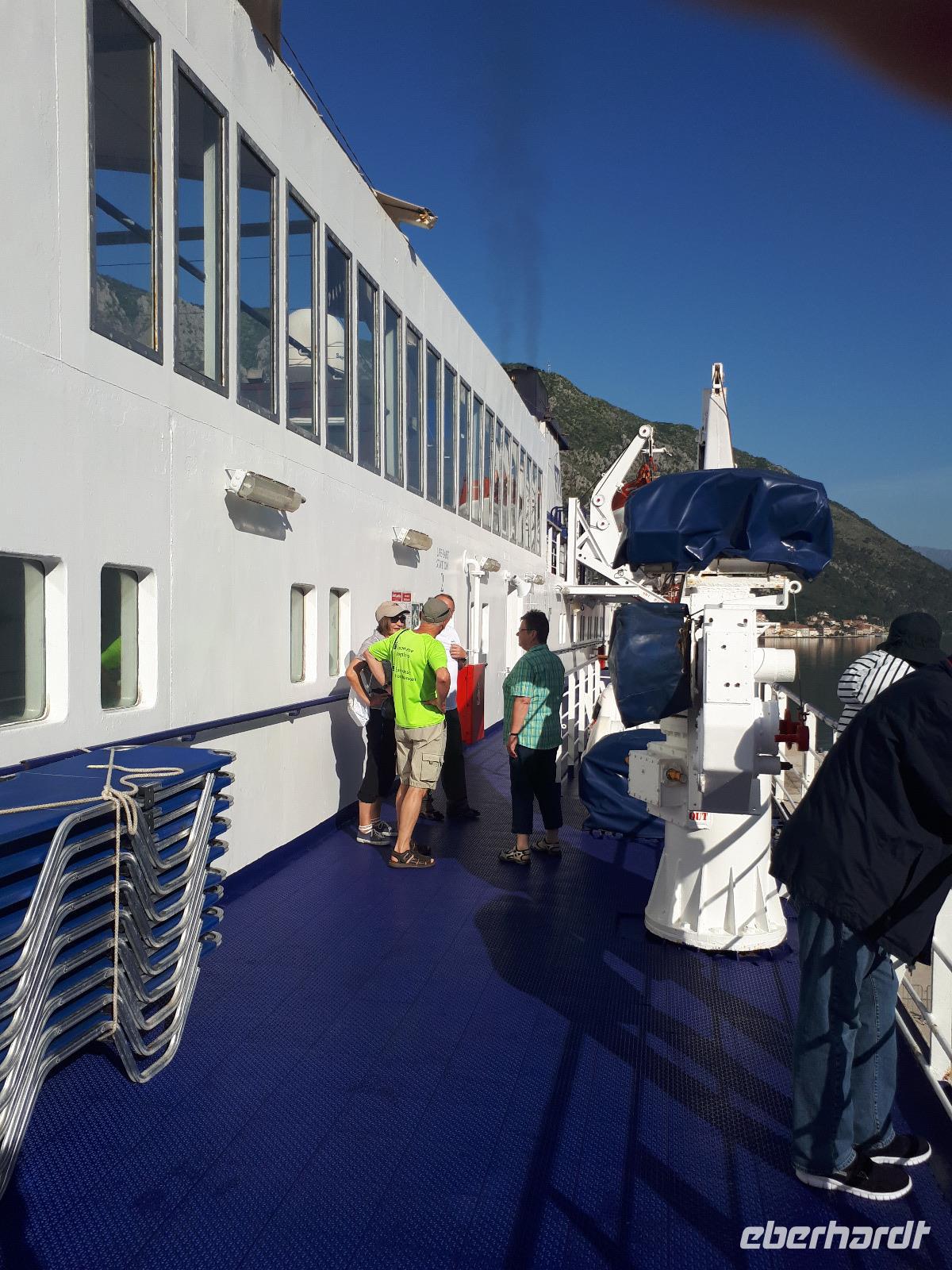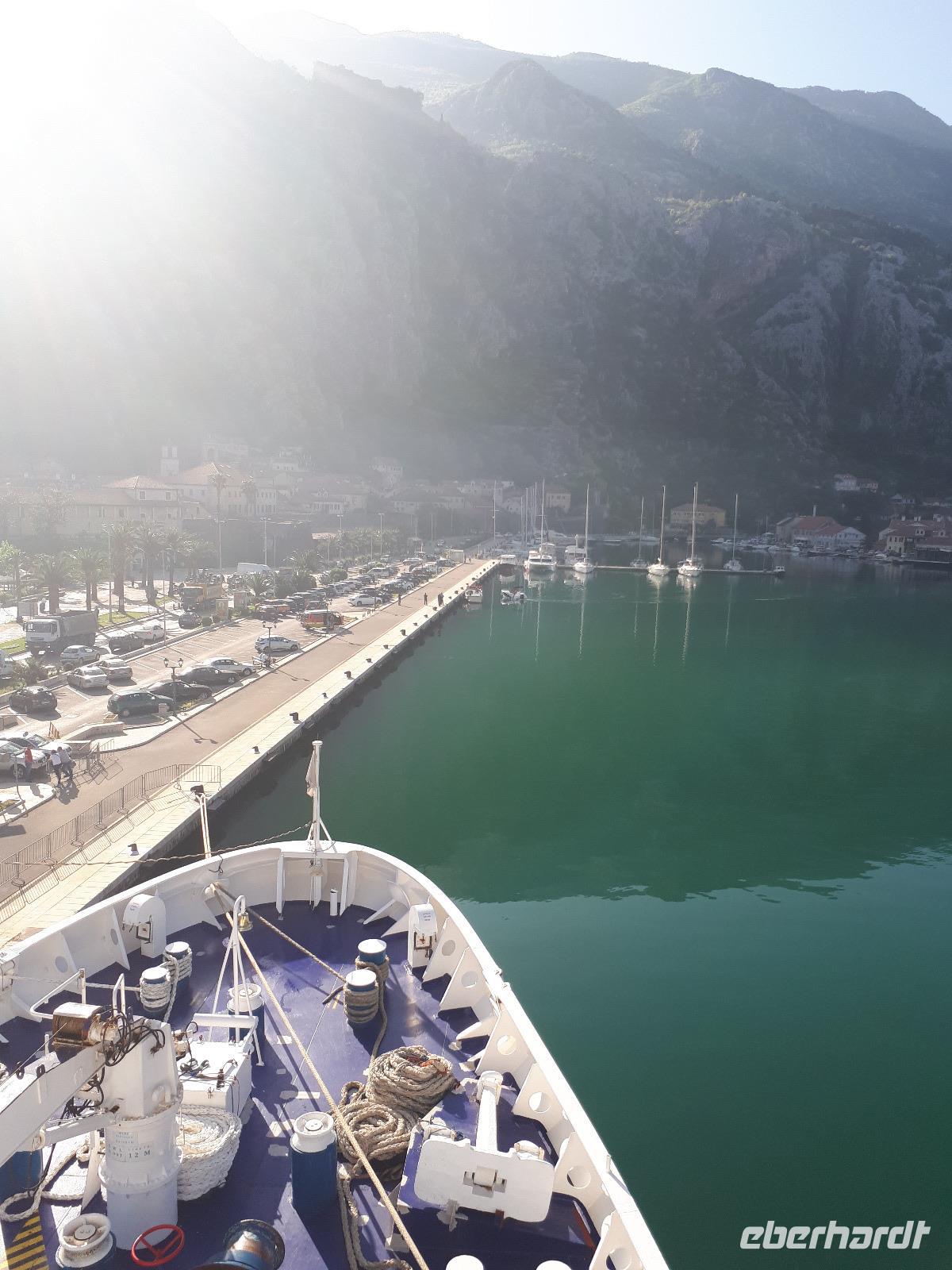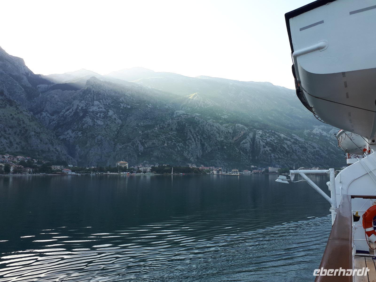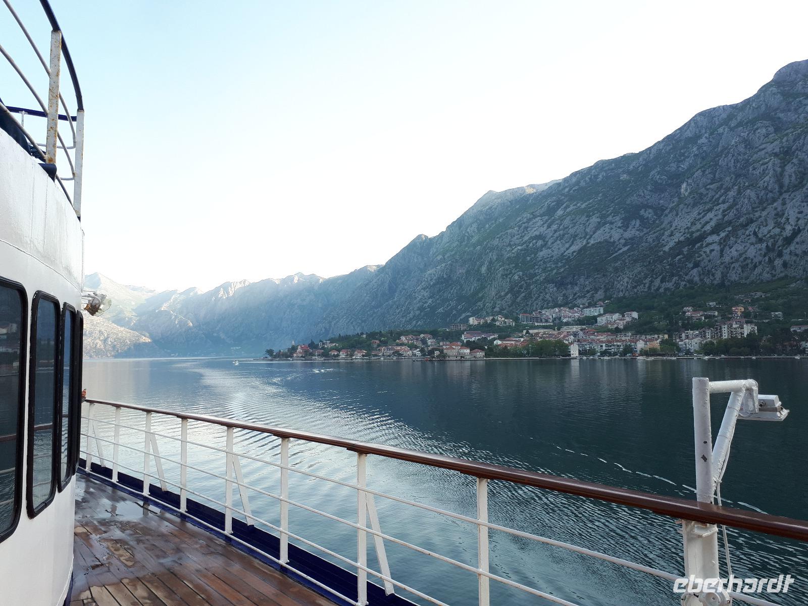 Wer die einmalige Einfahrt in den südlichsten Fjord Europas miterleben wollte, musste heute früh aufstehen, denn ab 6 Uhr kam der Lotse an Bord. Die Einfahrt war einmalig schön bei der aufgehenden Sonne. Nach einem guten Frühstück auf der Veranda und der Abholung der Lunchpakete konnte für einen Teil der Reisegruppe der Ausflug losgehen. Die Wanderer der langen Strecke stiegen vor uns aus, wir fuhren bis Perast weiter. Voller Elan stiegen wir den serpentinenartig angelegten Weg hinauf. Unser Ziel war eine kleine zerfallene Kapelle, daher schien der Weg ein alter Pilgerpfad zu sein. Der Aufstieg wurde durch die Hitze immer beschwerlicher aber je höher wir kamen, desto schöner wurde die Aussicht auf die innere Bucht von Kotor. Wir waren begeistert vom blauen Meer, den kleinen weißen Booten und den kleinen Inselchen, die meistens Klosterinseln sind. Glücklich kamen wir bei der kleinen Kapelle an und erkundeten diese auch kurz. Unsere wohlverdiente Pause nahmen wir bei einem schattigen Plätzchen ein. Jürgen erzählte von seinen Wandertouren mit Kindern und Jugendlichen und wir hörten belustigt seinen Erlebnissen zu. Der Abstieg war nicht weniger anstrengend, mussten wir doch genau hinschauen, wohin wir bei den teils losen Felsen und Geröll hintreten. Als wir wieder in Perast ankamen, nutzten wir die verbleibende Zeit bis zum Treff auf die anspruchsvollen Wanderer, um das kleine idyllische Örtchen direkt am Wasser zu erkunden. Zurück auf dem Schiff trafen wir uns alle gemeinsam zum Abendessen und erzählten von den Erlebnissen des Tages. Einige Gäste erkundeten auf eigene Faust die Stadt Kotor oder unternahmen einen Ausflug nach Budva und Perast mit kleiner Bootsfahrt quer über die Bucht. Am Abend wurden wir in Oktoberfest-Stimmung mit der Toroler-Stadl-Band gebracht.