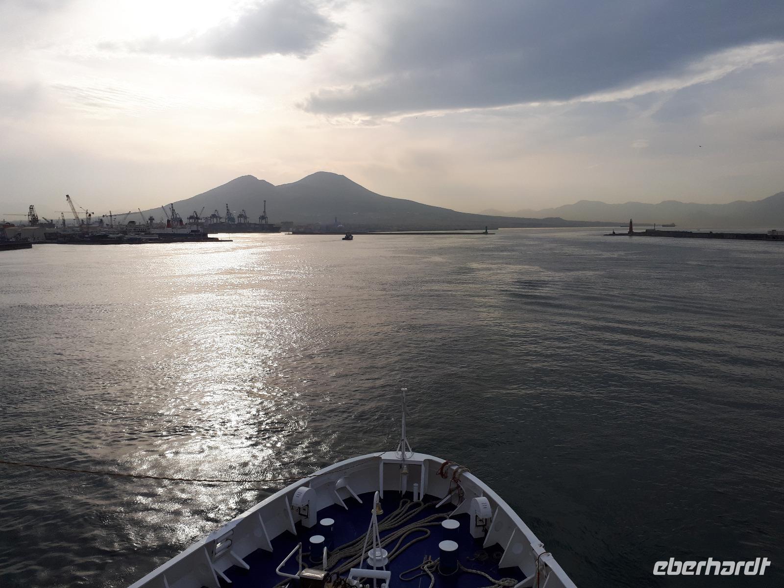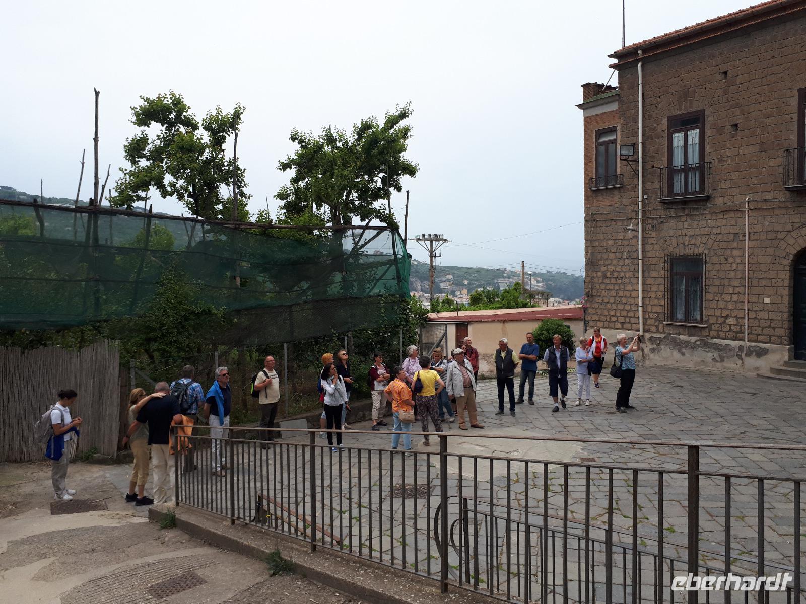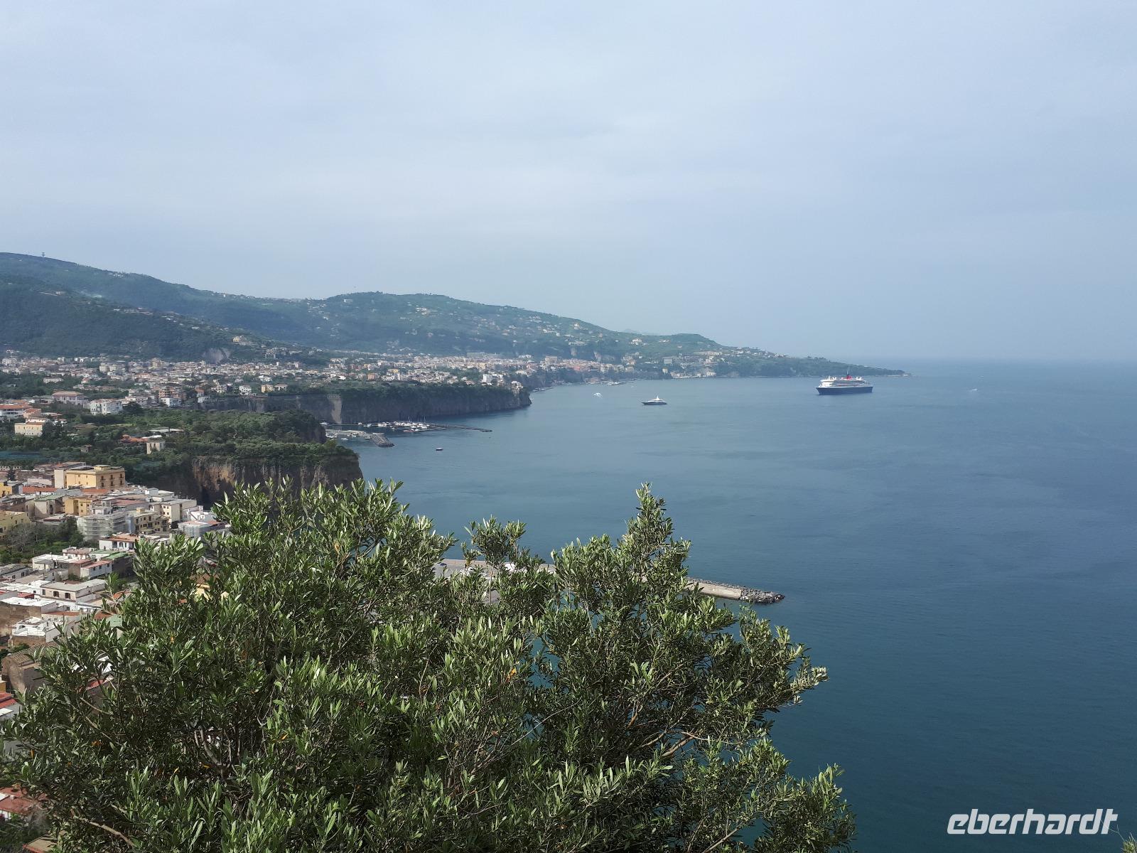 Der heutige Tag begann in Neapel, der drittgrößten Stadt Italiens mit dem Vulkan Vesuv im Hintergrund. Die meisten Gäste unserer Eberhardt-Reisegruppe wollten heute einmal nicht wandern, sondern süditalienische Gärten und Olivenhaine besichtigen. Wir fuhren Richtung Sorrent, immer entlang der reizvollen Küste. Die Schiffsreiseleiterin Mona begleitete uns heute. Bei einem Fotostopp mit einem tollen Blick in die Bucht konnten wir sogar die edle Queen Mary 2 lag bewundern. Unser erster Prgrammpunkt war der älteste Zitronenhain in Sorrento. Wir wurden sehr herzlich begrüßt und konnten den intensiven Geschmack der angebauten Zitronen verkosten. Anschließend konnten wir bei einer interessanten Führung unsere eigenen Zitronen pflücken. Wir pflückten so viel, wie wir buchstäblich tragen konnten, auch mit Blatt. Wer schwer arbeitet, braucht auch eine Stärkung. Unsere Kräfte wurden mit einem unheimlich frischen Zitronensorbet und intensiven Limoncello wieder geweckt. Natürlich konnten wir die probierten Produkte auch für zu Hause mitnehmen. Der Ausflug führte uns zu einer landwirtschaftlichen Genossenschaft, die von einer Gruppe von Freunden gegründet wurde, um das Bewusstsein für die Produktion regionaler Produkte zu stärken. Wir liefen durch einen Olivenbaumgarten, besichtigten die Olivenölpressen und ließen uns die Herstellung von dem typischen Mozarella-Käse zeigen. Im Anschluss an die Führung ließen wir uns ein kleines Mittagessen mit Wein, Käse und guten Schinken schmecken.Die gesellige Runde musste nun wieder den Rückweg zum Schiff antreten, aber nicht ohne vorher noch einen typischen Espresso zu trinken. Unsere örtliche Reiseleiterin zeigte indes allen Interessierten an der angrenzenden Limoncello-Fabrik, wie die Zitronen für einen echten Limoncello verabreitet werden. Die Berlin legte dann am späten Nachmittag ab in Richtung Civitavecchia und wir konnten beim Auslaufen noch ein tolles Panorama der Stadt mit dem Vesuv bestaunen.