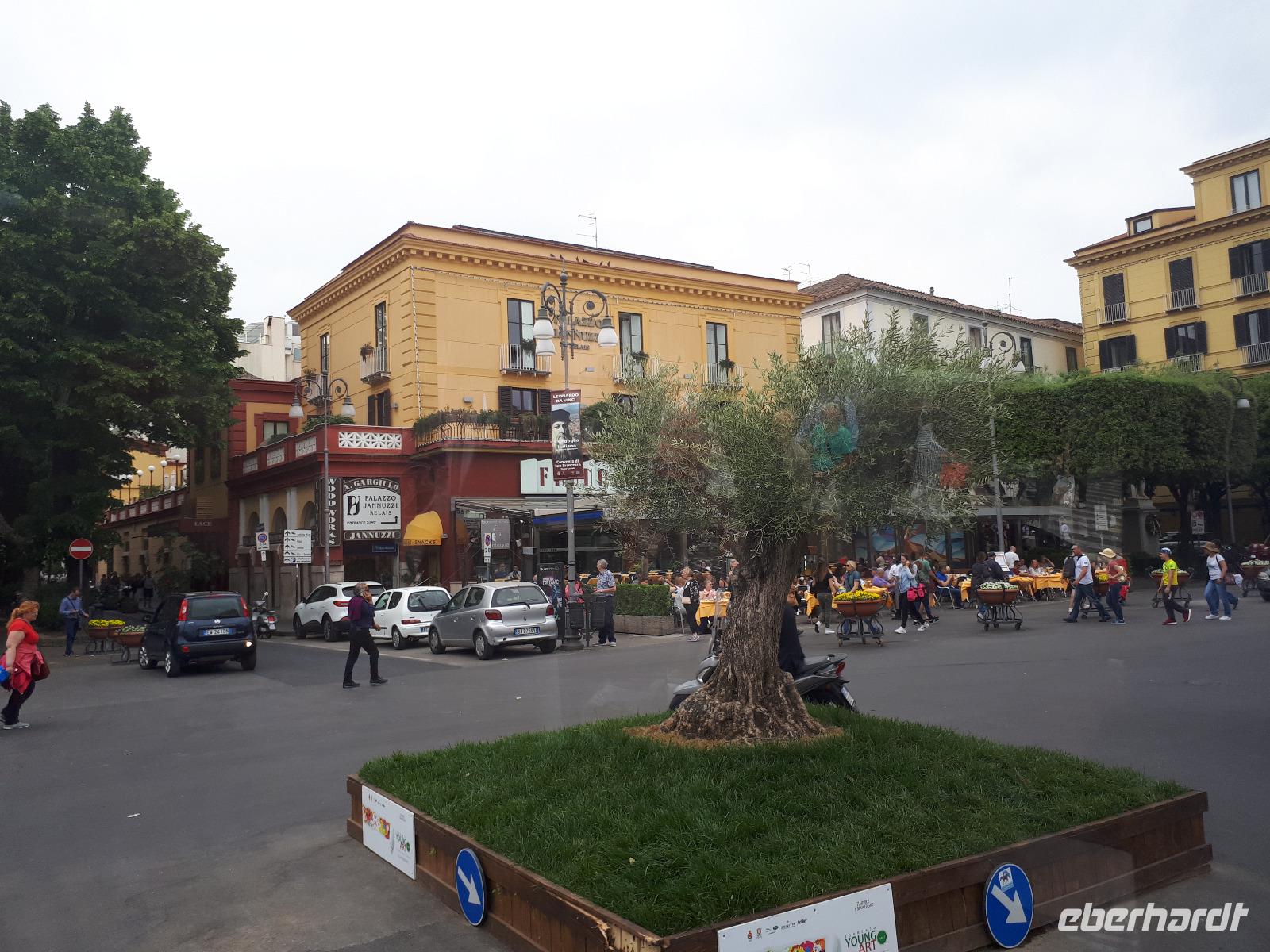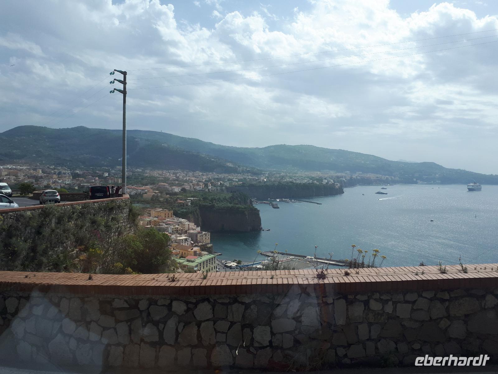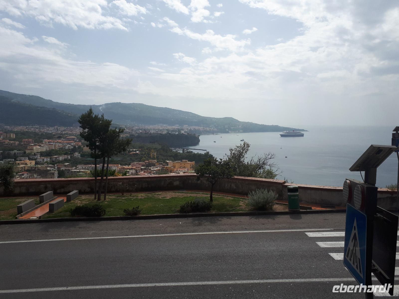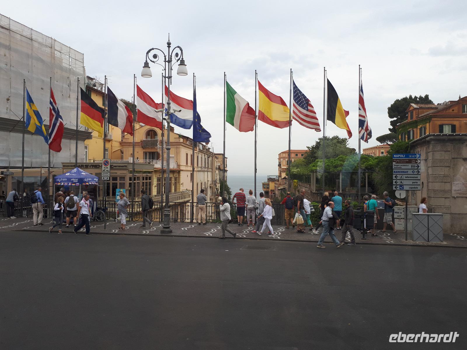 Der heutige Tag begann in Neapel, der drittgrößten Stadt Italiens mit dem Vulkan Vesuv im Hintergrund. Die meisten Gäste unserer Eberhardt-Reisegruppe wollten heute einmal nicht wandern, sondern süditalienische Gärten und Olivenhaine besichtigen. Wir fuhren Richtung Sorrent, immer entlang der reizvollen Küste. Die Schiffsreiseleiterin Mona begleitete uns heute. Bei einem Fotostopp mit einem tollen Blick in die Bucht konnten wir sogar die edle Queen Mary 2 lag bewundern. Unser erster Prgrammpunkt war der älteste Zitronenhain in Sorrento. Wir wurden sehr herzlich begrüßt und konnten den intensiven Geschmack der angebauten Zitronen verkosten. Anschließend konnten wir bei einer interessanten Führung unsere eigenen Zitronen pflücken. Wir pflückten so viel, wie wir buchstäblich tragen konnten, auch mit Blatt. Wer schwer arbeitet, braucht auch eine Stärkung. Unsere Kräfte wurden mit einem unheimlich frischen Zitronensorbet und intensiven Limoncello wieder geweckt. Natürlich konnten wir die probierten Produkte auch für zu Hause mitnehmen. Der Ausflug führte uns zu einer landwirtschaftlichen Genossenschaft, die von einer Gruppe von Freunden gegründet wurde, um das Bewusstsein für die Produktion regionaler Produkte zu stärken. Wir liefen durch einen Olivenbaumgarten, besichtigten die Olivenölpressen und ließen uns die Herstellung von dem typischen Mozarella-Käse zeigen. Im Anschluss an die Führung ließen wir uns ein kleines Mittagessen mit Wein, Käse und guten Schinken schmecken.Die gesellige Runde musste nun wieder den Rückweg zum Schiff antreten, aber nicht ohne vorher noch einen typischen Espresso zu trinken. Unsere örtliche Reiseleiterin zeigte indes allen Interessierten an der angrenzenden Limoncello-Fabrik, wie die Zitronen für einen echten Limoncello verabreitet werden. Die Berlin legte dann am späten Nachmittag ab in Richtung Civitavecchia und wir konnten beim Auslaufen noch ein tolles Panorama der Stadt mit dem Vesuv bestaunen.