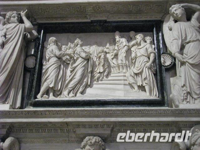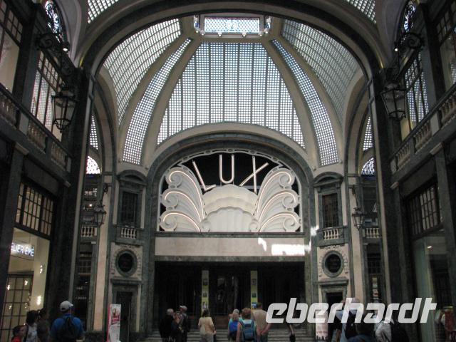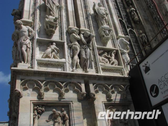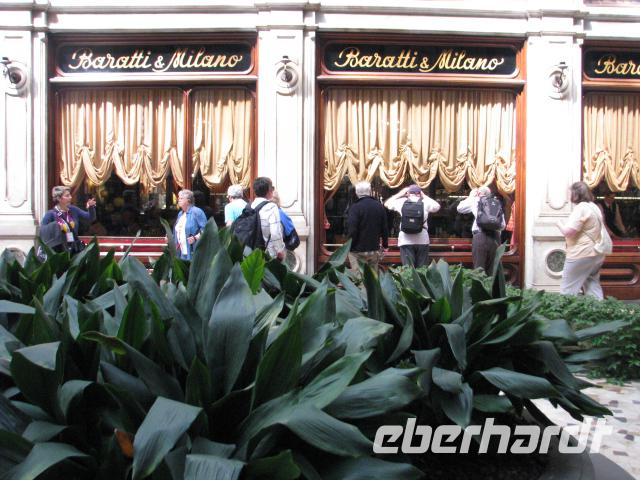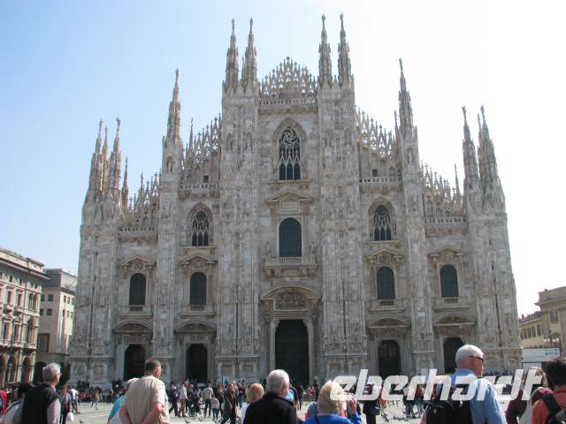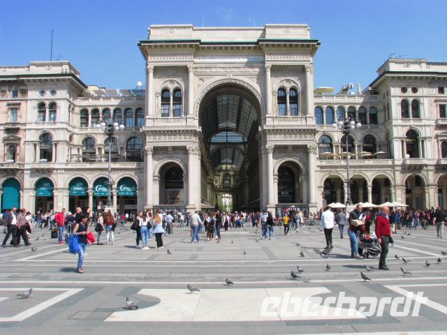 Mit unserer Stadtführerin treffen wir uns dann am Castello Sforzesco und beginnen hier mit unserem Stadtrundgang. Weiter geht es zum Mailänder Dom, wo wir schon eine Schlange von Wartenden sehen können. Doch wir haben Glück: Es wird ein weiterer Zugang für uns geöffnet und so verkürzt sich unsere Wartezeit deutlich. Nun müssen wir noch die Sicherheitskontrolle passieren. Alle Taschen und Rücksäcke müssen abgenommen werden und dann geht es weiter wie bei den Flughafenkontrollen. Schließlich gelangen wir alle in das Innere des Domes,welches mit seiner Architektur und seinen zahlreichen Kunstschätzen beeindruckt. Von hier ist es nur ein kurzer Weg zu Galleria di Vittorio Emanuele II. Elegante Läden und Cafés finden sich hier. Geschaffen wurden diese Gallerie, die sich ebenso in Turin und Neapel finden, um auch bei Regen oder Hitze gepflegt flanieren zu können.