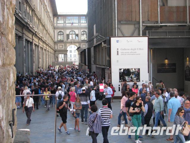 Während wir die letzten Tage eigentlich ganz entspannt verbracht hatten, nimmt hier nun die Anzahl der Besucher deutlich zu. Schließlich zählt Florenz, neben Venedig, Rom und Neapel zu den meistbesuchten Städten Italiens. Bei unserem Stadtrundgang gelingt es uns dennoch einen Blick in die Loggia dei Lanzi zu erhaschen und auf die Ponte Vecchio zu gehen. Beim Baptisterium verabschieden wir dann unseren Stadtführer und wir ergreifen sofort die Gelegenheit um uns in die Schlange für dieses außergewöhnliche Gebäude einzureihen. So gelingt es uns noch hinein zu gelangen, bevor es schließt.