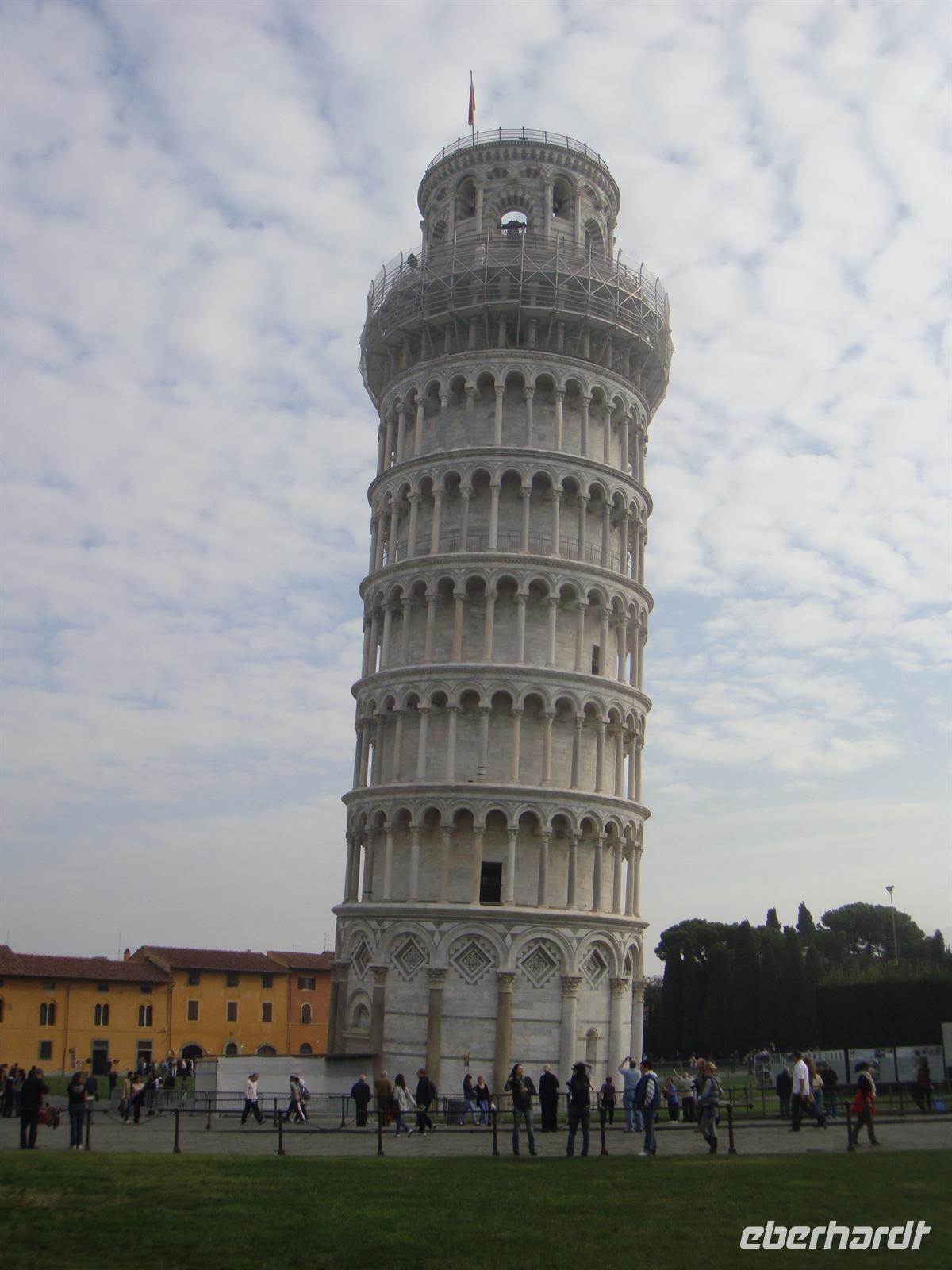 Doch ein besonderes Augenmerk gilt natürlich dem Campanile - dem schiefen Turm! Der Campanile ist ein für Italien typischer frei stehender Glockenturm auf einem runden Grundriss. 1173 begonnen, wurde der Turm schon bald zum schiefen Turm, da der Boden die Belastung der ersten drei Stockwerke nicht aushielt. 100 Jahre später versuchte man dem entgegen zu wirken, indem man die nächsten Stockwerke entgegen der Neigung mauern ließ. Im Laufe der Zeit wurden viele Stabilisierungsprojekte ins Leben gerufen, die aber alle nicht den gewünschten Effekt bescherten. Und wir sind mal ganz ehrlich - was ist denn Pisa ohne den schiefen Turm?