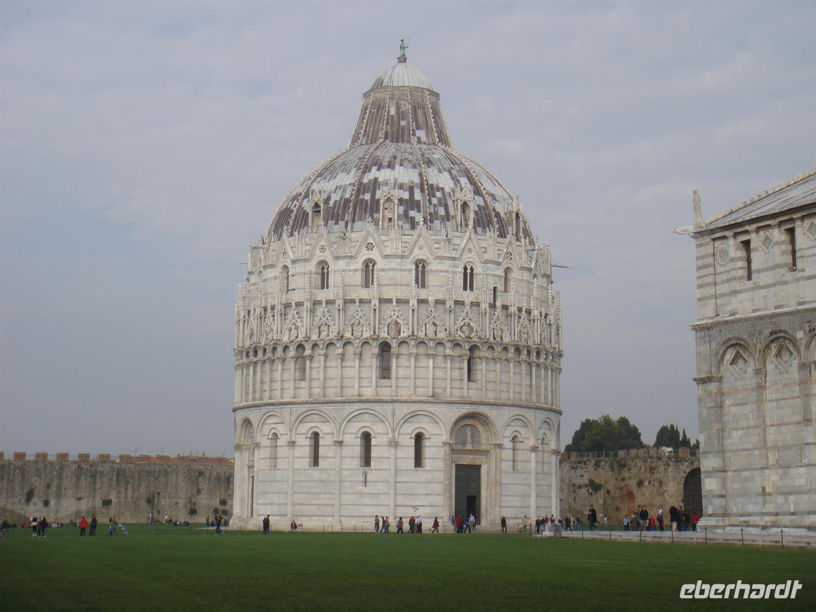 Entlang der alten Stadtmauer spazieren wir bis zu einem Stadttor. Wir gehen hindurch uns stehen auf der Piazza die Miracoli, Platz der Wunder. Majestätisch zeigt sich das Ensemble aus den vier monumentalen Einzelbauwerken Dom, Baptisterium, Campanile (Turm) und Camposanto (Friedhof).