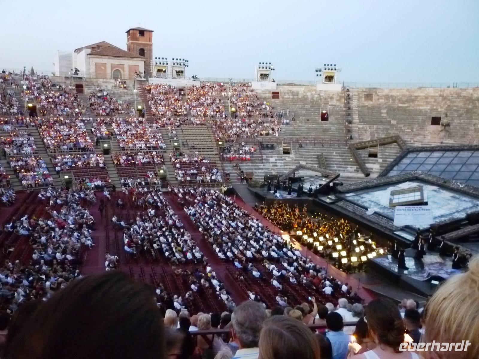 15 Uhr erfolgte die Rückfahrt nach Verona, im Hotel standen schon 17 Uhr für uns die Tische zum Abendessen bereit.18.30 Uhr standen wir schon vor der Arena und alle diejenigen, die noch nicht in dieser beeindruckenden Opernspielstätte gewesen waren, konnten ihre Spannung kaum verbergen.