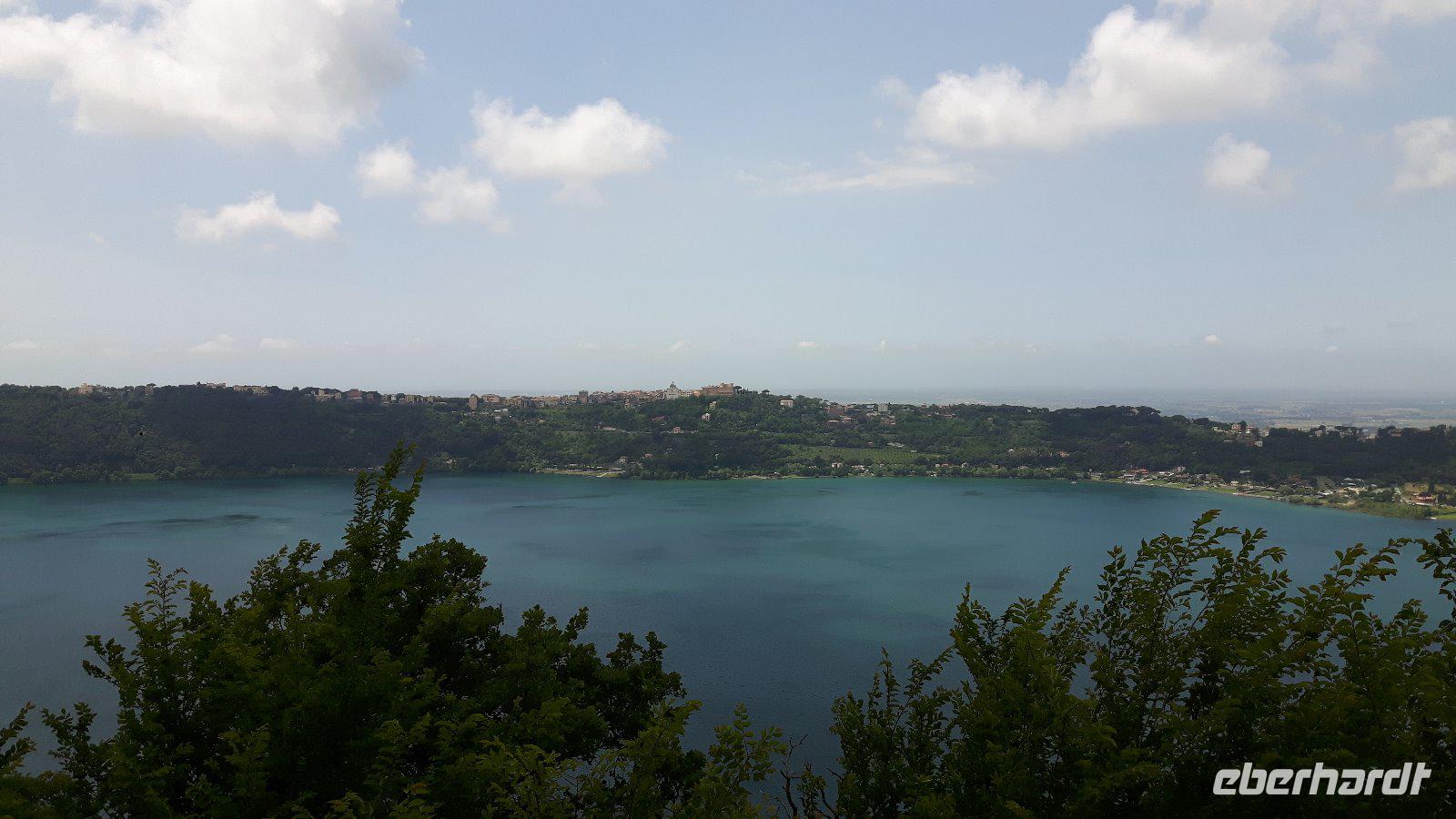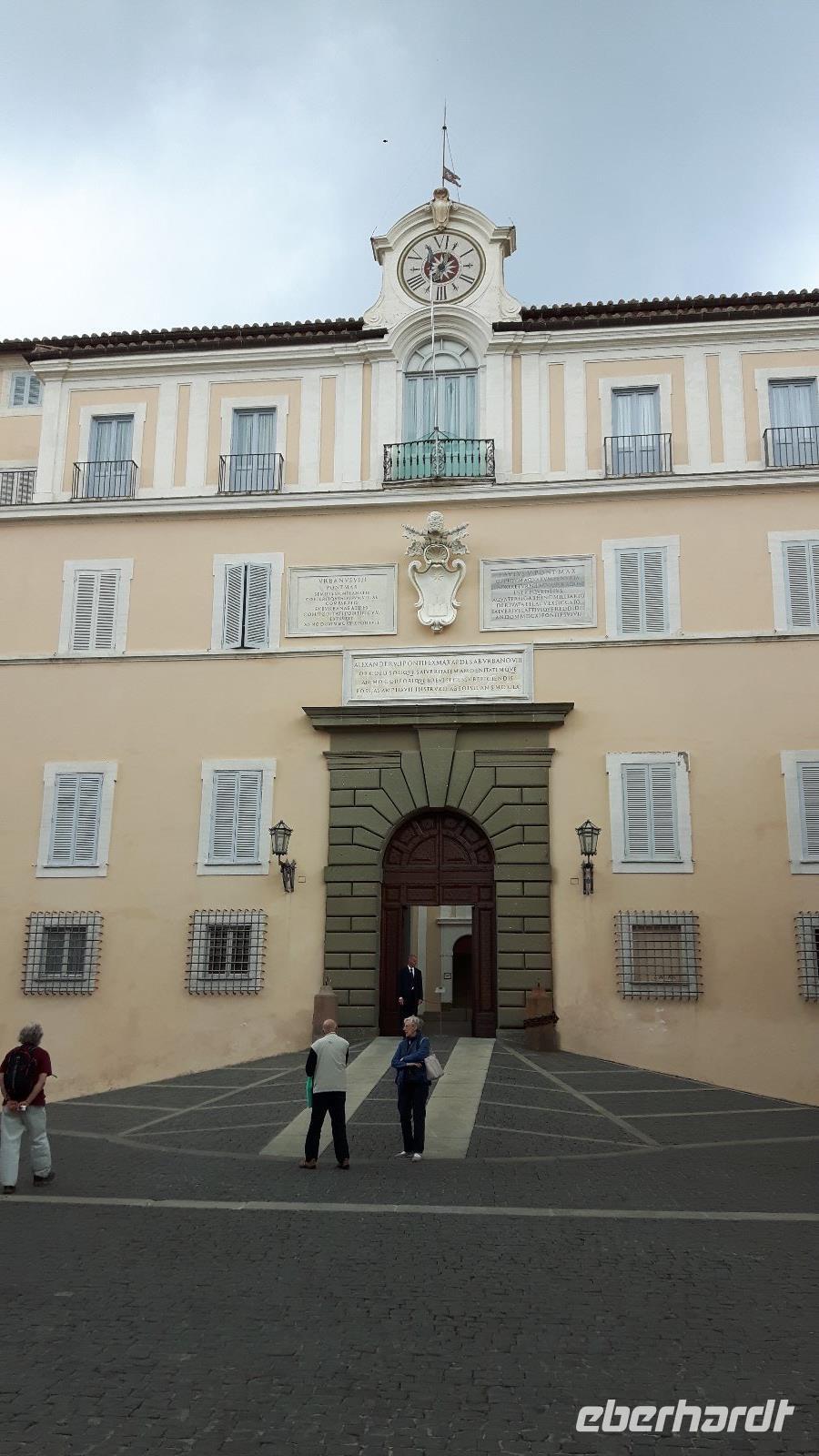 Schon von weitem kann man bei der Anfahrt die Sommerresidenz des Papstes sehen. Unmittelbar an der Außenmauer des Areals steigen wir aus und rollen zur Frontfassade des Gebäudes. Auch wenn das Castel selbst nicht zu besichtigen ist, rechtfertigen die kleine umgebende Altstadt und der Blick auf den in einer Caldera liegenden Albaner See einen Aufenthalt.