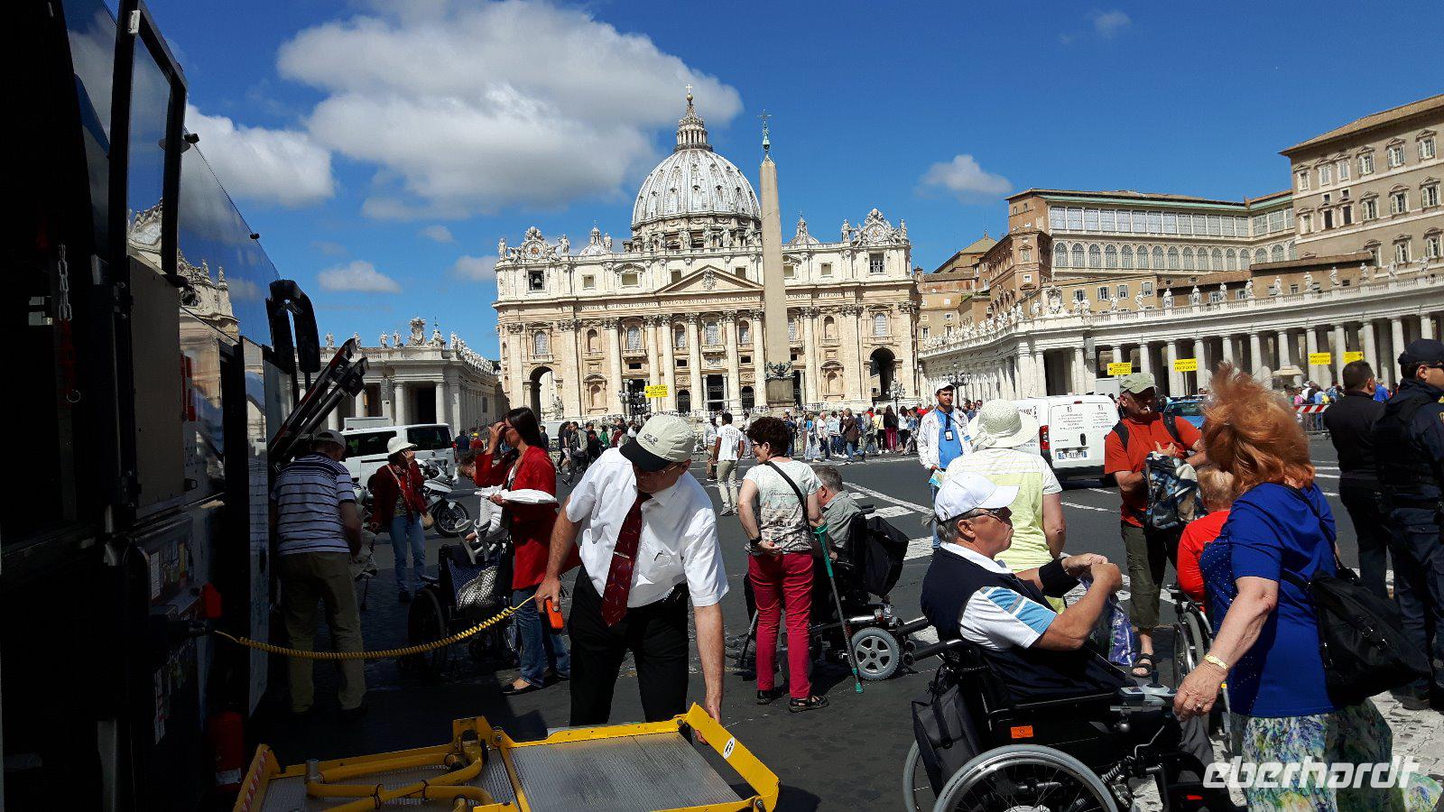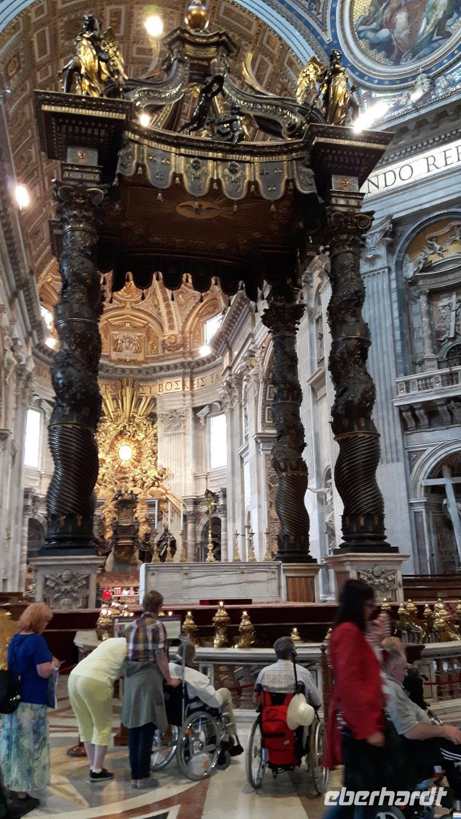 Eine intensive Führung durch die bedeutendste Kirche der Welt schließt sich an. Auch hier öffnen sich für uns wieder alle Türen; wir dürfen direkt bis an den Papstaltar rollen.