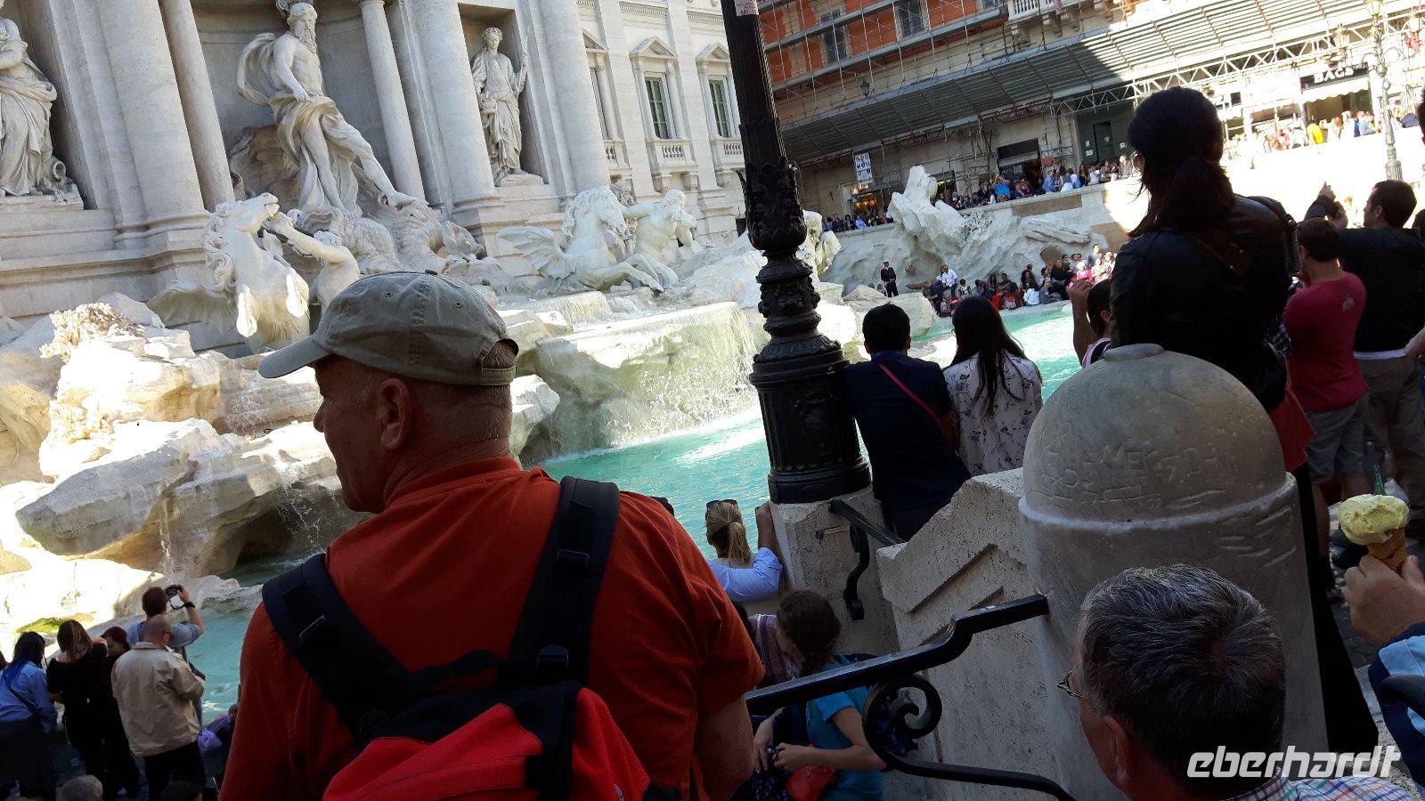 Weiter geht es zum Pantheon; die Innenbesichtigung des Tempels ist ein weiterer beeindruckender Höhepunkt des heutigen Tages. Am Trevibrunnen dann mit Blick auf das Wasserspiel ein leckeres „Gelato" ehe wir zur Piazza Venezia rollen, wo schon die von Eberhardt Travel organisierten Ersatzbusse bereitstehen.
