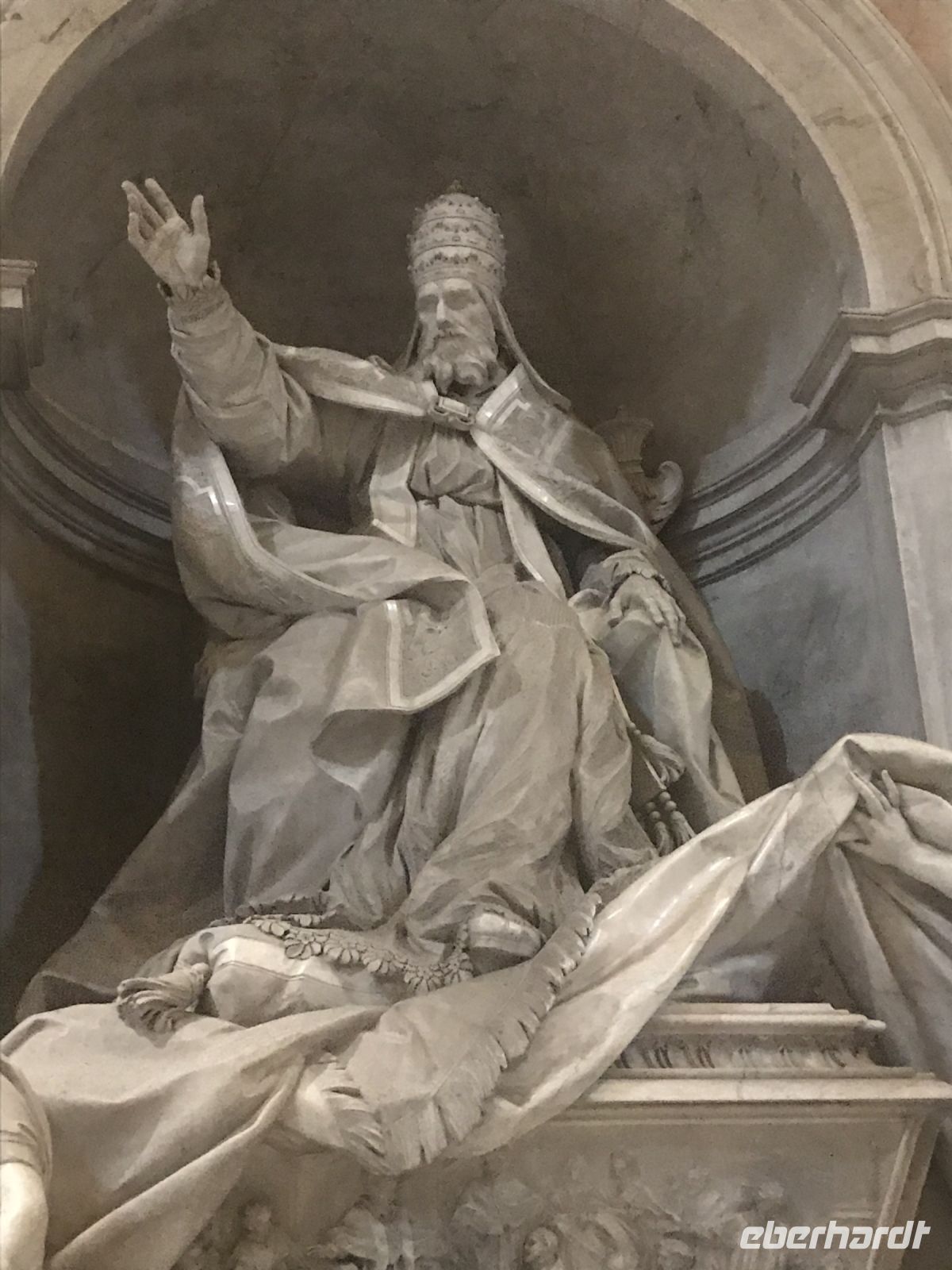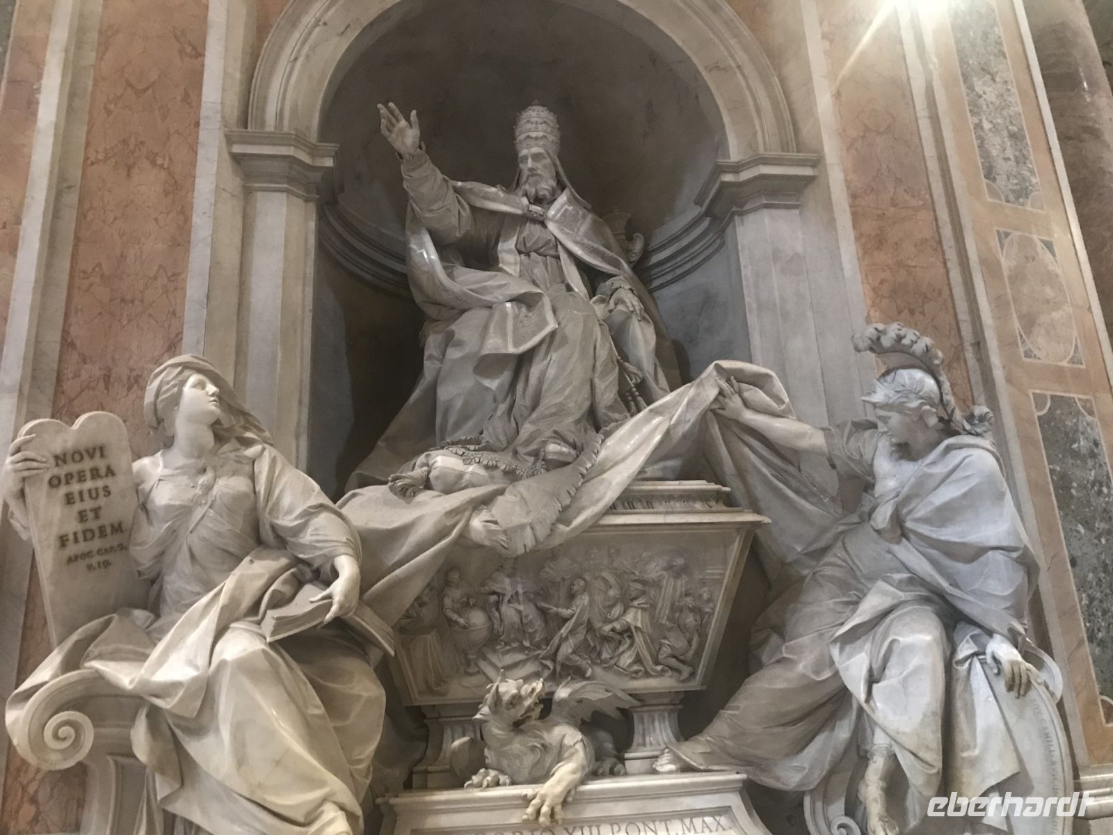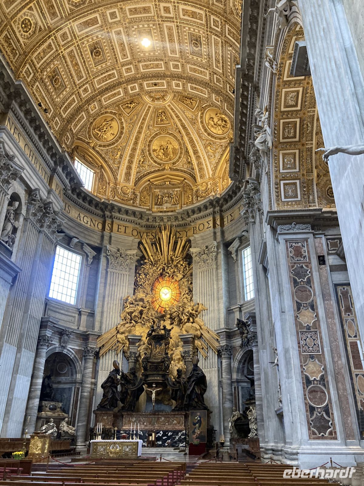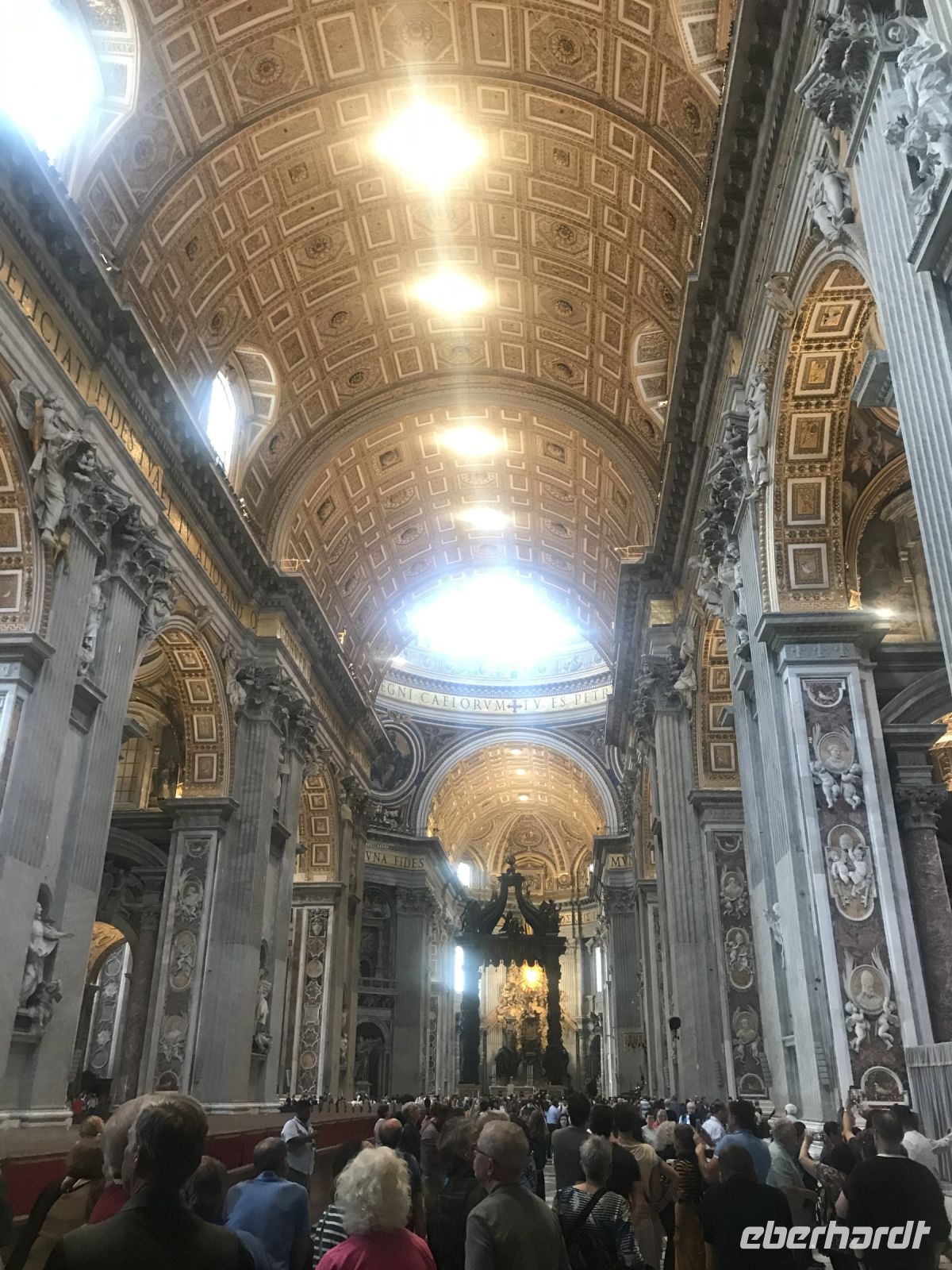 Von hier aus geht es direkt in den Petersdom und so ersparen wir uns die lange Schlange davor. Der Vorgängerbau der heutigen Petersbasilika, Alt-St. Peter, wurde um das Jahr 324 von Konstantin dem Großen über dem vermuteten Grab des hl. Petrus errichtet. Mit dem heutigen Bau wurde im Jahr 1506 begonnen, 1626 war er weitestgehend vollendet.