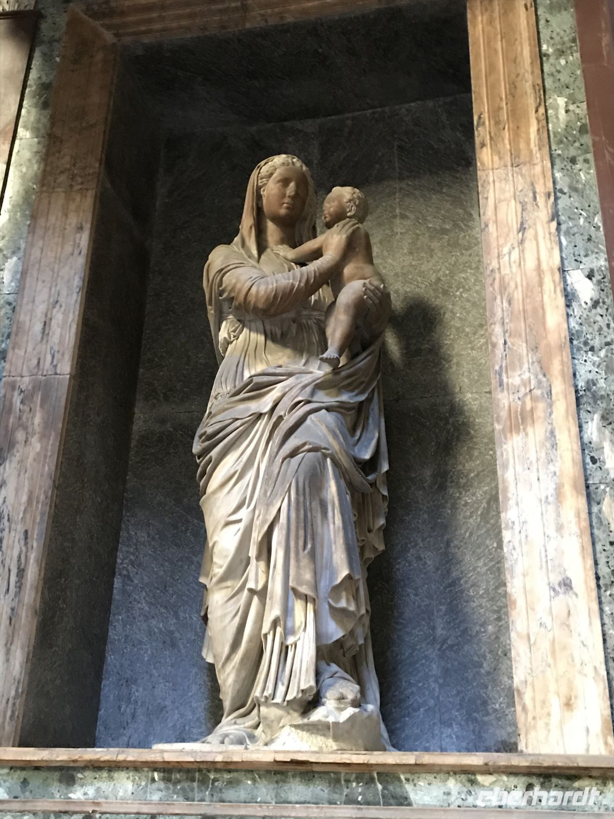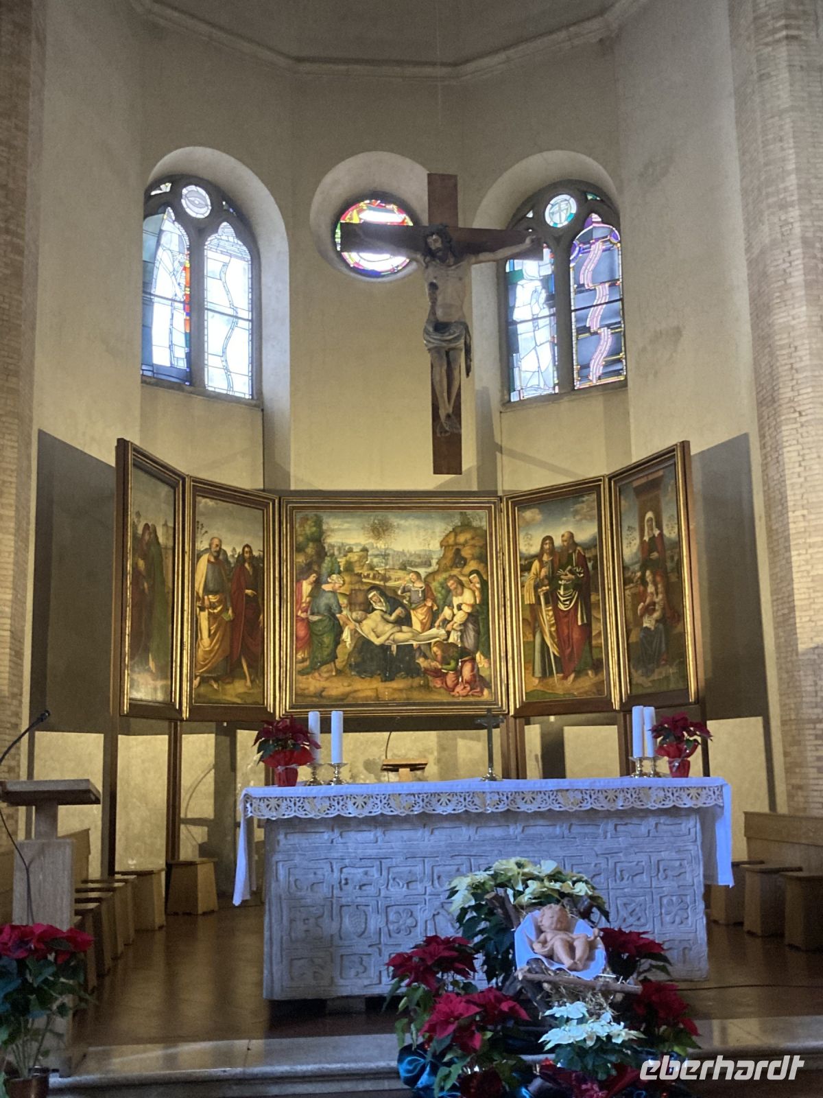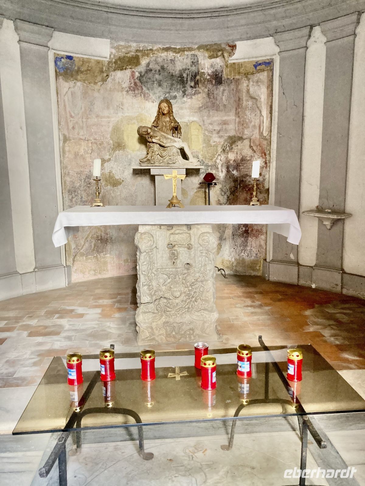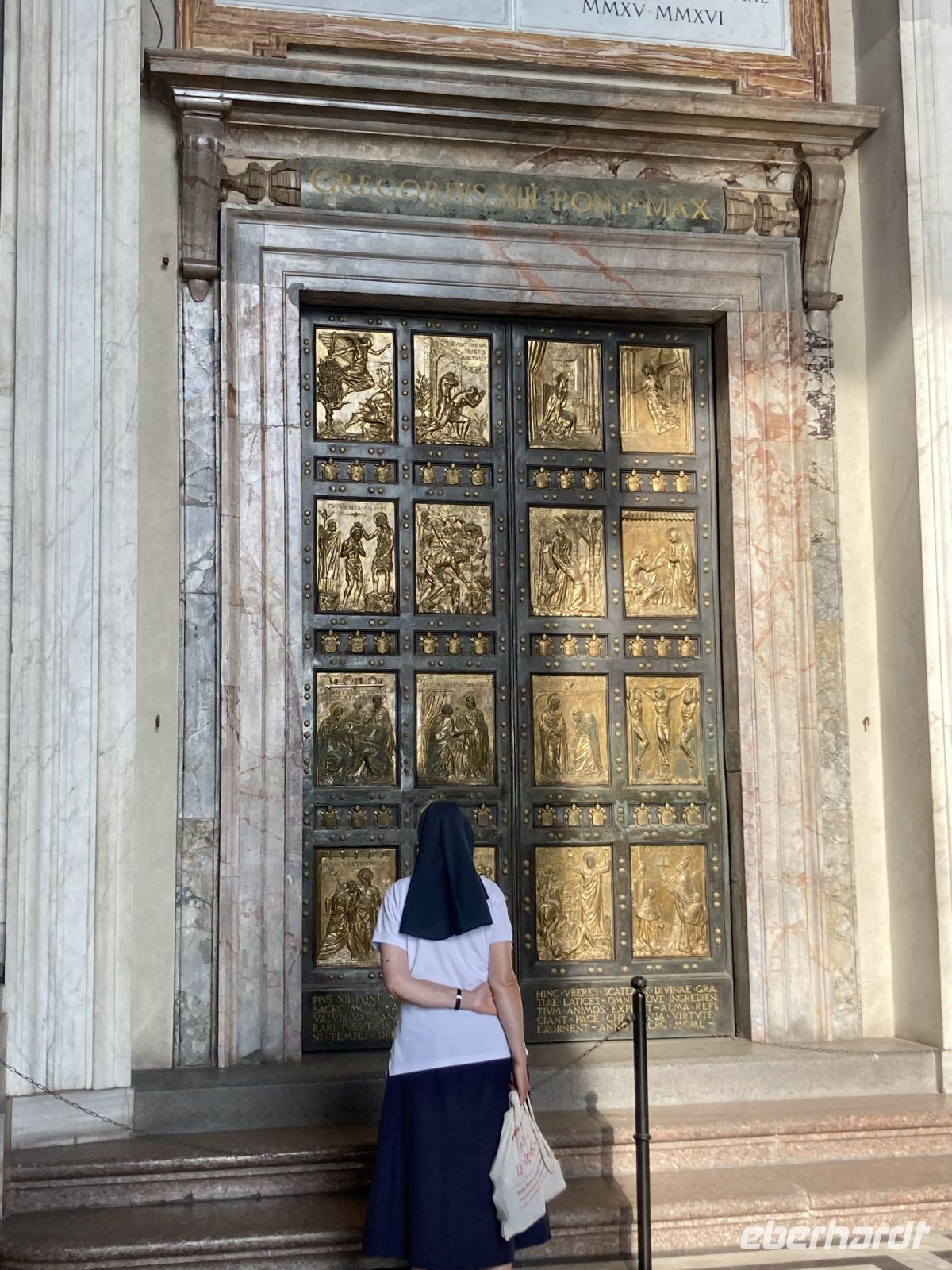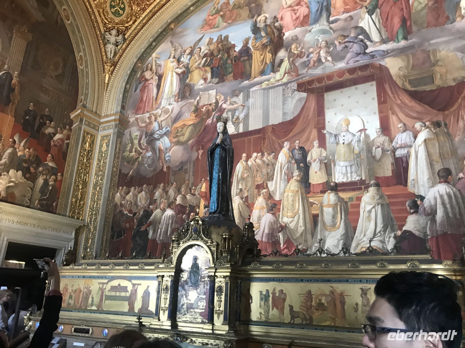 Von hier aus geht es direkt in den Petersdom und so ersparen wir uns die lange Schlange davor. Der Vorgängerbau der heutigen Petersbasilika, Alt-St. Peter, wurde um das Jahr 324 von Konstantin dem Großen über dem vermuteten Grab des hl. Petrus errichtet. Mit dem heutigen Bau wurde im Jahr 1506 begonnen, 1626 war er weitestgehend vollendet.
