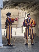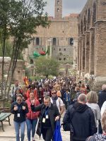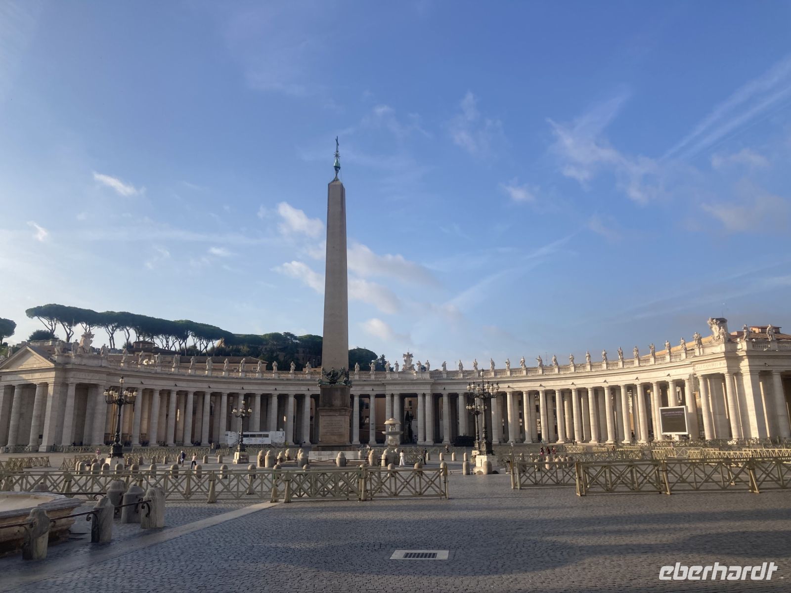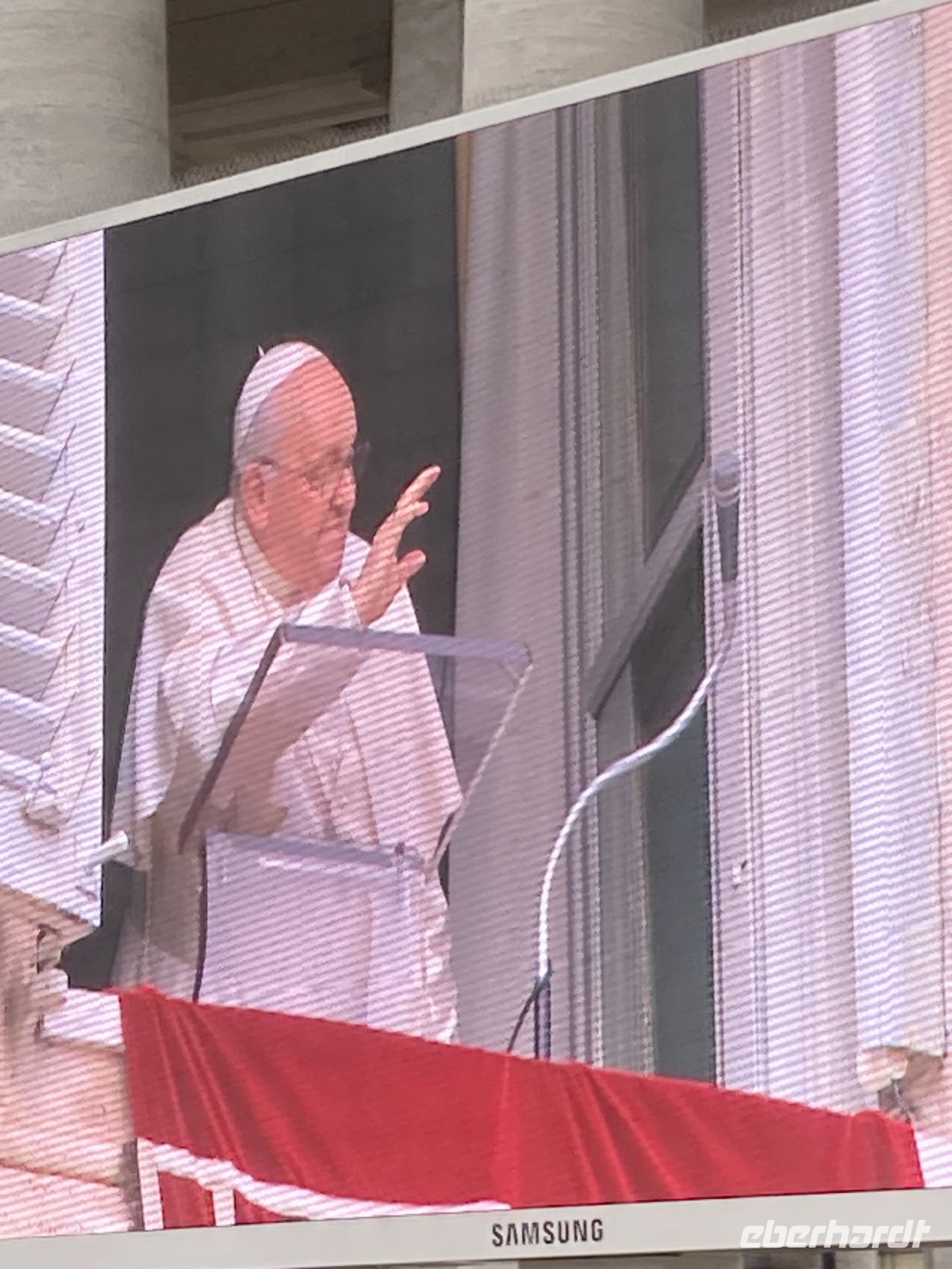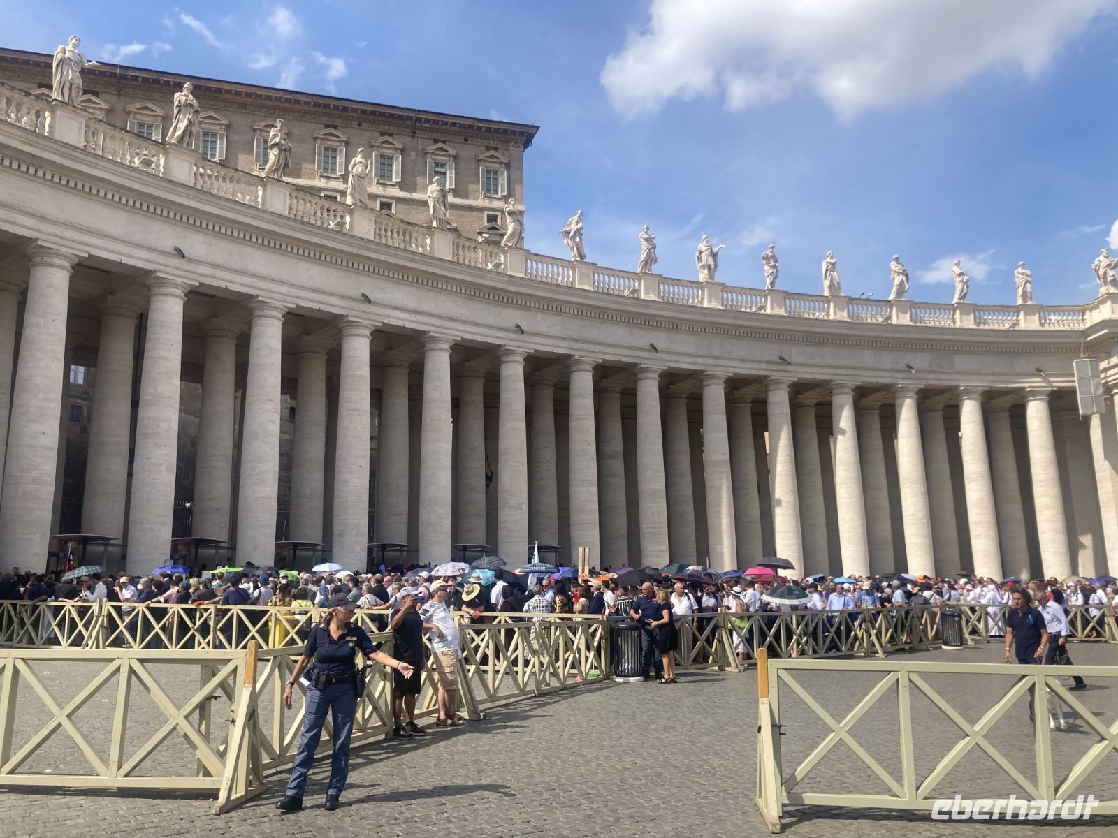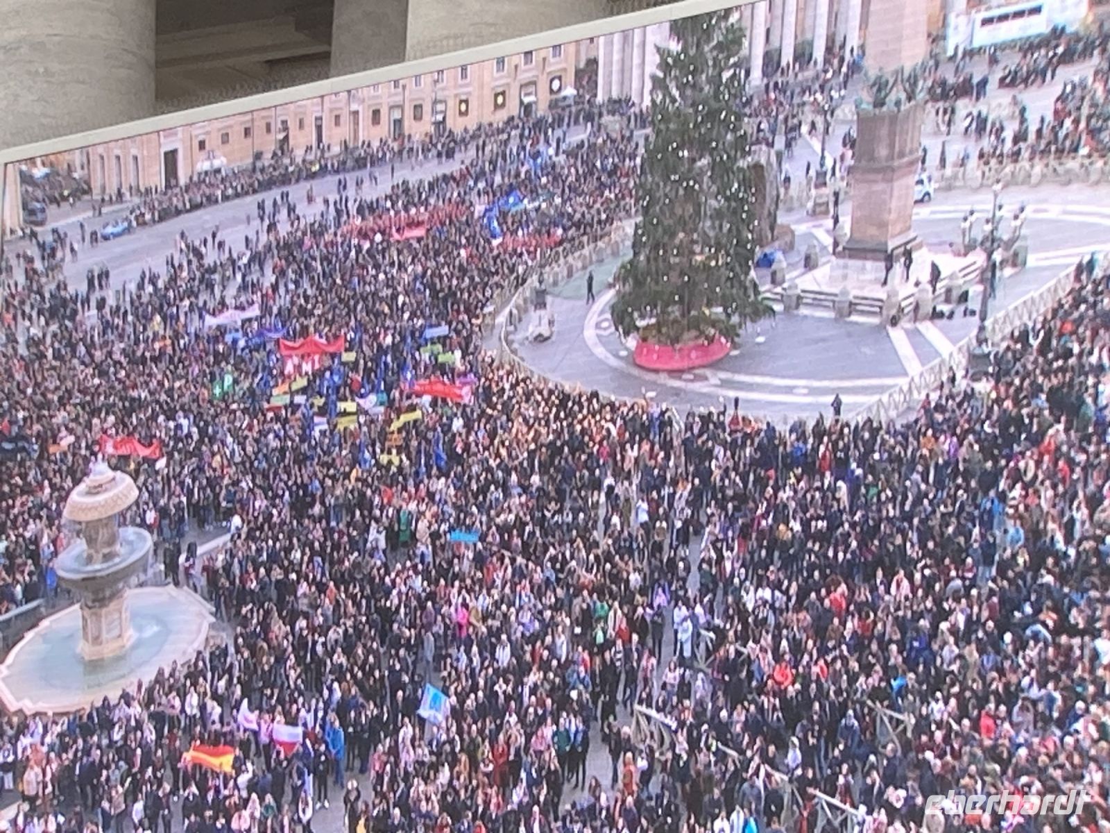 Dieses Mal fahren wir mit der Regionalbahn Richtung Petersplatz. Unser Hotel liegt sehr verkehrsgünstig. Metro, Bus, S- Bahn und die Regionalbahnen erreichen wir in nur wenigen Minuten. Auf den Petersplatz angekommen, erwarten uns schon viele Menschen in angespannter Erwartungshaltung. Aber es findet aus aktuellen Anlass auch eine Demonstration gegen die Kriege auf dieser Welt statt.