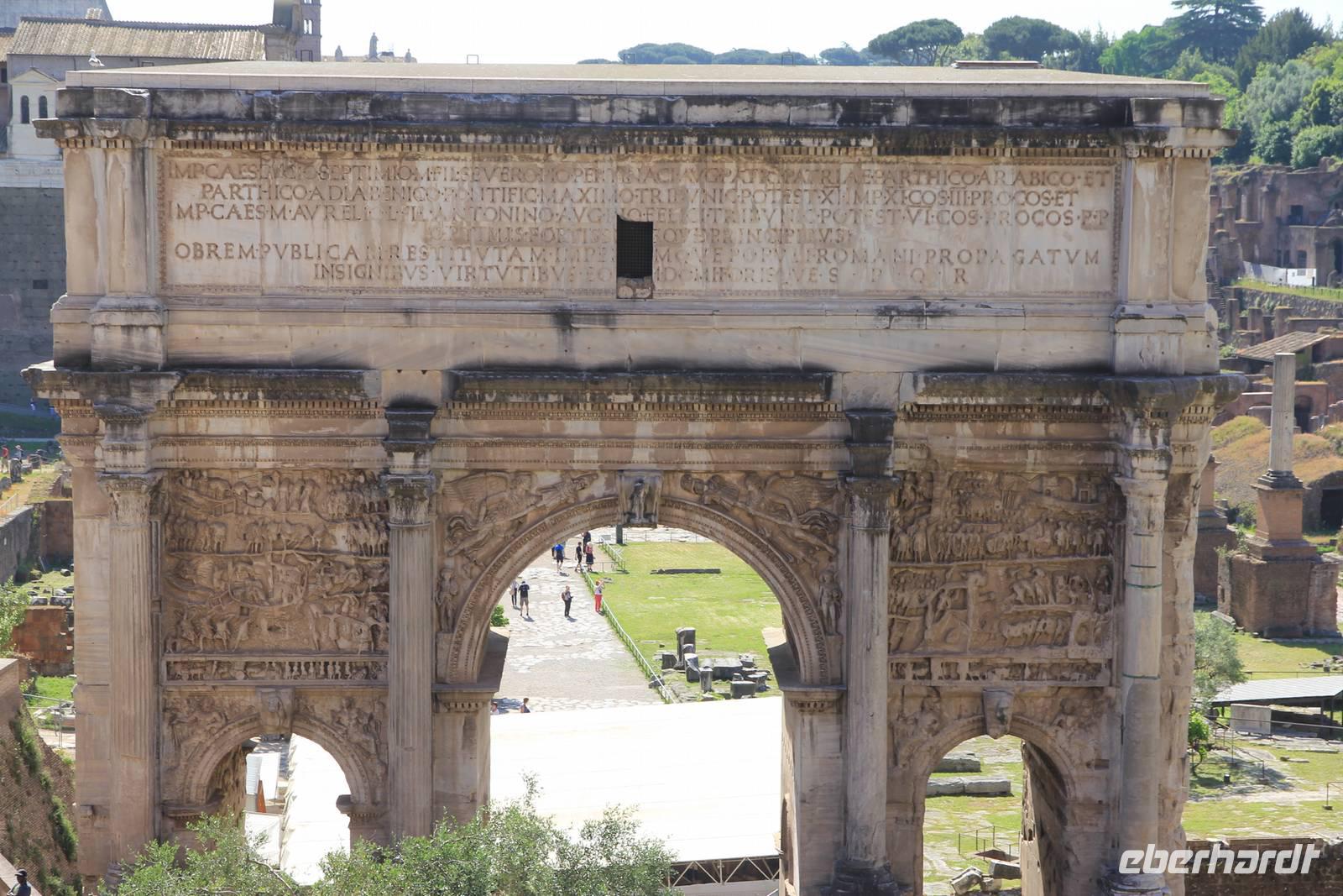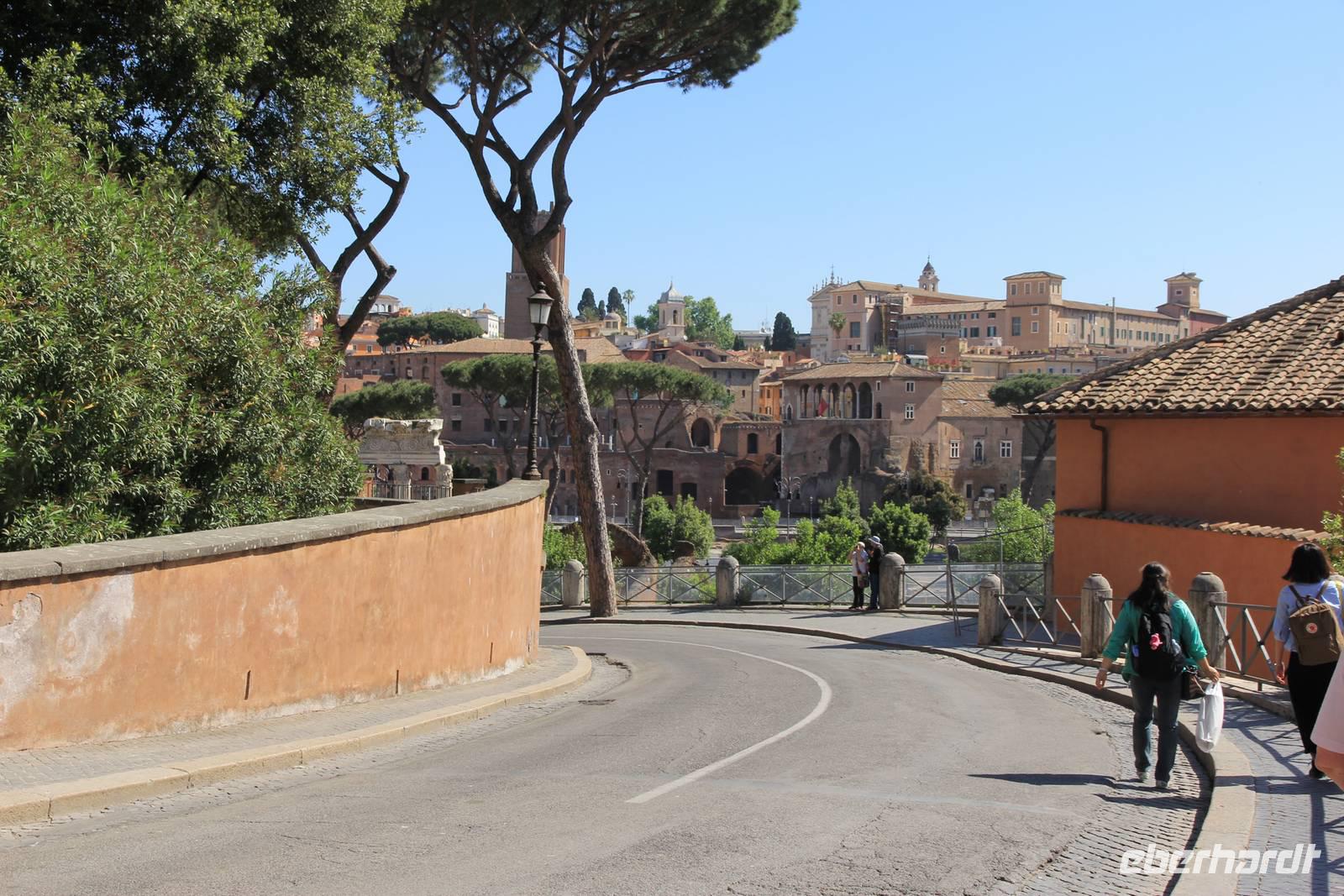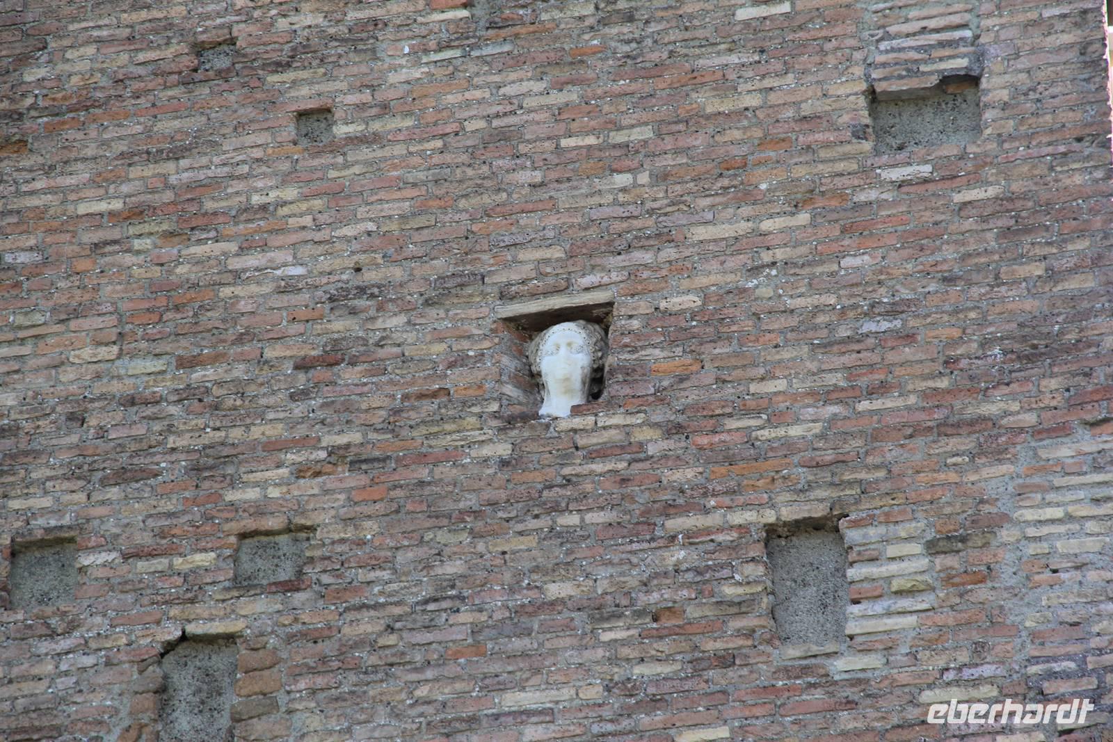Unsere Studienreiseleiterin Agnieszka Berlin begrüßt uns nach dem Frühstück im ehemaligen Kreuzgang des Klosters, dem heutigen Empfangsbereich des Hotels Donna Camilla Savelli und wir starten mit einem Rundgang durch Trastevere und einer Straßenbahnfahrt bis zur Piazza Venezia. Von da besteigen wir über den von Michelangelo entworfenen Treppenaufgang, die Cordonata, den Kapitolshügel, lernen wir von Agnieszka, wie in der Antike und im Mittelalter Macht demonstriert und ausgeübt wurde und finden eigentlich keinen Unterschied zu Heute. Vom Caput Mundi, dem Haupt der Welt, geht es ins Forum Romanum und damit um republikanische und diktatorische Herrschaft zu Zeiten des Römischen Reiches und ihre ruinösen Reste, die wir uns mit Hilfe der bildhaften Erklärungen Agnieszkas zu einer antiken Metropole zusammenbauen. Vor unserem geistigen Auge agieren die Sabinerinnen und Etrusker, die Vestalinnen und Senatoren, Septimus Severus, Julius Cäsar und Augustus, Maxentius, Trajan, Antonius Pius und seine liebreizende Frau Faustina und natürlich Konstantin. Die Mittagssonne treibt uns zum Kolosseum, welches wir mit dem Fahrstuhl erklimmen. Einige von uns sind zum wiederholten Mal hier, aber wieder bestaunen wir die Geschichte menschlich-sozialer Leistung an diesem Bau. Nach einer Mittagspause mit Bruschetta und Cola light fahren wir per Straßenbahn zum Circus Maximus. Wir laufen weiter auf den Aventin, am blühenden Rosenpark auf dem ehemaligen jüdischen Friedhof vorbei, zur Dominikaner-Kirche Santa Sabina aus dem 5. Jahrhundert. Wir sehen die mit Blei gerahmten Selenitfenster - auch Marienglas genannt - und die ikonografisch reich geschnitzte Zedernholztüre aus dem Jahre 425. Vom Giardino degli Aranci steigen wir eine alte Straße, die Clivo di Rocca Savella, zum Tiber hinunter, den wir überqueren und Richtung Piazza Santa Maria in Trastevere verlassen. Die gleichnamige Kirche gehört zu den ältesten Gotteshäusern Roms und verbildlicht in seiner Innenausstattung den Übergang von ikonografisch-mittelalterlichen Darstellungen biblischer Ereignisse zur betonten Körperlichkeit und Menschlichkeit der bildenden Kunst der Renaissance. Nach einer kurzen Pause im Hotel geht es noch zum Fischessen ins Restaurant Vizi Capitali. Unser Schrittzähler verzeichnet heute über 15000 Schritte und 10 Kilometer.
