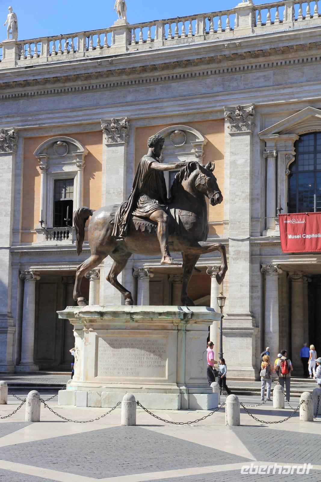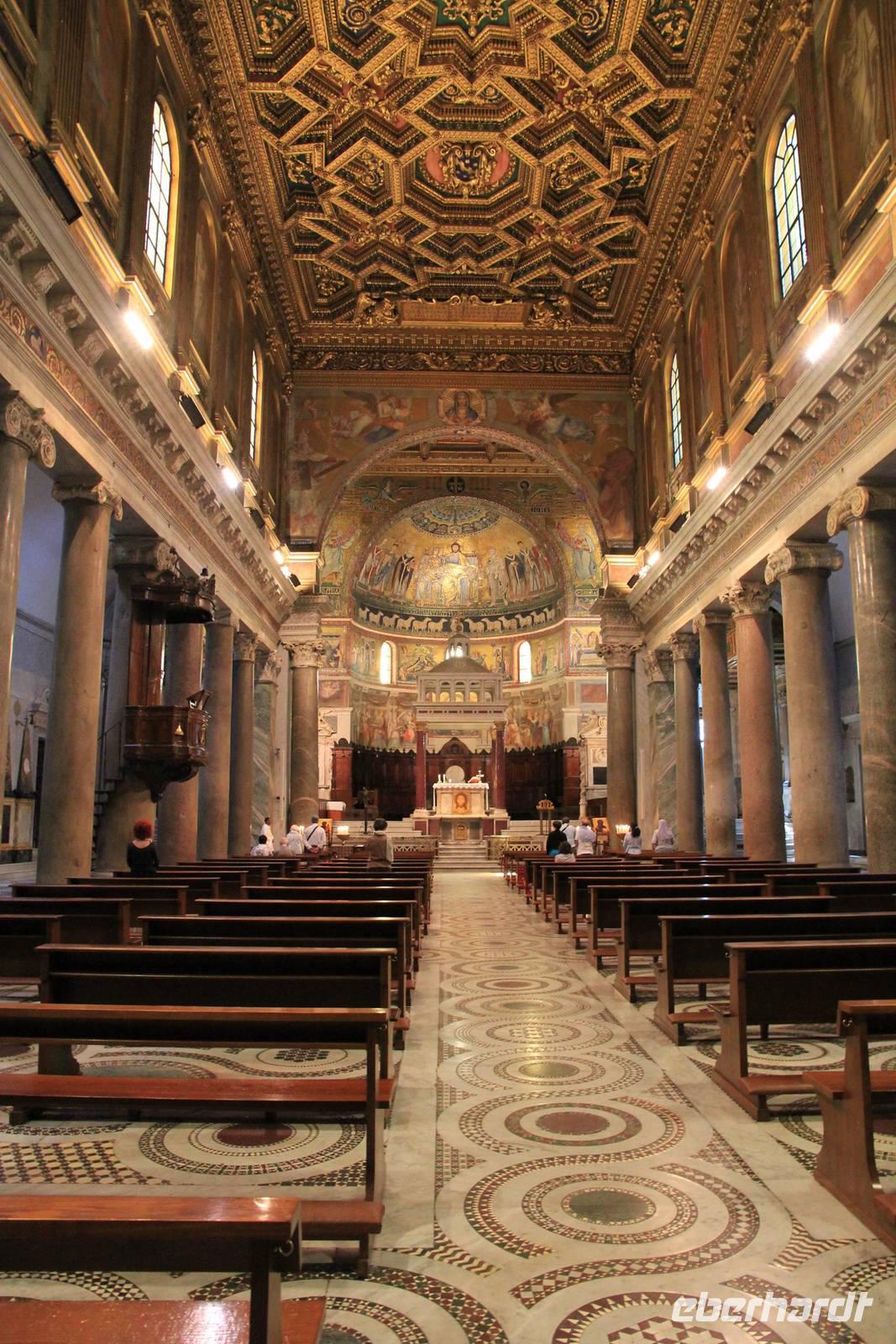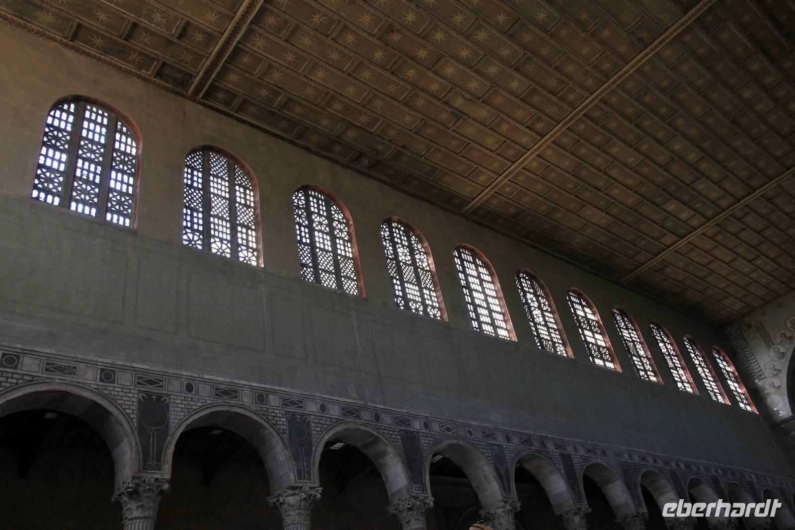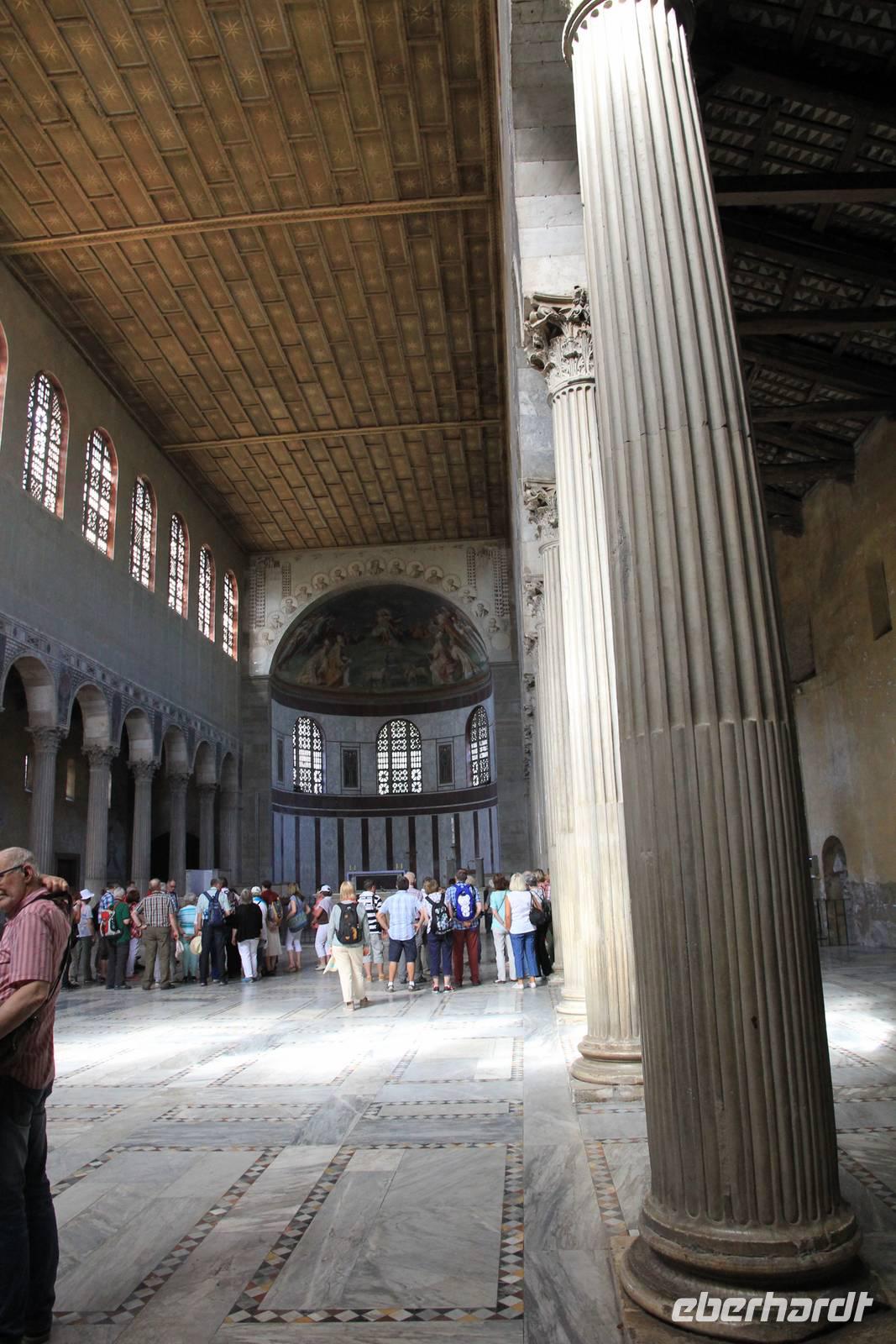 Unsere Studienreiseleiterin Agnieszka Berlin begrüßt uns nach dem Frühstück im ehemaligen Kreuzgang des Klosters, dem heutigen Empfangsbereich des Hotels Donna Camilla Savelli und wir starten mit einem Rundgang durch Trastevere und einer Straßenbahnfahrt bis zur Piazza Venezia. Von da besteigen wir über den von Michelangelo entworfenen Treppenaufgang, die Cordonata, den Kapitolshügel, lernen wir von Agnieszka, wie in der Antike und im Mittelalter Macht demonstriert und ausgeübt wurde und finden eigentlich keinen Unterschied zu Heute. Vom Caput Mundi, dem Haupt der Welt, geht es ins Forum Romanum und damit um republikanische und diktatorische Herrschaft zu Zeiten des Römischen Reiches und ihre ruinösen Reste, die wir uns mit Hilfe der bildhaften Erklärungen Agnieszkas zu einer antiken Metropole zusammenbauen. Vor unserem geistigen Auge agieren die Sabinerinnen und Etrusker, die Vestalinnen und Senatoren, Septimus Severus, Julius Cäsar und Augustus, Maxentius, Trajan, Antonius Pius und seine liebreizende Frau Faustina und natürlich Konstantin. Die Mittagssonne treibt uns zum Kolosseum, welches wir mit dem Fahrstuhl erklimmen. Einige von uns sind zum wiederholten Mal hier, aber wieder bestaunen wir die Geschichte menschlich-sozialer Leistung an diesem Bau. Nach einer Mittagspause mit Bruschetta und Cola light fahren wir per Straßenbahn zum Circus Maximus. Wir laufen weiter auf den Aventin, am blühenden Rosenpark auf dem ehemaligen jüdischen Friedhof vorbei, zur Dominikaner-Kirche Santa Sabina aus dem 5. Jahrhundert. Wir sehen die mit Blei gerahmten Selenitfenster - auch Marienglas genannt - und die ikonografisch reich geschnitzte Zedernholztüre aus dem Jahre 425. Vom Giardino degli Aranci steigen wir eine alte Straße, die Clivo di Rocca Savella, zum Tiber hinunter, den wir überqueren und Richtung Piazza Santa Maria in Trastevere verlassen. Die gleichnamige Kirche gehört zu den ältesten Gotteshäusern Roms und verbildlicht in seiner Innenausstattung den Übergang von ikonografisch-mittelalterlichen Darstellungen biblischer Ereignisse zur betonten Körperlichkeit und Menschlichkeit der bildenden Kunst der Renaissance. Nach einer kurzen Pause im Hotel geht es noch zum Fischessen ins Restaurant Vizi Capitali. Unser Schrittzähler verzeichnet heute über 15000 Schritte und 10 Kilometer.