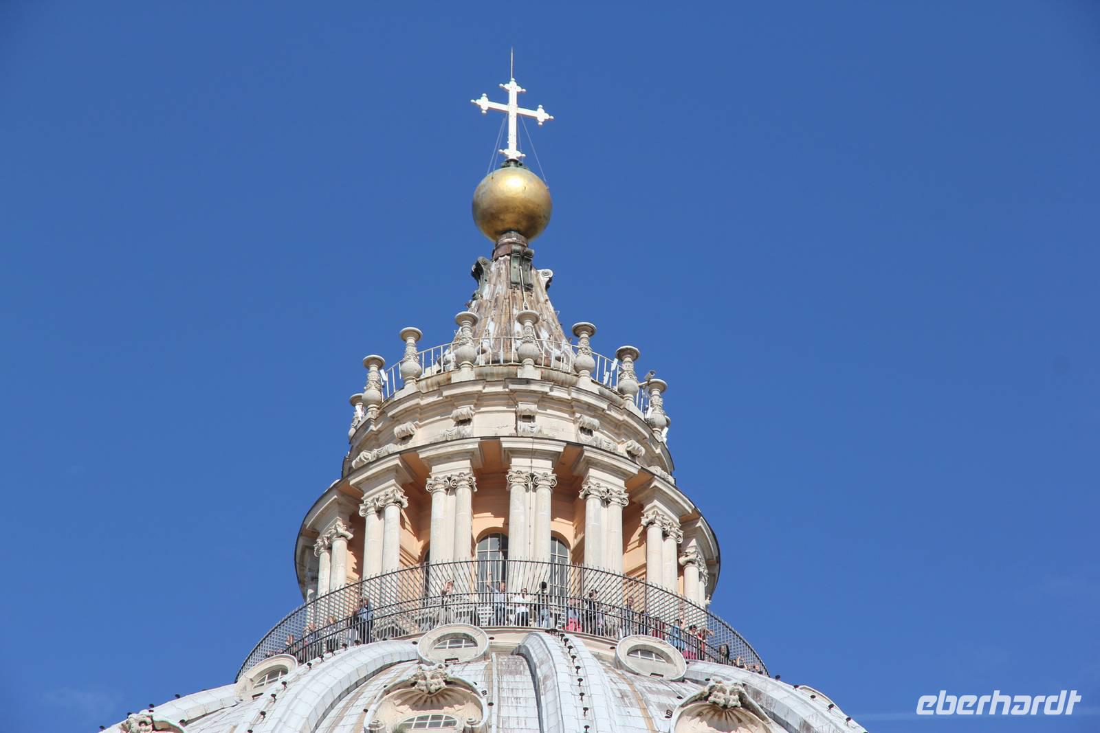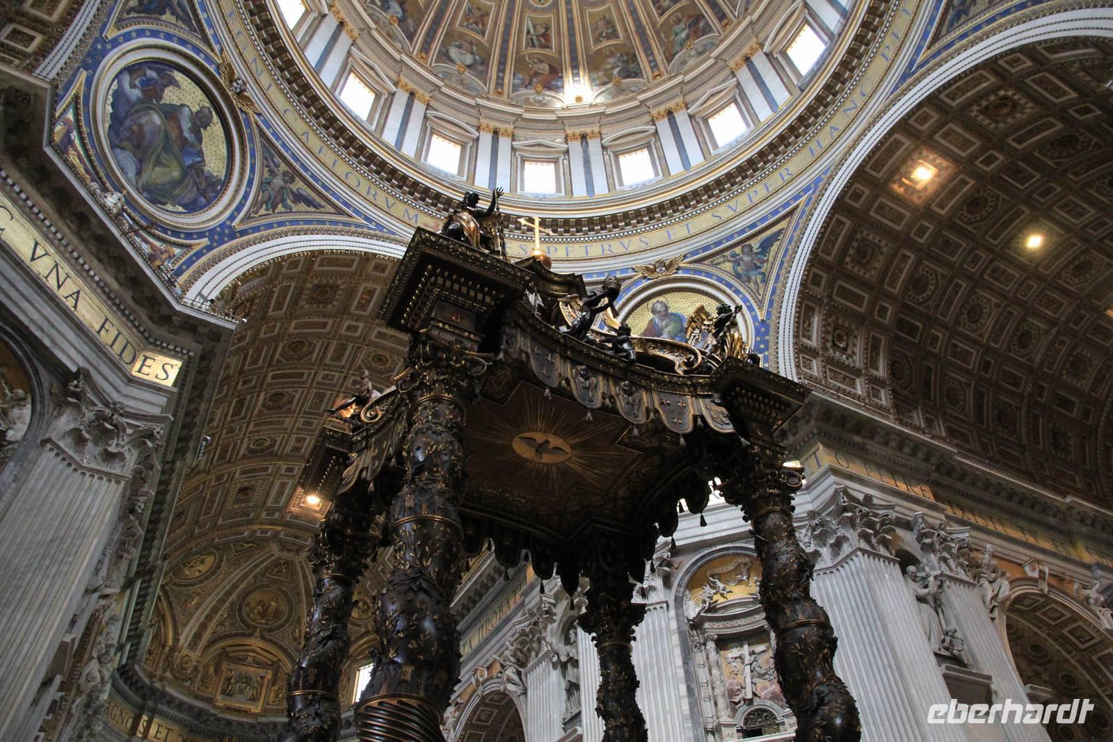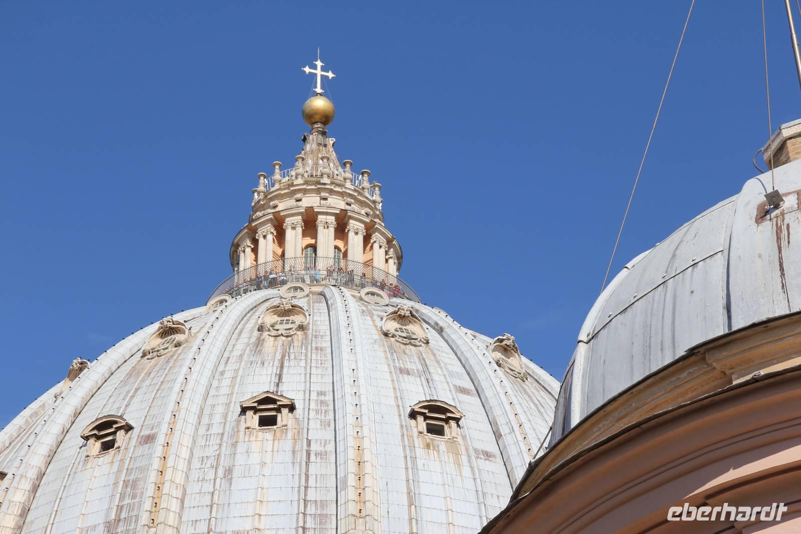 Wir starten zeitig mit einem Fußmarsch zum Petersplatz, um zu den ersten zu gehören, die die Laterne der Kuppel der Peters-Basilika erklimmen. Am beeindruckendsten dabei ist der Blick in das Kircheninnere auf das Grab Petri, dessen Bernini-Altar mit einem 28 Meter hohen Baldachin wie ein Spielzeug unter uns wirkt. Wir müssen nicht anstehen auf der Piazza S. Pietro, weil wir buchstäblich von oben kamen, d.h. mit dem Lift. Agnieszka führt uns in die Entstehungsgeschichte der größten Kirche der Christenheit ein, die von den genialsten Baumeistern und Künstlern der Renaissance - Michelangelogo, Raffael - und des Barock - Bernini und Borromini - erdacht, gebaut und geschmückt wurde. Die Pieta von Michelangelo ist unbestreitbar das beeindruckendste Kunstwerk unserer Besichtigung.
