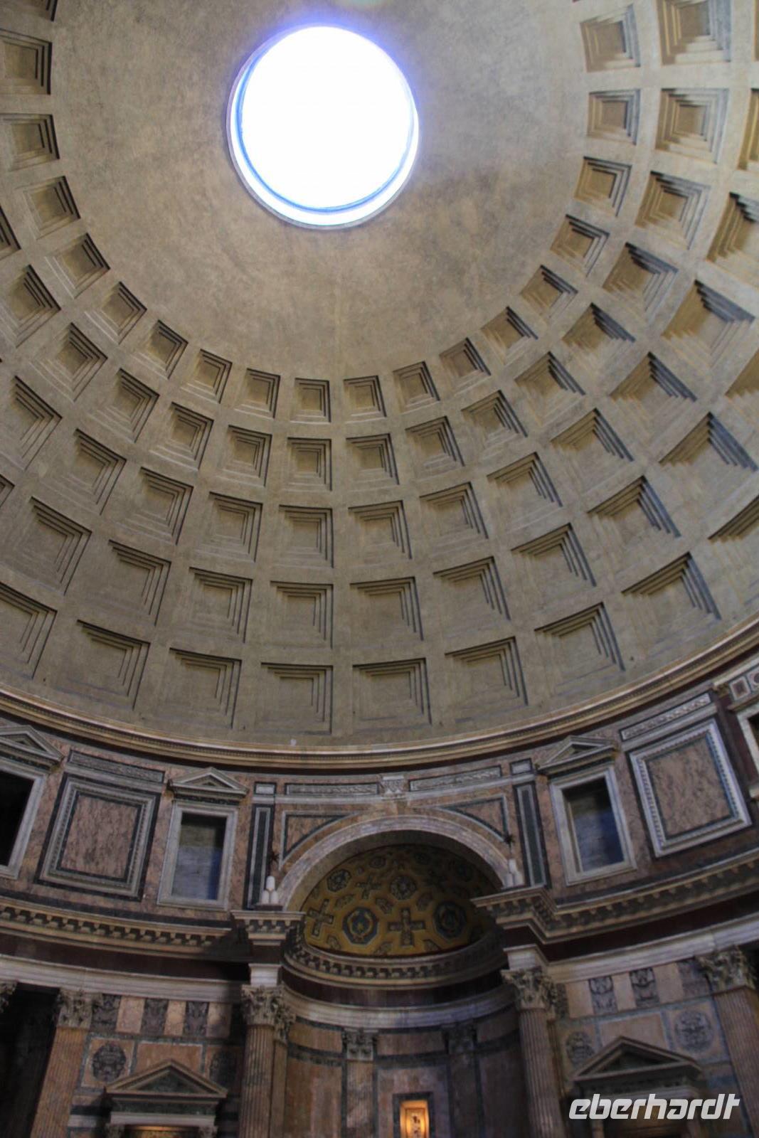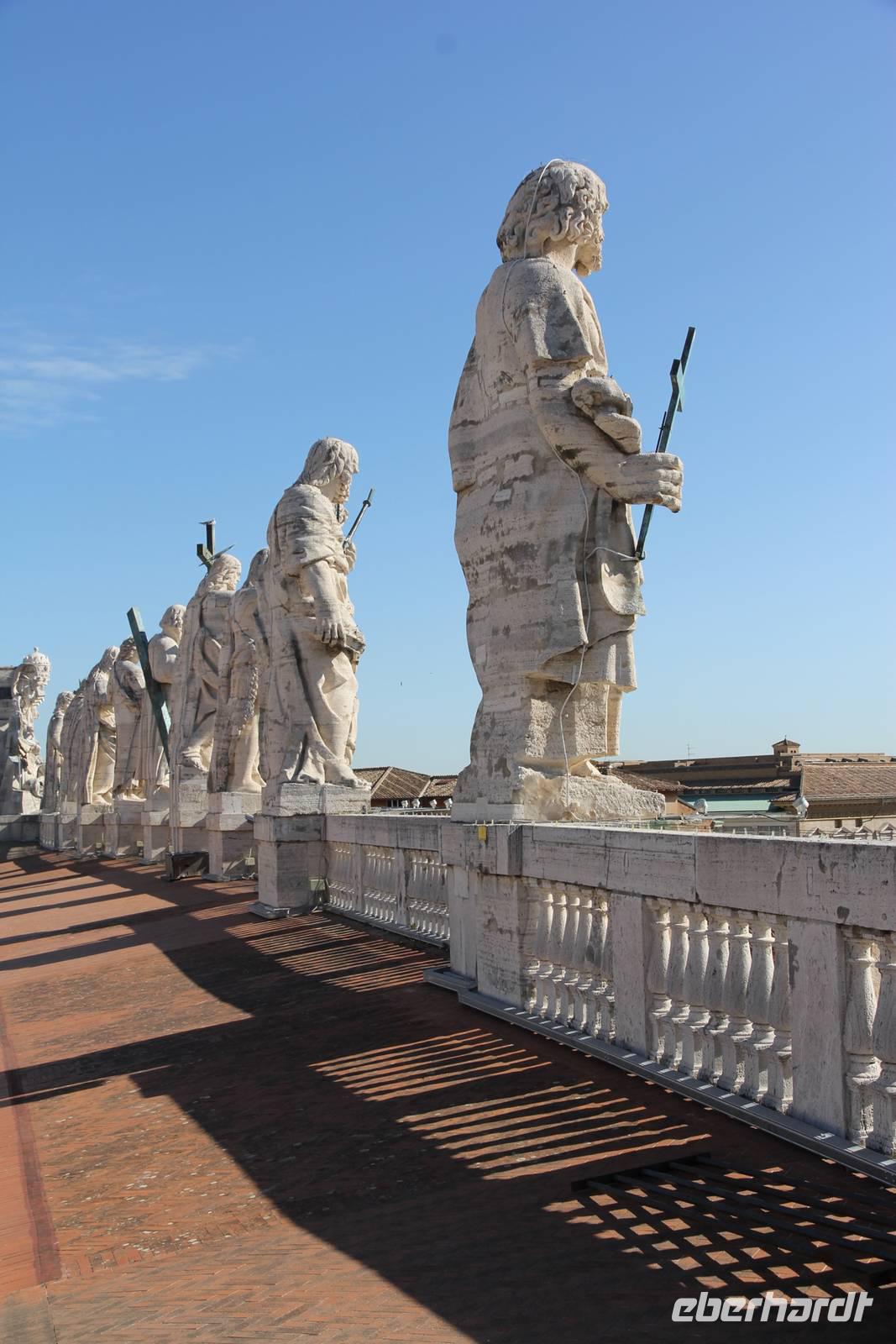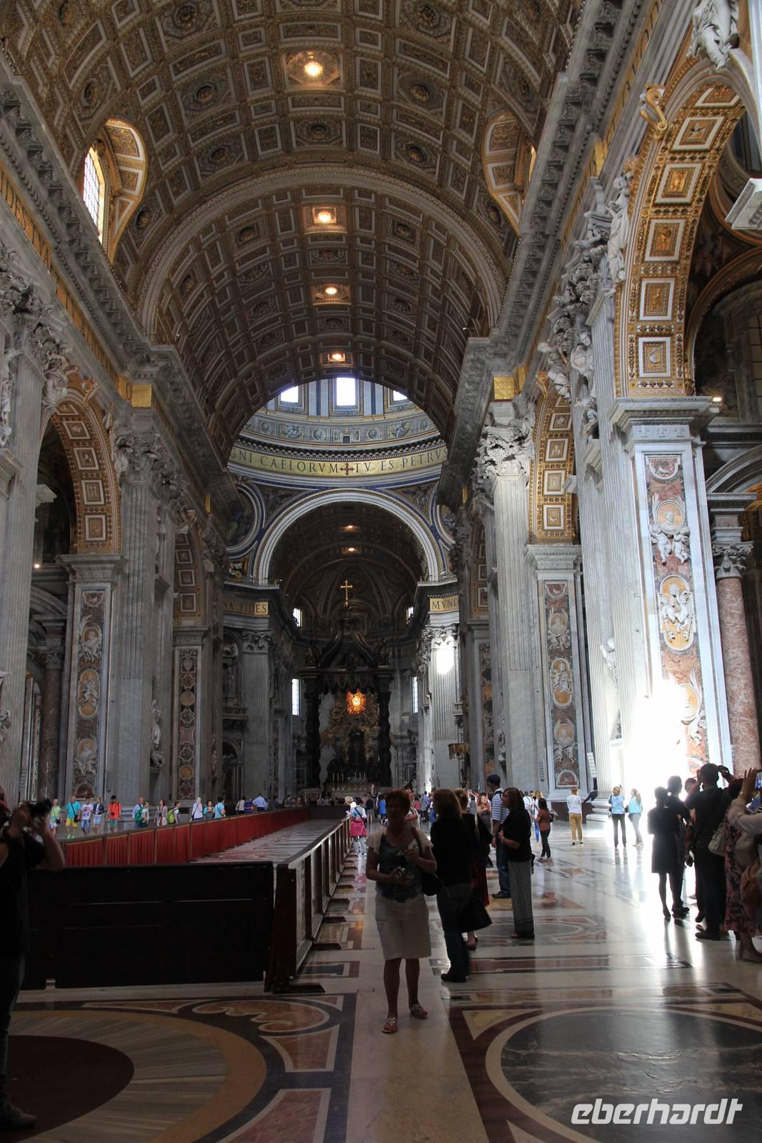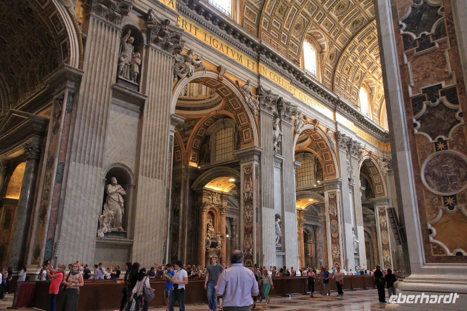 Wir starten zeitig mit einem Fußmarsch zum Petersplatz, um zu den ersten zu gehören, die die Laterne der Kuppel der Peters-Basilika erklimmen. Am beeindruckendsten dabei ist der Blick in das Kircheninnere auf das Grab Petri, dessen Bernini-Altar mit einem 28 Meter hohen Baldachin wie ein Spielzeug unter uns wirkt. Wir müssen nicht anstehen auf der Piazza S. Pietro, weil wir buchstäblich von oben kamen, d.h. mit dem Lift. Agnieszka führt uns in die Entstehungsgeschichte der größten Kirche der Christenheit ein, die von den genialsten Baumeistern und Künstlern der Renaissance - Michelangelogo, Raffael - und des Barock - Bernini und Borromini - erdacht, gebaut und geschmückt wurde. Die Pieta von Michelangelo ist unbestreitbar das beeindruckendste Kunstwerk unserer Besichtigung.