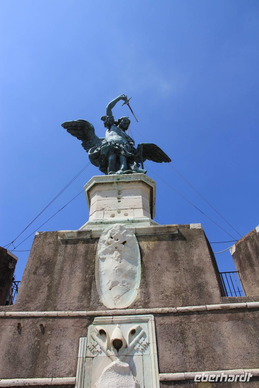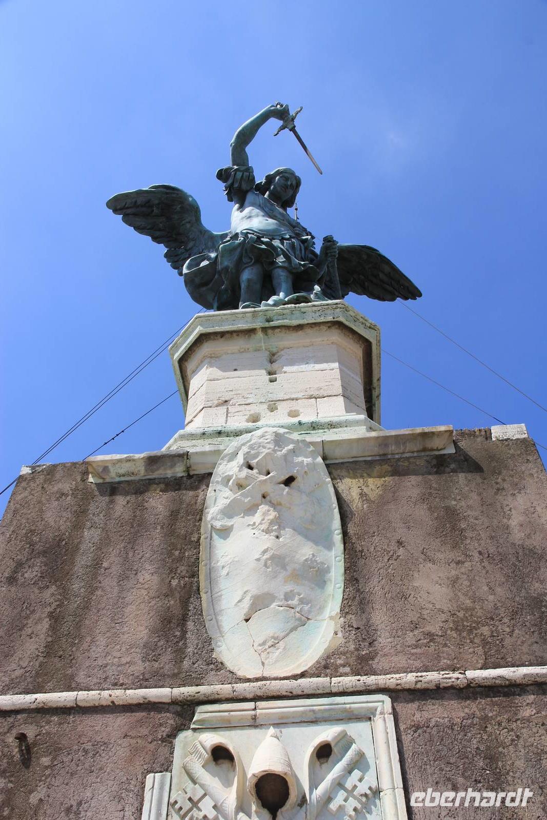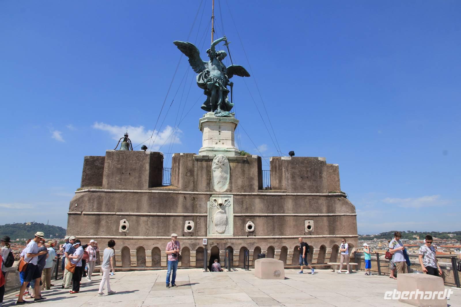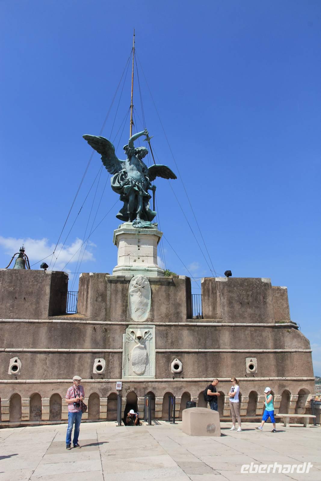 Nach einem Mittagsimbiss im Borgo steht die Engelsburg auf dem Programm. Das ehemalige Mausoleum des Kaisers Hadrian wurde im Laufe des Mittelalters zu einer Festung der Päpste ausgebaut, rettete 1527 dem Papst Clemens VII. das Leben, während die Bevölkerung Roms durch die Landsknechte des Herzogs von Bourbon ausgeplündert und dezimiert wurde. Erschrocken sind wir über die Umwidmung der Grabkammer Hadrians in ein Gefängnis, in dem die Gefangenen im Mittelalter in Eisenkörben hingen, starben und verwesten. Von der obersten Plattform unter dem schwertführenden Erzengel Michael haben wir bei schönstem Sonnenschein einen Rundblick auf die Vatikanstadt und Rom.