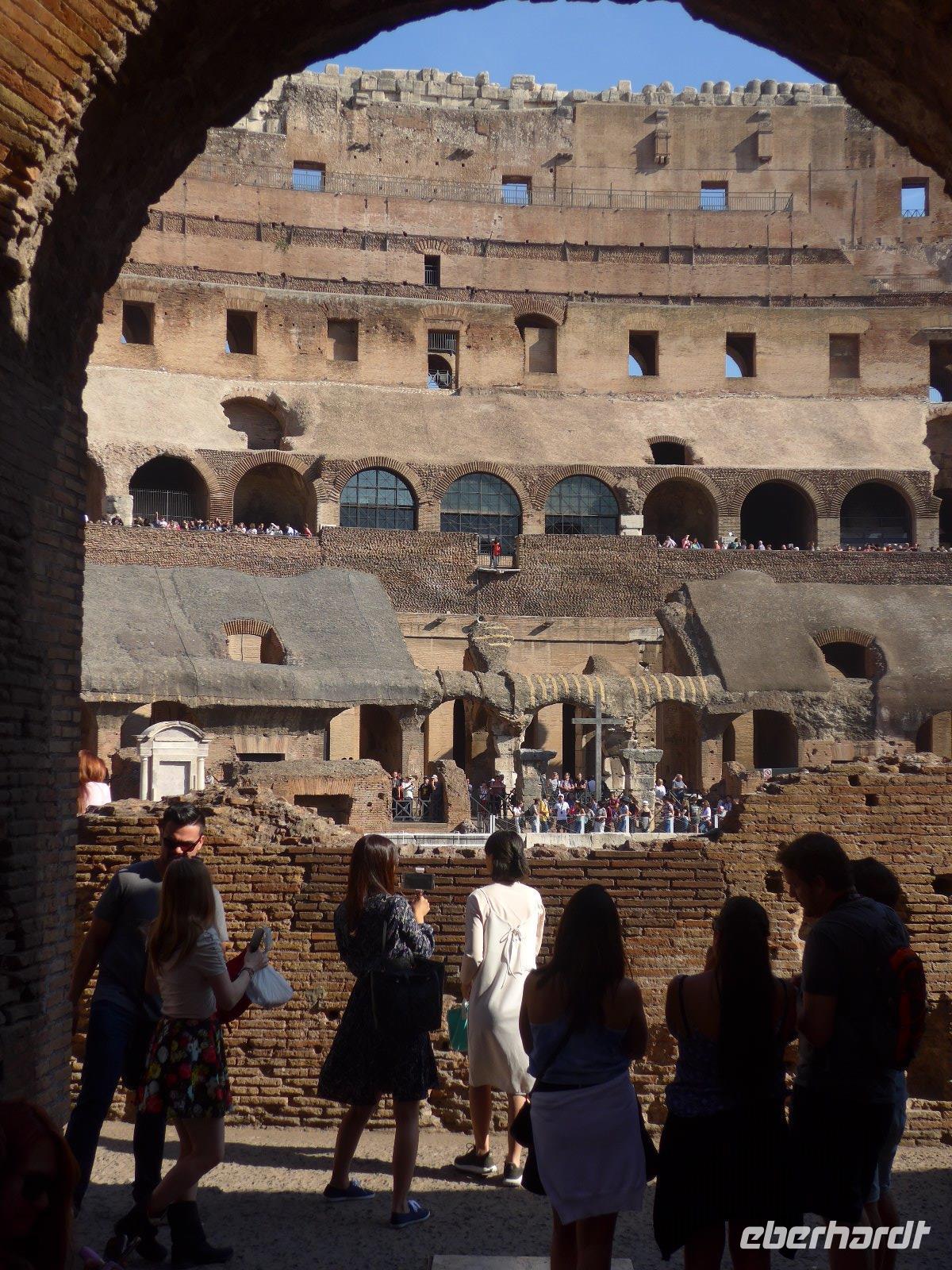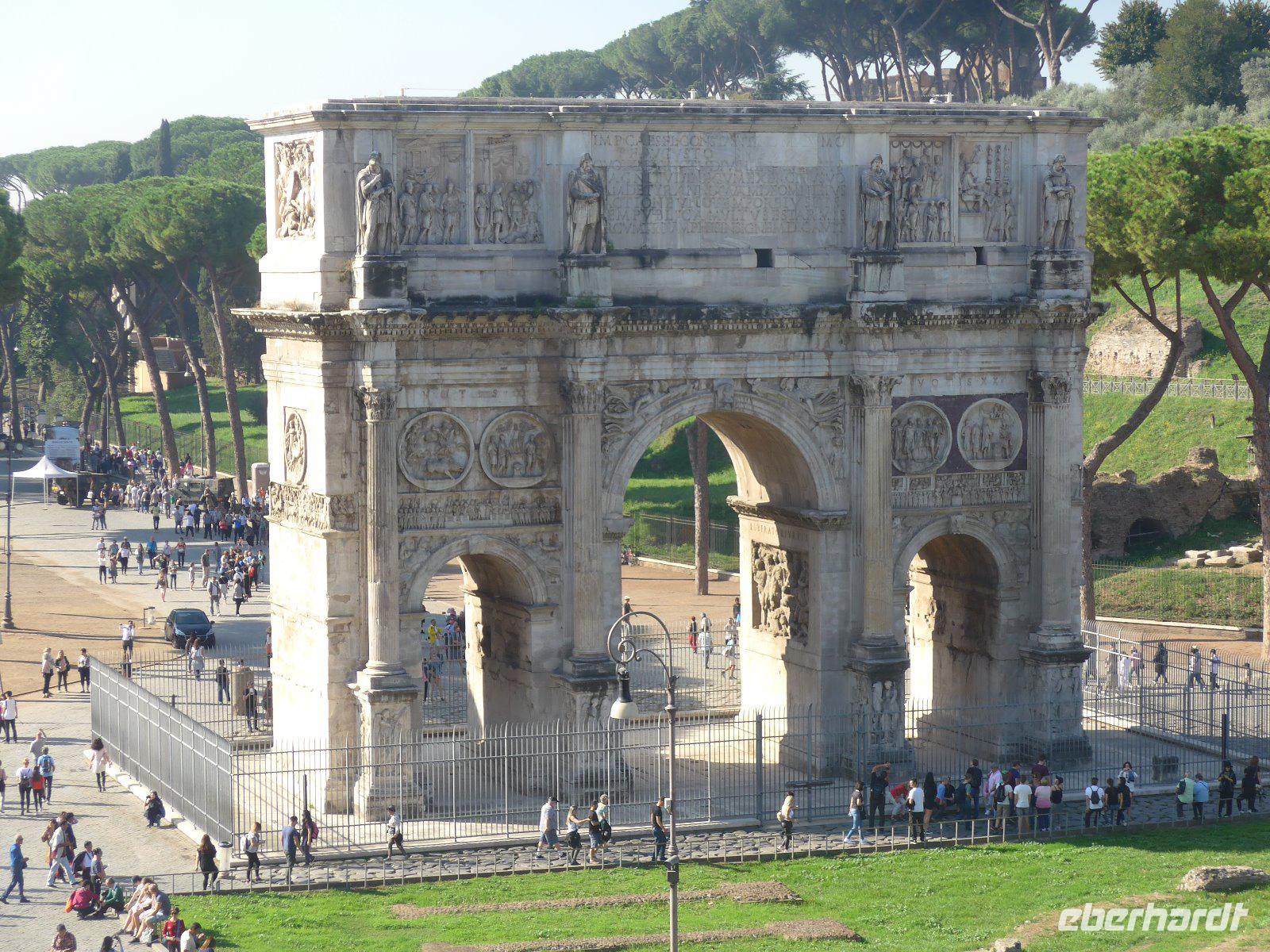 Nach Luft schnappend erreichten wir schließlich das einstige Machtzentrum des römischen Imperiums. Bei einer Besichtigung des Kolosseums wird uns die Größendimension dieses Baues so richtig deutlich. Heute so friedlich anzusehen haben leider in der Antike viele Menschen und Tier hier ihr Leben gelassen. Gleich daneben der prächtige Konstantinbogen. Er ist wohl der prächtigste unter den drei noch erhaltenen antiken Triumphbögen Roms. Heute ist er eines der vielen Wahrzeichen Roms und auf vielen Postkarten darf er deshalb natürlich nicht fehlen. Entlang der Via Sacra hatten wir schon einen schönen Blick auf Titusbogen und Forum Romanum, dass wir als nächstes besichtigten. Ob Kurie, Rosta oder der Septimius-Severus-Bogen zu vielen einstigen wichtigen Gebäuden konnte unsere Stadtführerin etwas berichten. Kurioses u. Faktenwissen sorgten dafür, dass man einen eindrucksvollen Einblick ins Leben der antiken Stadt Rom und ihrer langen Geschichte hatte. Dann hatten wir eine Mittagspause nötig. In der Nähe der Kaiserforen durch schmale Gassen erreichten wir das Domizil unserer Mittagspause. Kurz vorher noch einen Abstecher in eine Musikreparaturwerkstatt, die stellvertretend für so manches altes Ladenlokal stand. Gestärkt konnte der Nachmittag beginnen. Kaiserforen, Kapitolshügel, Circus Maximus, Rosengarten, Orangengarten bis zur Cestia Pyramide. Dort war die Kraft zu Ende und nur ein Eis konnte uns Retten die Rückfahrt zum Hotel zu überstehen. Das Abendessen in einer netten Trattoria wurde mit einem Aperitif eingeleitet und mit einem guten Essen beendet.