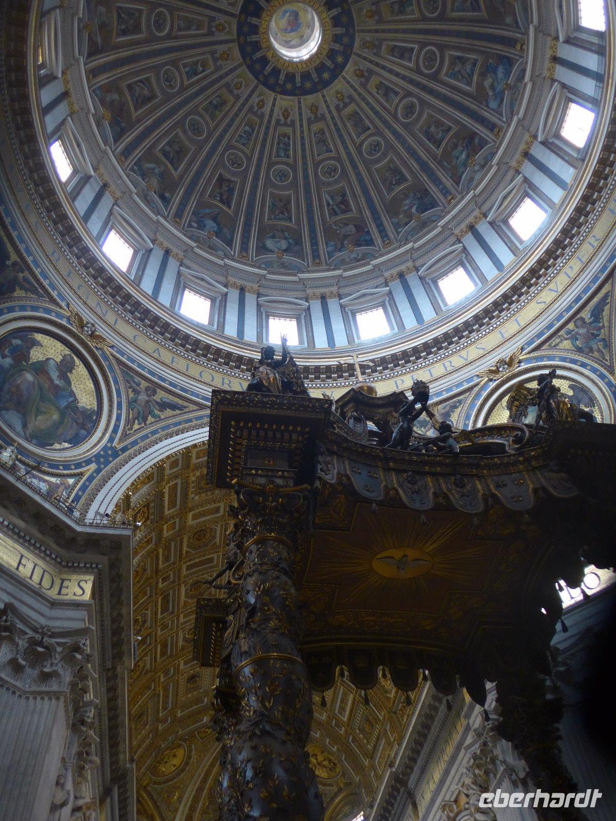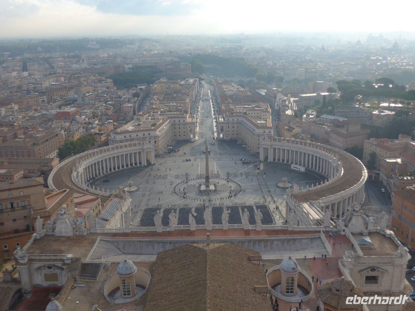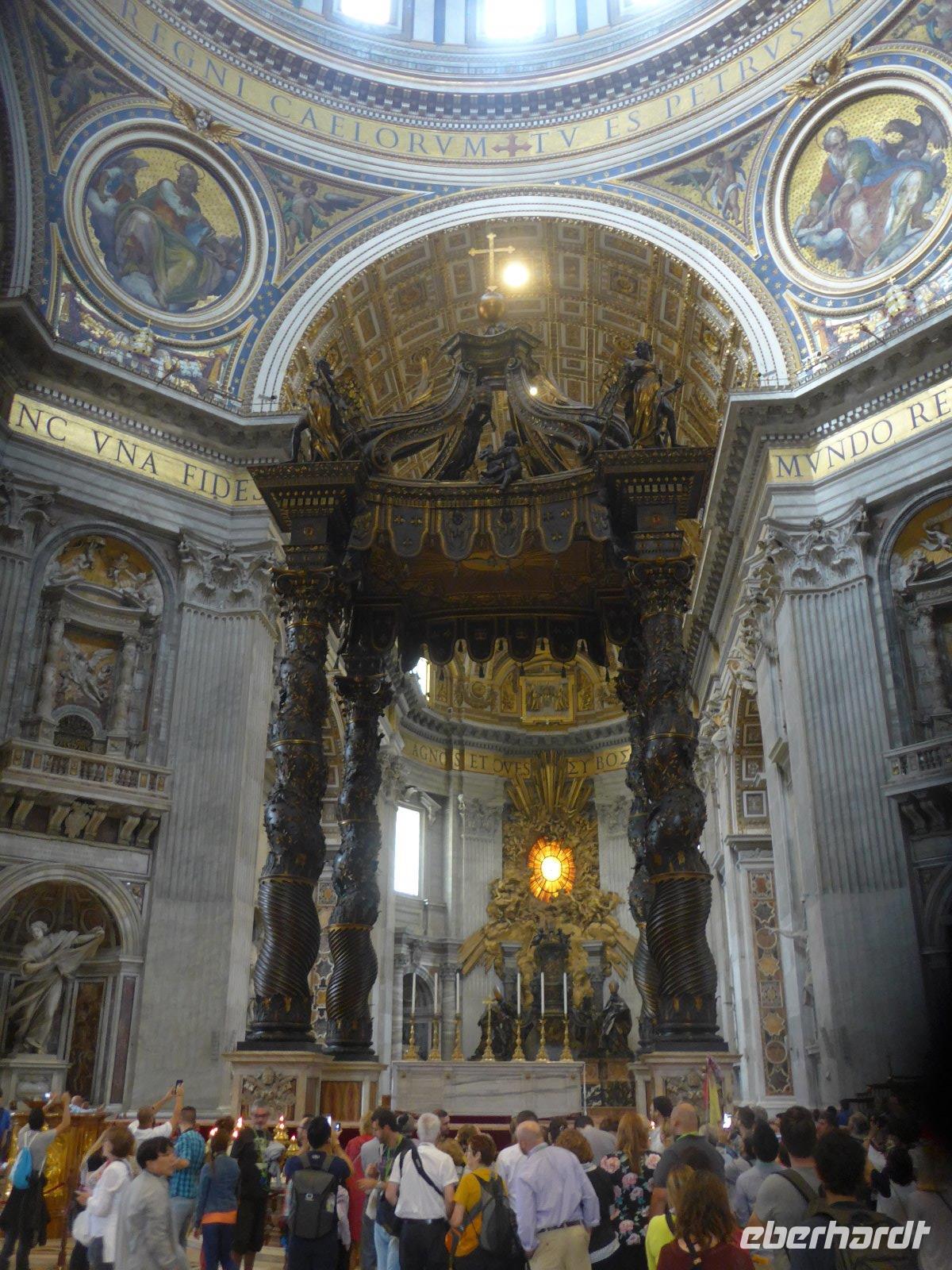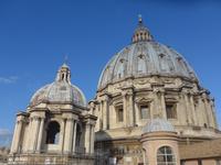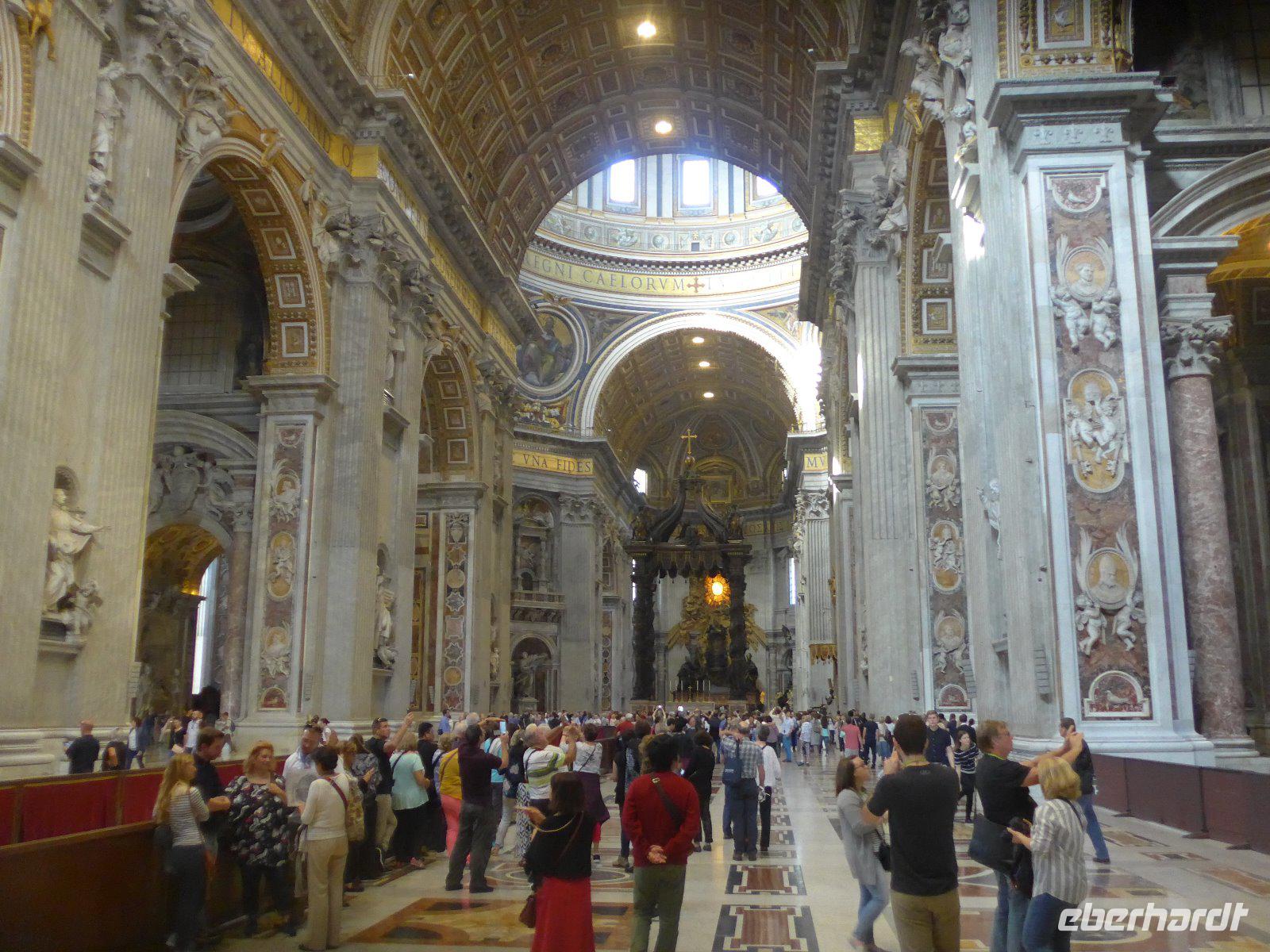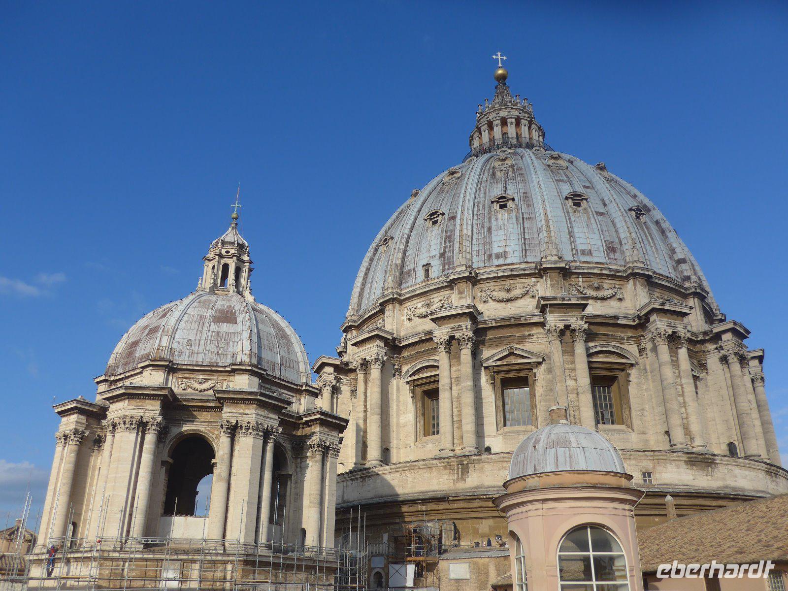 Heute führte uns der Weg in den Kirchenstaat. Es ist wohl für jeden der Höhepunkt seiner Romreise, vor der größten Kirche der Welt zu stehen. Sehr zeitig stellten wir uns für die Besichtigung der Kuppel an. Nach Liftfahrt und zahlreichen Treppen wurden wir mit einem herrlichen Blick über den Vatikanstaat u. ganz Rom entschädigt. Vorher ein gigantischer Blick aus der Kuppel in das Innere der Kathedrale. Menschen wirken aus dieser Perspektive wie Ameisen. Dann hinunter und dann standen wir selbst in der Basilika. Einst am Grab von Apostel Petrus ließ Kaiser Konstantin eine erste Basilika errichten. Der heutige Bau entstand nach einer wechselvollen Baugeschichte. Auch wir waren von der symbolträchtigen Basilika beeindruckt. Ob Pieta, Kuppel oder Baldachin. Bei solchen Kunstwerken erscheint der Mensch verschwindend klein. Zu dieser Zeit konnte man den Blick auf die wichtigsten Dinge im Petersdom problemlos erhaschen. Bei so viel Glanz verblassen oft die dazugehörigen Erläuterungen. Und als wir vor dem Baldachin standen und zur Kuppel hoch schauen wir das Können der damaligen Baumeister so richtig deutlich. Ob Bramante, Rafael, Bernini oder Michelangelo - alle hatten sich hier unsterblich gemacht. Am Petersplatz mit seinen berühmten Kolonnaden von Bernini angekommen legten wir die wohlverdiente Mittagspause ein.