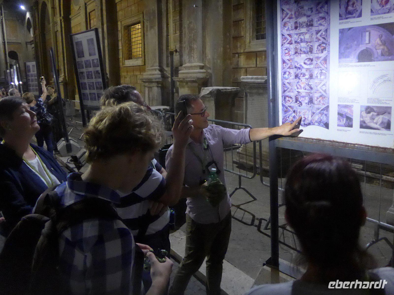 Wer kennt nicht den Thriller von Dan Brown „Illuminati". Dem geheimen Verbindungsgang zwischen Vatikan und Engelsburg wurde im gleichnamigen Film sogar eine Filmszene gewidmet. Diesem Weg folgend kamen auch wir zum päpstlichen Schutz- u. Ausweichquartier, das eigentlich als Grabmal für Kaiser Hadrian konzipiert war und später zur Festung umgebaut wurde. Sie diente den Päpsten als Schutz vor Gefahren. Wir hatten nun die Gelegenheit und unter fachkundiger Leitung das Innere zu ergründen und waren von den einst luxuriösen Gemächern fasziniert. Am Ende der Führung wurden wir mit einer schönen Aussicht auf Rom und den Tiber mit der Engelsbrücke entschädigt. Im letzten Gang ging es über die Engelsbrücke in Richtung Campo di Fiori, Palazzo Farnese bis zur Kirche St. Maria in Trastevere. In dieser schönen Kirche ging vorerst unser heutiges Programm zu Ende. Es war dringend eine Stärkung notwendig. Wo könnte man das besser realisieren als in Trastevere. Gestärkt ging es zur abendlichen Führung in die vatikanischen Museen. Deutlich weniger Menschen aber manchmal mussten wir dennoch mit vielen Touristen die wichtigsten Kunstwerke teilen. Ausgewählten Kunstwerken wie z. B. der Apollo-Statue oder Lakoonstatue aber auch den Wandteppichen, von denen einige aus dem 16. Jh. stammen, erzählen reichlich Geschichte. Auch auf die Besonderheit der Kartendarstellungen des Landes Italien in einem erhabenen Gang wurden wir aufmerksam gemacht. Denn die Betrachtung in der Darstellung ging von Rom aus und somit steht der südliche Teil auf dem Kopf. Am Ende stand wir in der Sixtinische Kapelle, mit ihren Fresken von Michelangelo. Wir hatten genügend Luft u. Zeit diese Kostbarkeiten zu betrachten bevor wir uns durch unzählige Räume zurück zum Ausgang bewegten. Nun war die Luft raus und wir waren froh als wir das Hotel erreichten.