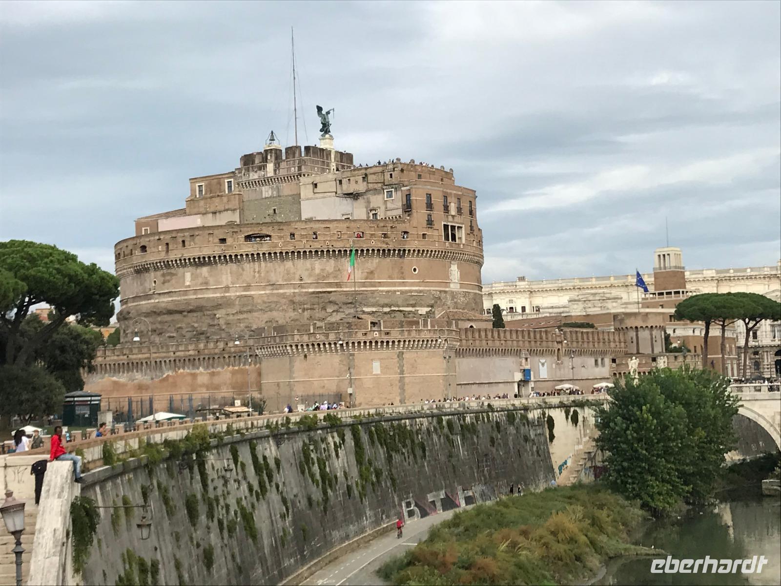 Wir mühen uns die hohen Stufen hinauf und genießen von oben den herrlichen Ausblick, ehe es dann zu Fuß mit diversen Pausen für Pasta, Kaffee oder Eis wieder richtig Hotel geht. Die Uferwege am Tiber entlang sind verlässliche Wegweiser bis zur Engelsburg.