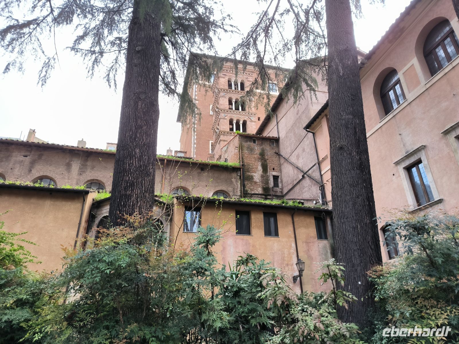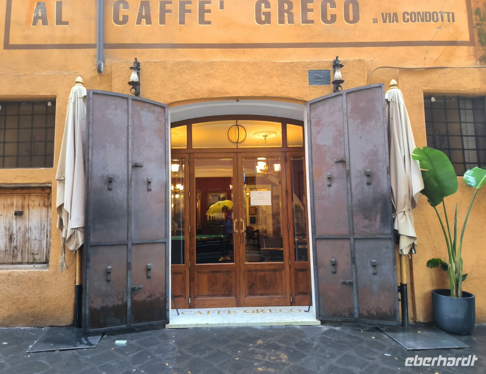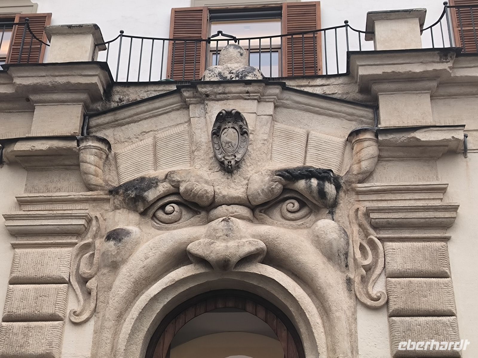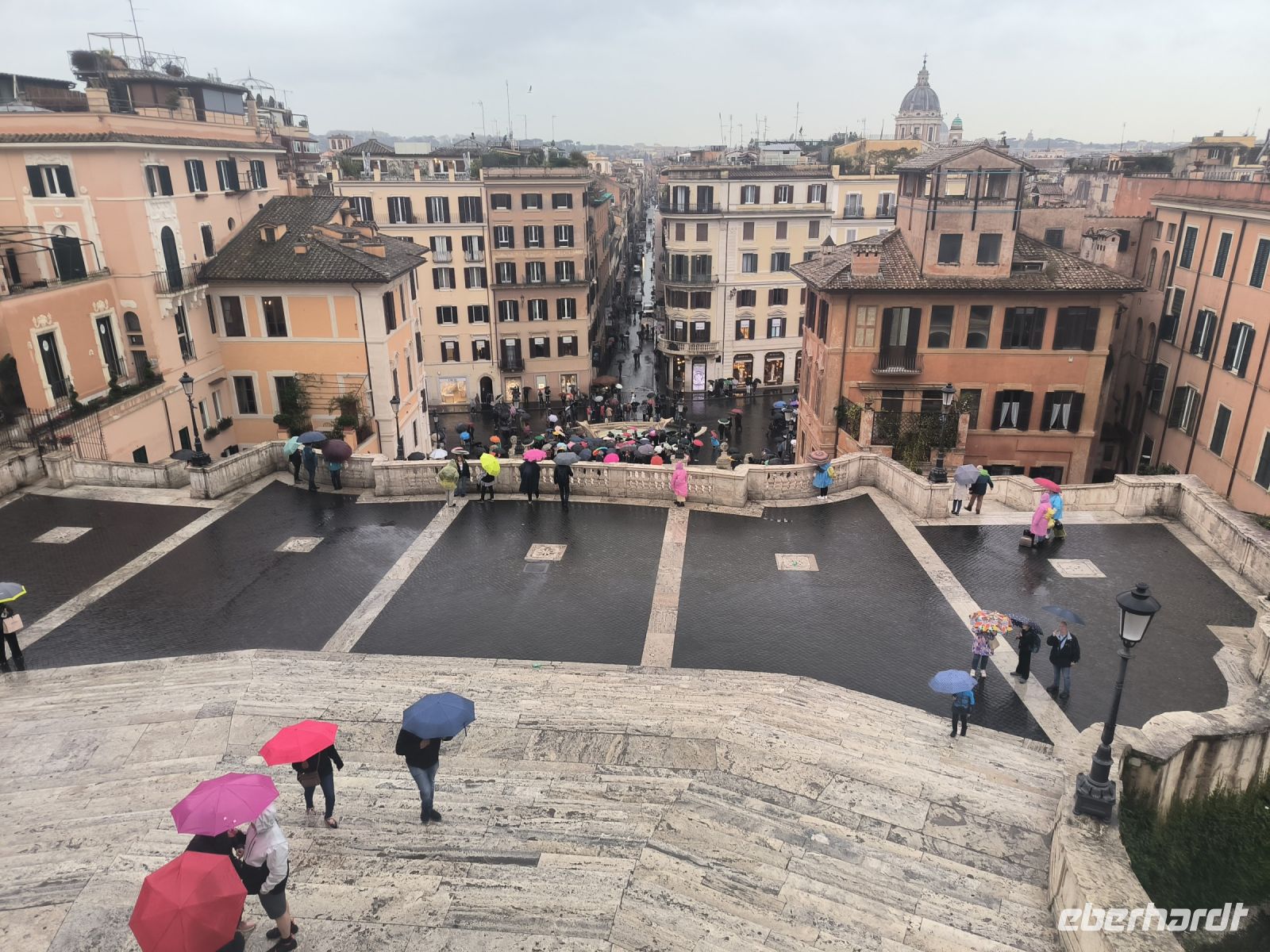 Natürlich wäre der Pincio Park im Sonnenlicht schöner, aber wir können die herrliche Parkanlage und den Ausblick zum Petersdom erahnen. Vorbei an der Villa Medici gehen wir zur Kirche Trinitá die Monti, die hoch über der Spanischen Treppe thront. Daneben steht das Hotel Hassler, wo man zum Schnäppchenpreis von 1.700 Euro pro Nacht ein Zimmer mieten kann. Unweit davon eines der interessantesten Gebäude Roms, der Palazzo Zuccari aus dem 16. Jh., dessen Eingangstür und Fenster den Fratzen von Ungeheuern nachempfunden sind. Doch dann schreiten wir – immer noch unter unseren Regenschirmen – die Spanische Treppe hinunter.