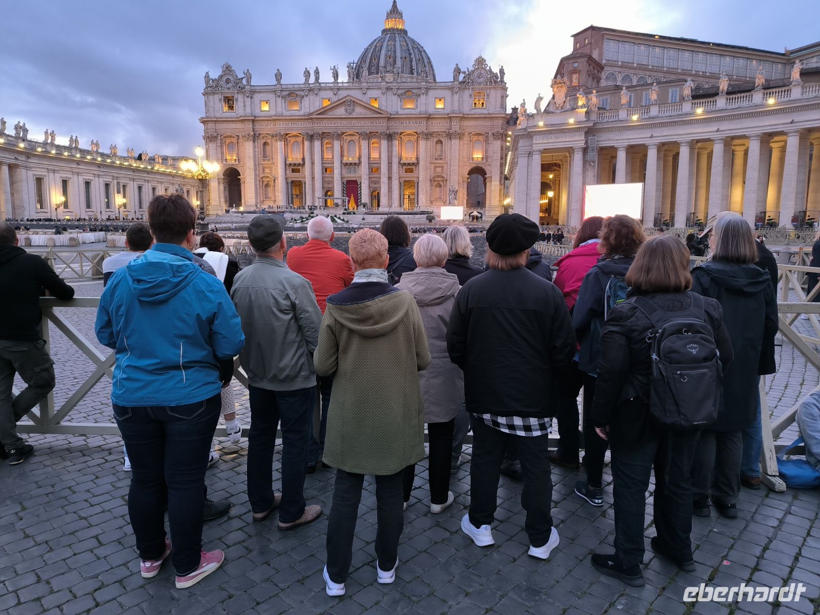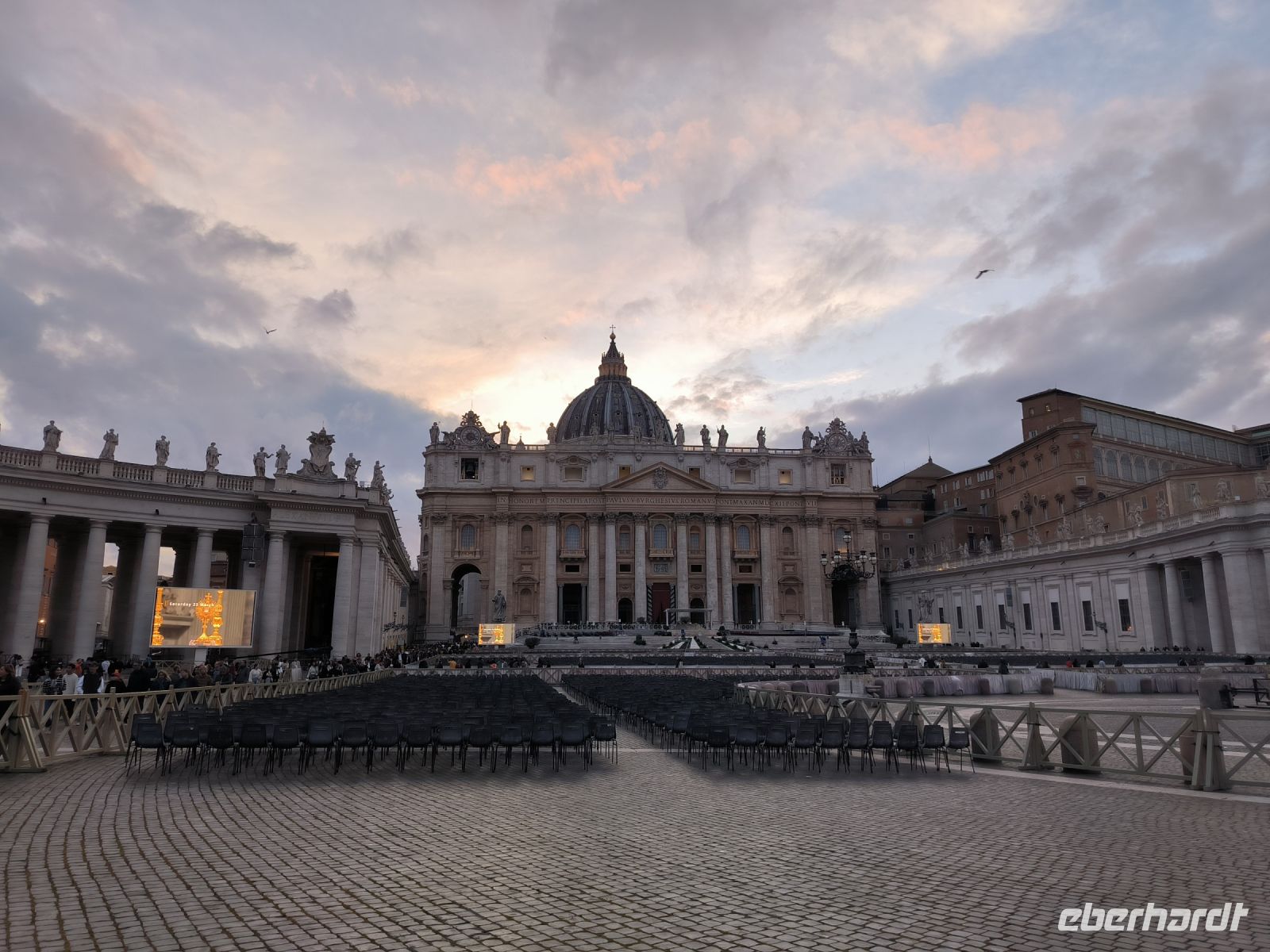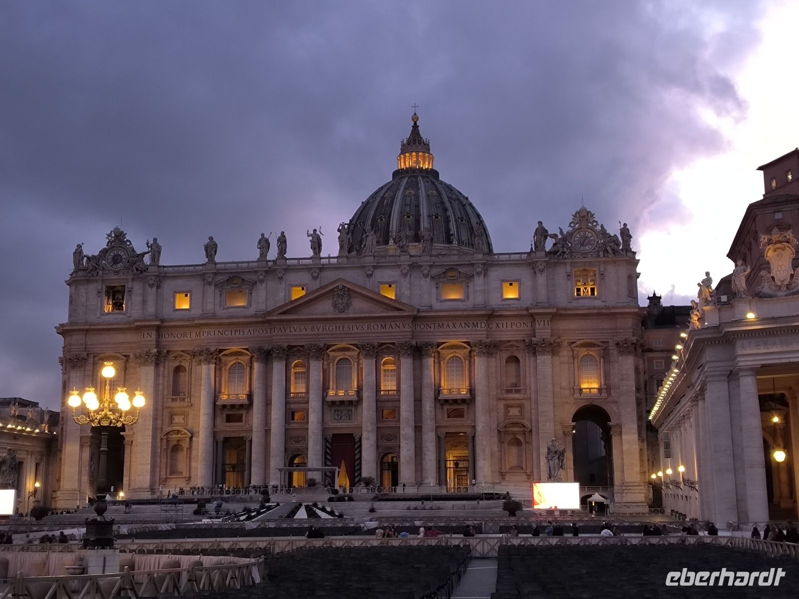 Bei einem ersten Abendspaziergang lernen wir schon einmal den Peterplatz kennen. In der blauen Stunden sehen wir, wie schon alles für die Messe zum Palmsonntag vorbereitet wird. Nach und nach erstrahlen die Lichter und die Piazza San Pietro sowie der Dom entfalten ihre Aura.