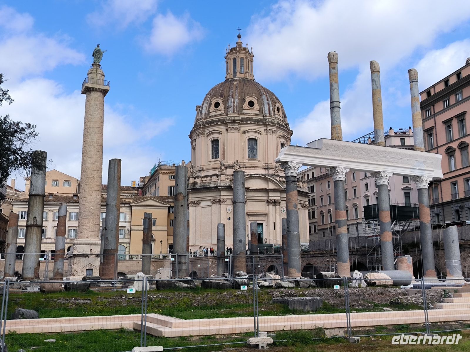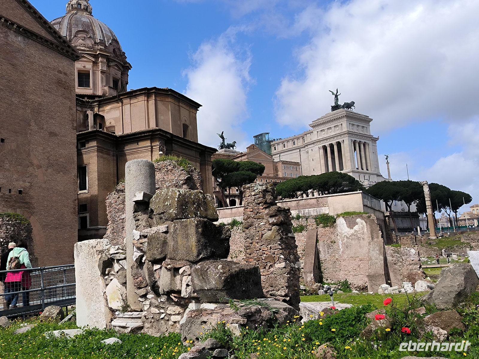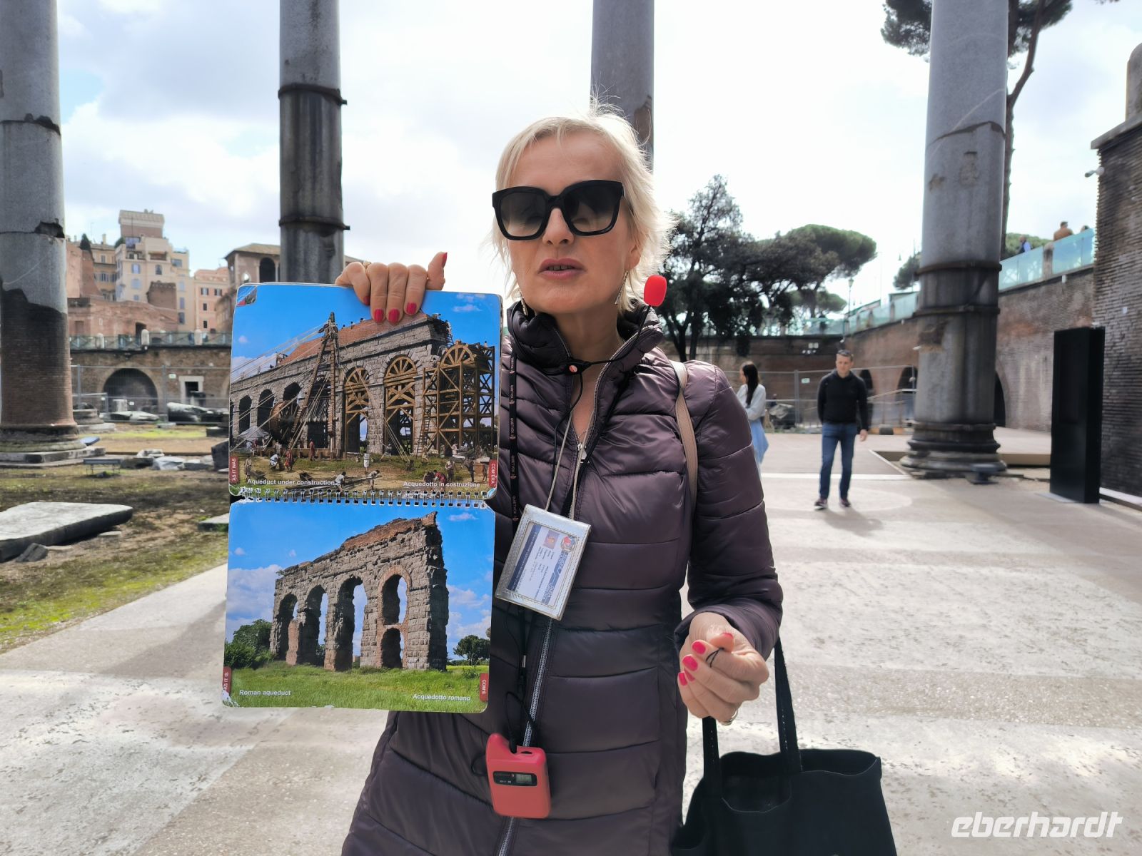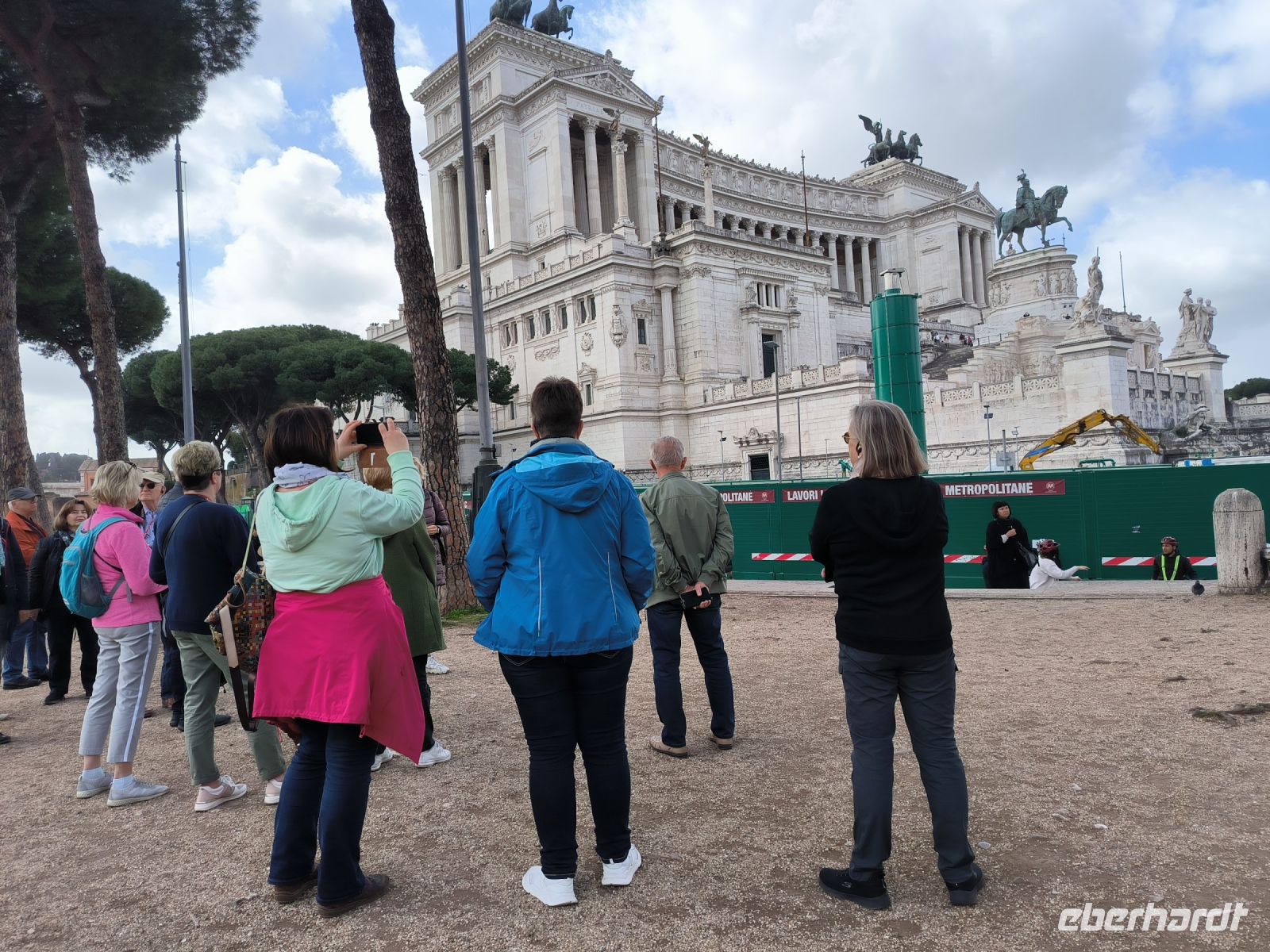 Das Frühstück im Hotel können wir entspannt genießen, dann bekommen wir unsere wirklich praktischen Audiogeräte und nehmen den Bus Linie 916 in die Stadt. Wir fahren bis zur Piazza Venezia und Heike zeigt uns als erstes eine kleine „Oase“ im Großstadttrubel – den Garten im Palazzo Venezia. Auf der Piazza ist gerade eine Metro – Großbaustelle. Wir müssen den Bauzaun umrunden, um an der Trajanssäule unsere Stadtführerin Sylvia zu treffen. Dort beginnt unsere Führung im Forum Romanum. Es ist unglaublich beeindruckend, was vor über 2.000 Jahren geschaffen wurde, welche Zivilisation und staatliche Ordnung bereits vorhanden war. Und wie toll, dass wir so viel davon noch sehen können, auch wenn natürlich viel Phantasie gefragt ist.