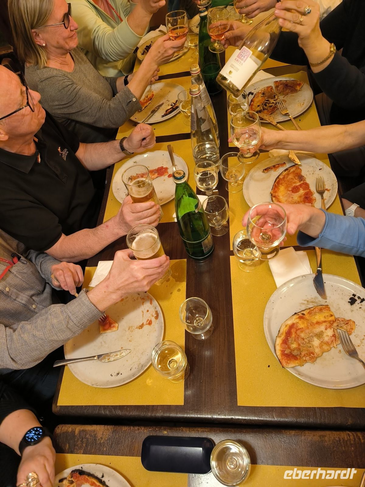 Schon bald ist es Zeit für das Abendessen, das uns in der typisch römischen Pizzeria Alle Carrette erwartet. Es gibt eine Bruschetta, wir können uns aus der Karte eine Pizza nach Wahl aussuchen und auch ein Dessert, z.B. Tiramisú oder Panna Cotta. Sogar einen prominenten Gast entdecken wir unter den Gästen, nämlich den Luxemburgischen Wissenschaftsautor und Fernsehmoderator Ranga Yogeshwar. Danach geht es mit dem Bus zurück zum Hotel.