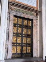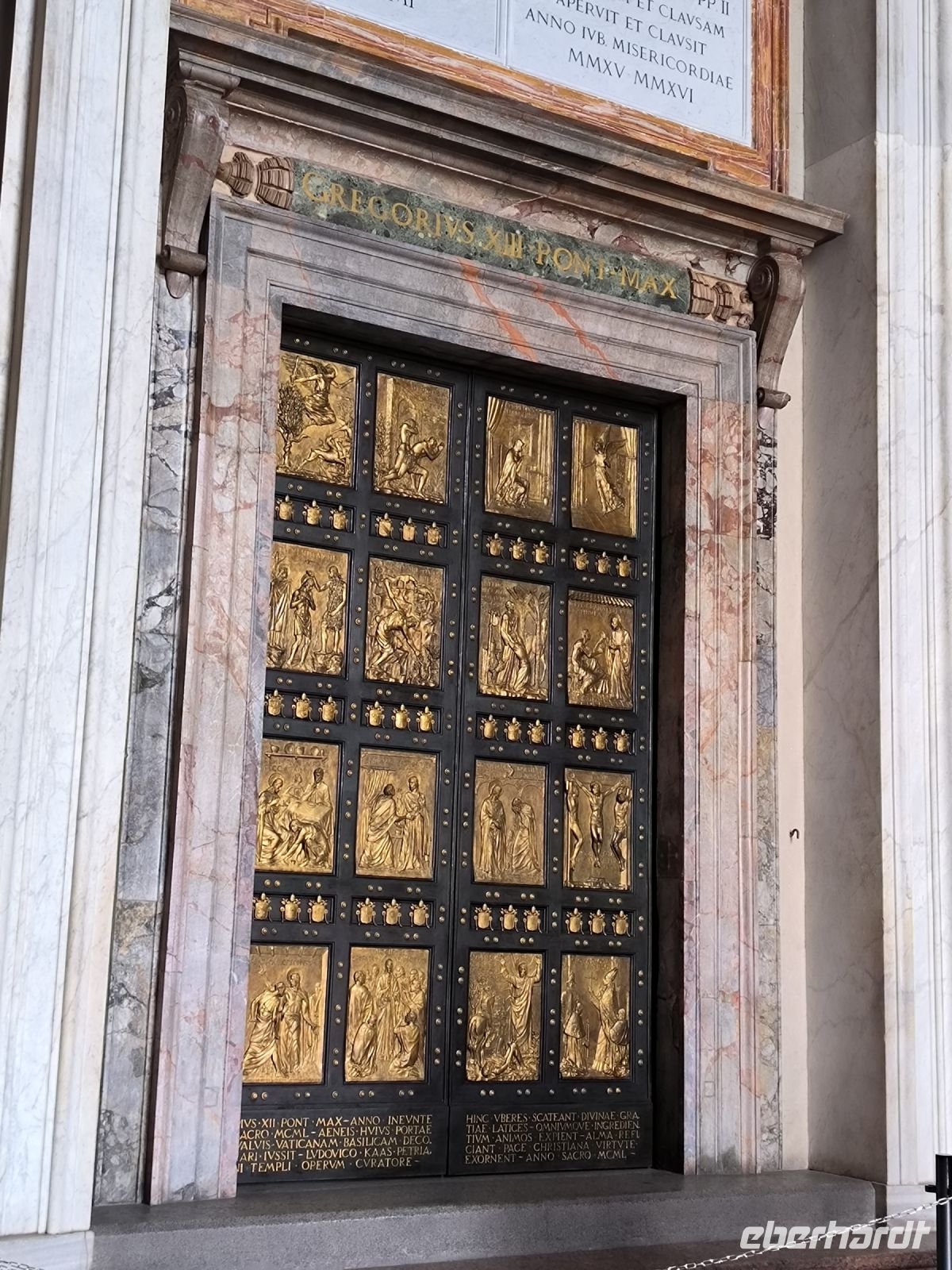 Doch es noch nicht genug: durch einen Sonderzugang können wir – wiederum vorbei an der langen Wartschlange - in den Petersdom. Wir sehen die Goldene Pforte, die hinten zugemauert ist und nur aller 25 Jahre geöffnet wird. Nächstes Jahr zum Jubiläum ist es wieder soweit. Der Petersdom ist nicht nur riesig – viel größer als z.B. der Kölner Dom – er ist auch prachtvoll gestaltet. Um die Gemälde nicht der klimatischen Verwitterung auszusetzen, hat man hier mit Glasmosaiken gearbeitet. Große, eindrucksvolle Marmorstatuen scheinen auf uns herabzuschauen. Wir sehen zum Beispiel den Sarkophag von Gregor XIII, den man durch die auf ihn zurückgehende Kalenderreform kennt, die noch heute als Gregorianischer Kalender gültig ist.