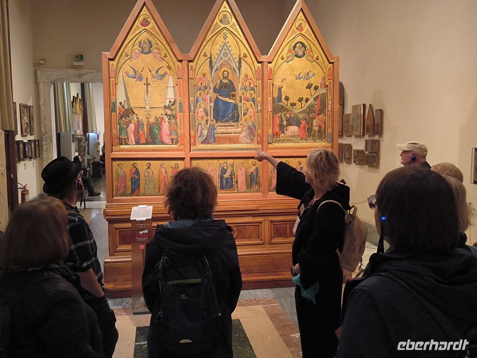 Im Anschluss treffen wir Sylvia, die uns durch die Museen führt. Wir beginnen in der Pinakothek. Hier sehen wir Meisterwerke der berühmtesten Persönlichkeiten der italienischen Kunstgeschichte, darunter Giotto, Perugino, Raffael, Leonardo, Tizian, Veronese und Caravaggio.