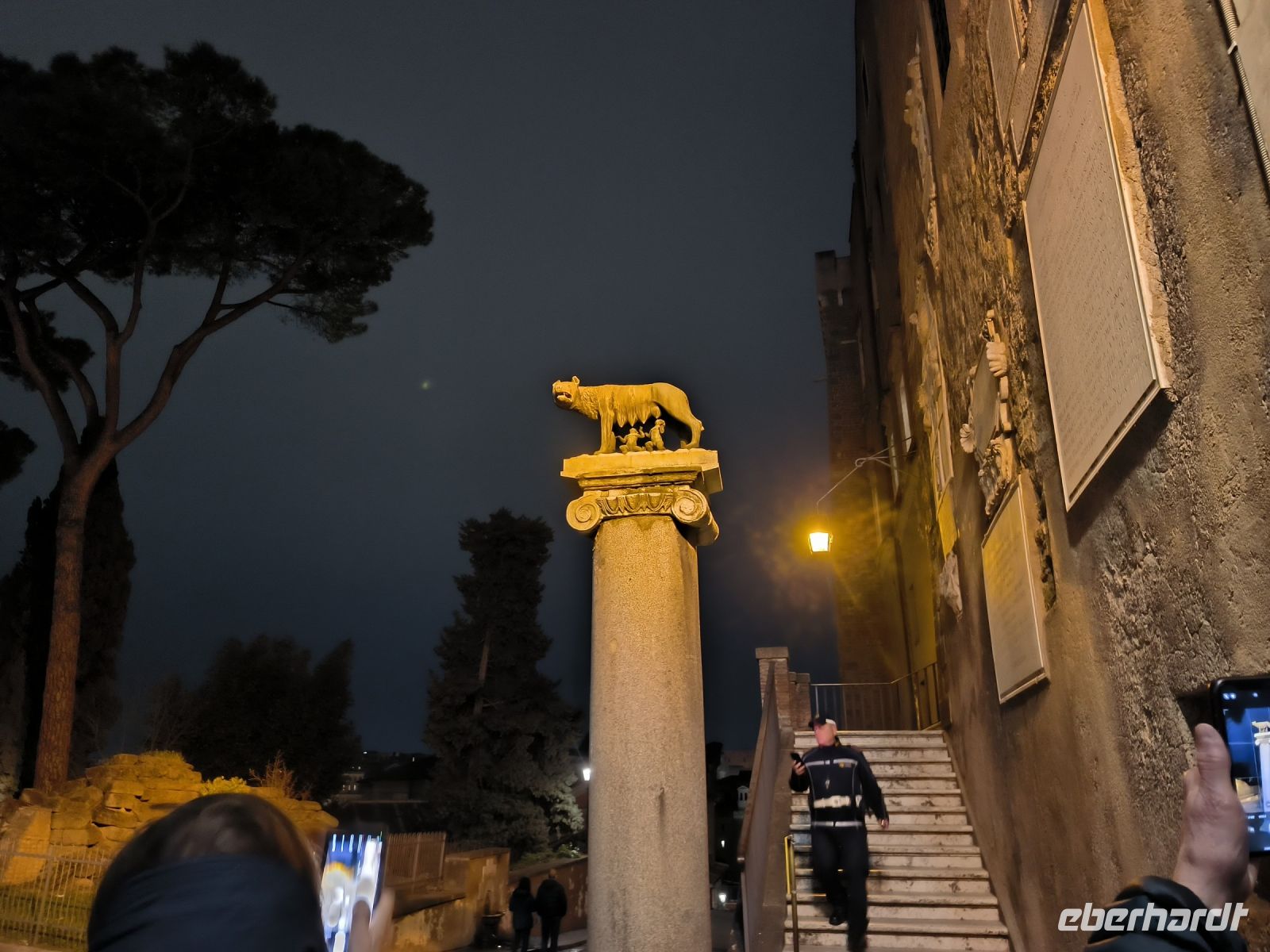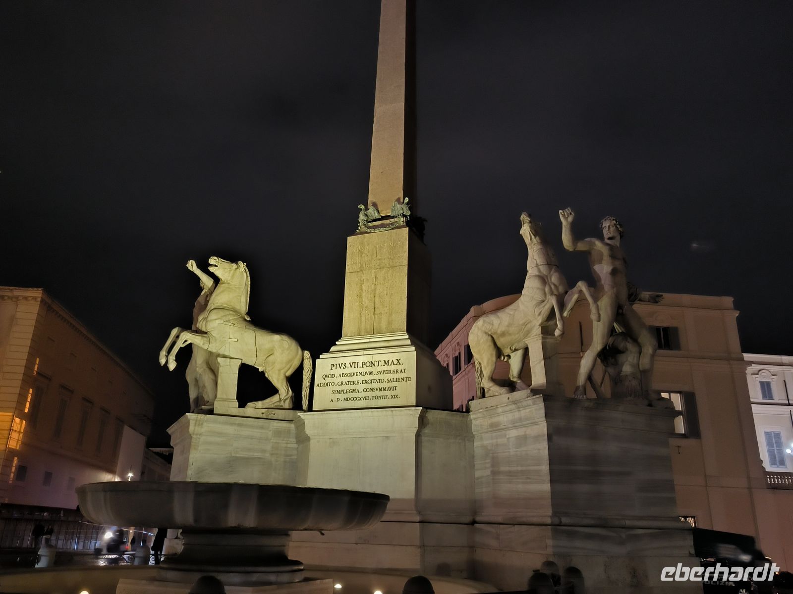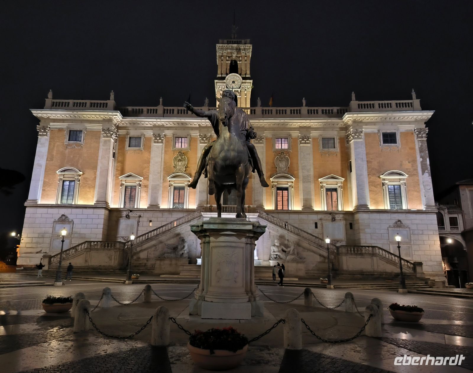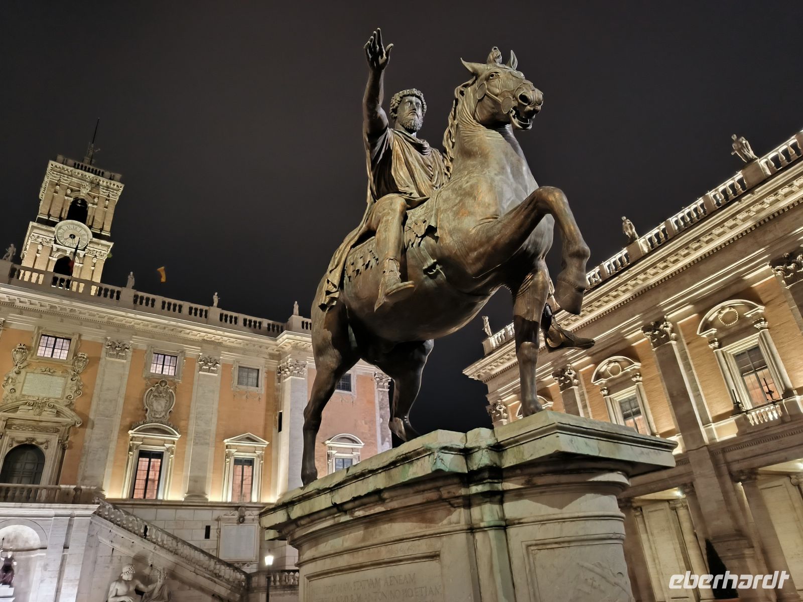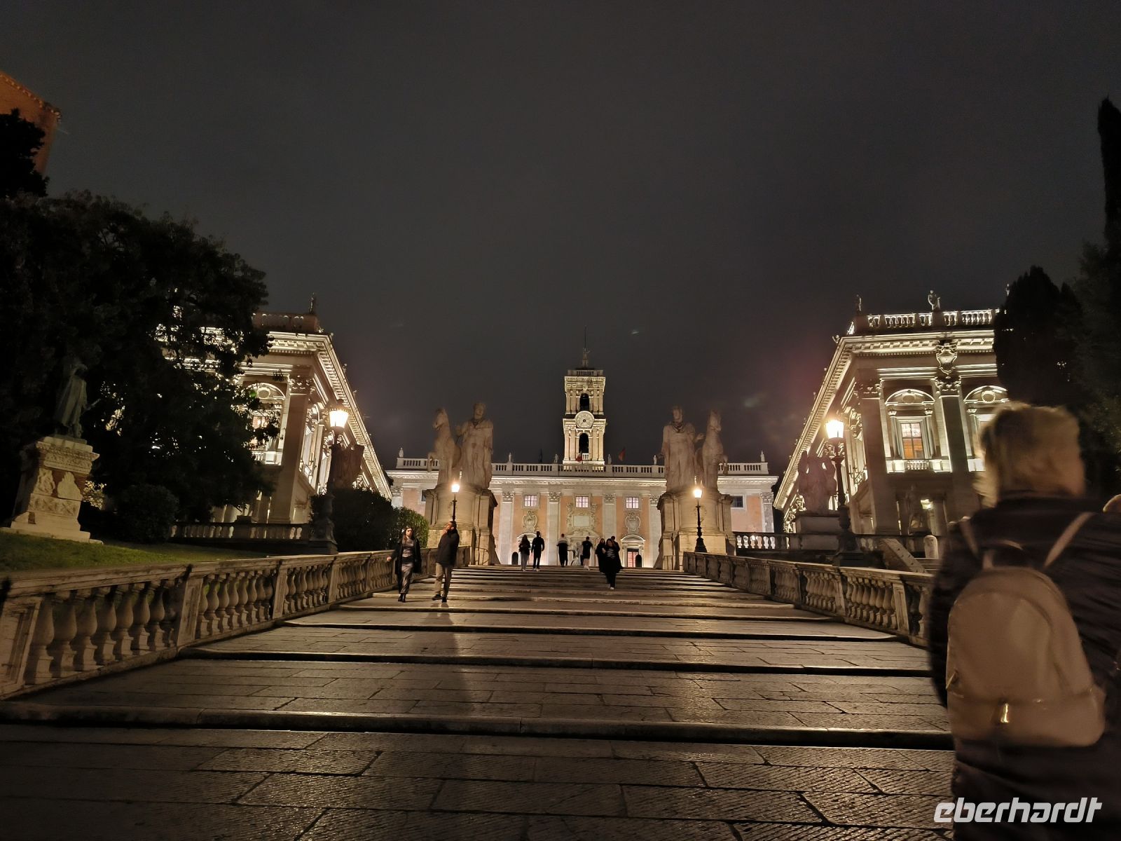 Das Abendessen haben wir heute schon für 17 Uhr bestellt. In der Osteria Buona Forchetta werden wir freundlich begrüßt und lassen uns die leckeren italienischen Gerichte schmecken. Die Stärkung brauchen wir auch, denn heute steht noch ein Abendspaziergang auf dem Programm. So haben wir wieder den Bus 916 genommen, um uns mit Sylvia an der Treppe zum Campidoglio zu treffen. Die Stufen und die Steigung der Treppe waren so konzipiert, dass sie für Reiter zu Pferd tauglich war, für uns das eher anstrengend. Oben sehen wir Kastor und Pollux, in der Mitte das Reiterstandbild des Kaisers Marc Aurel.