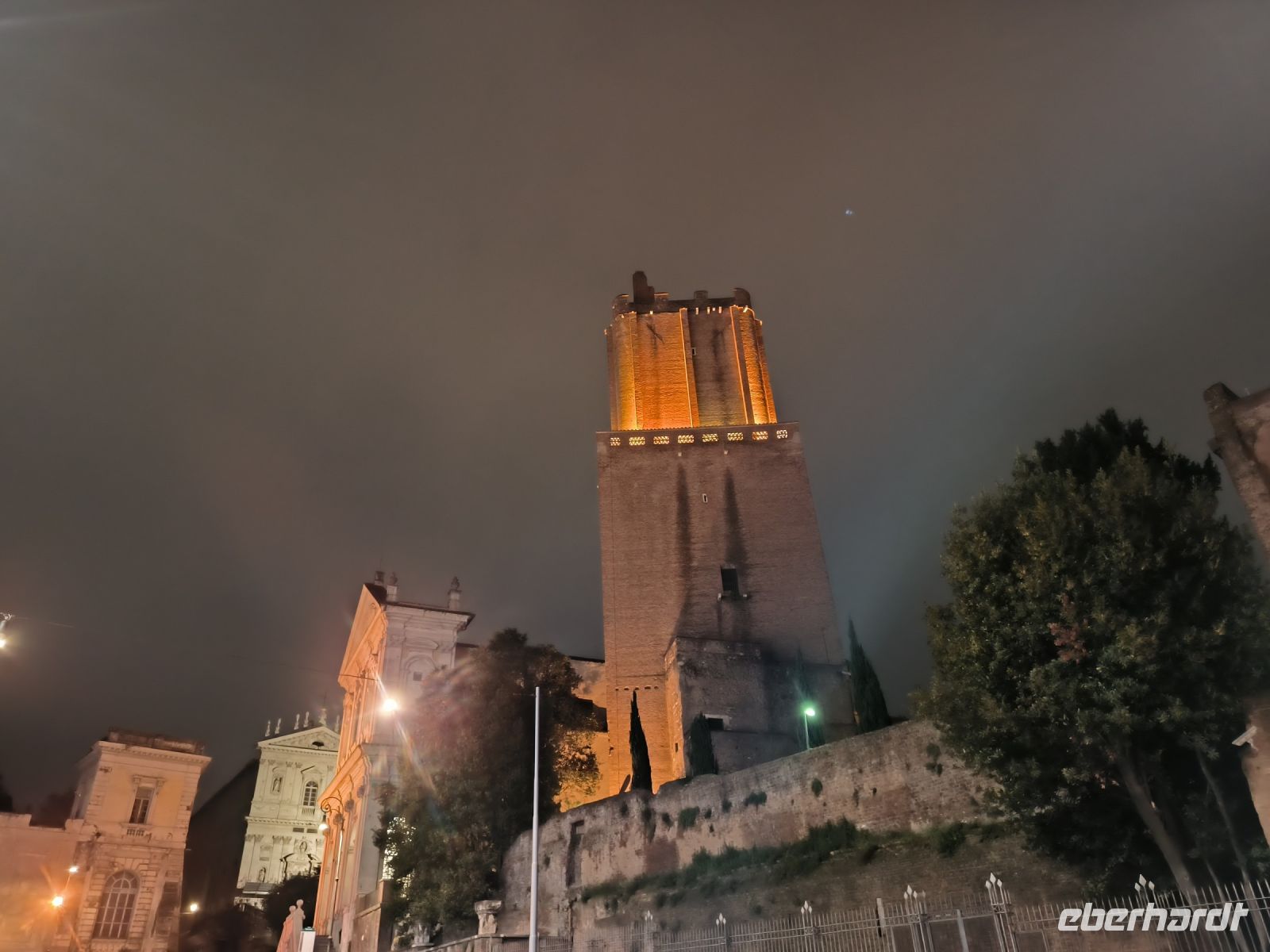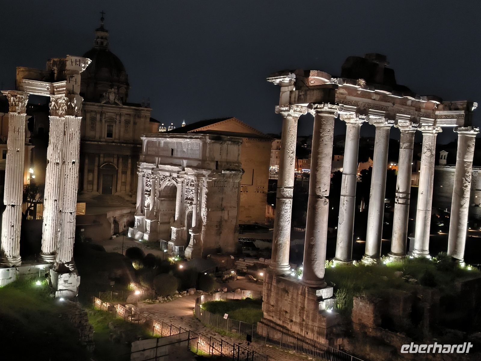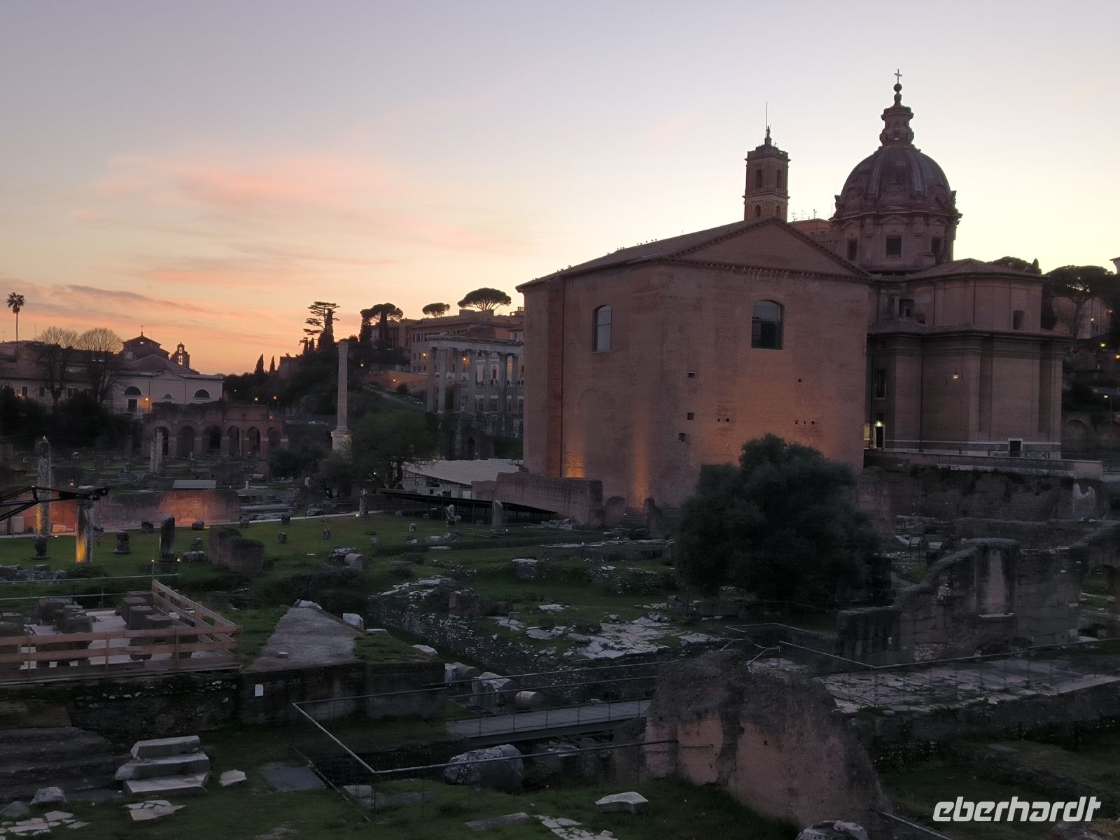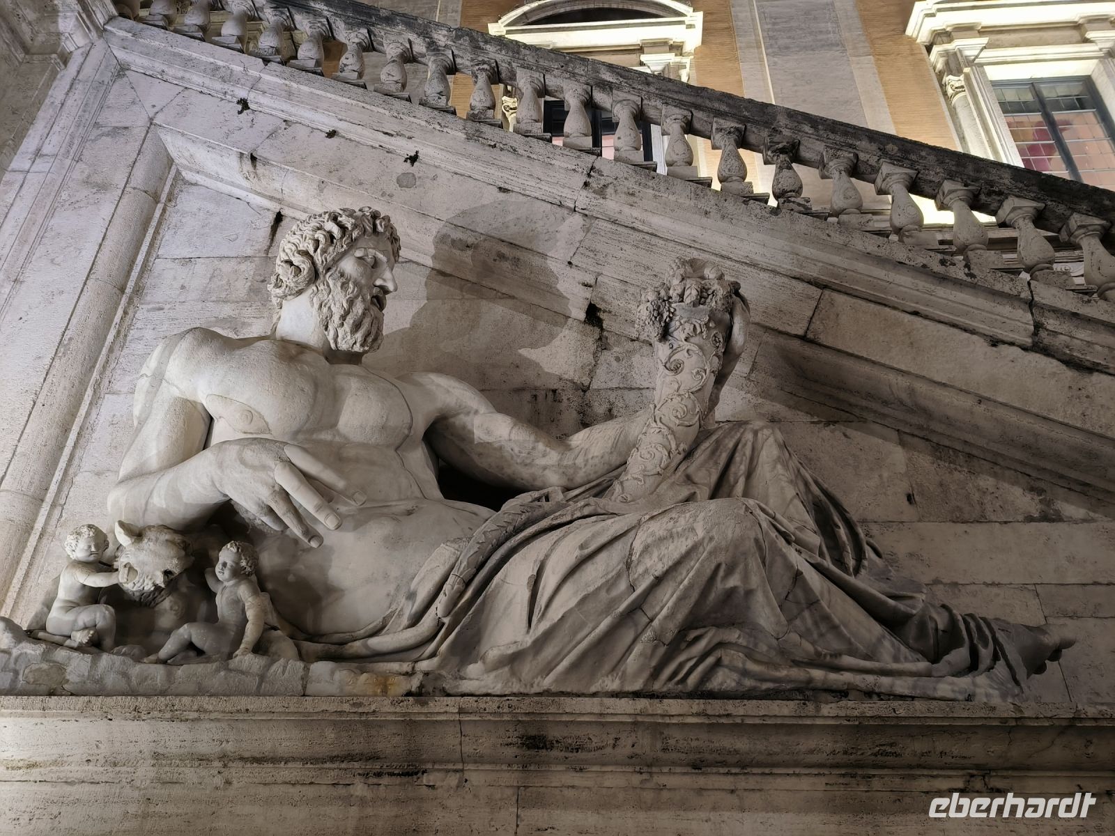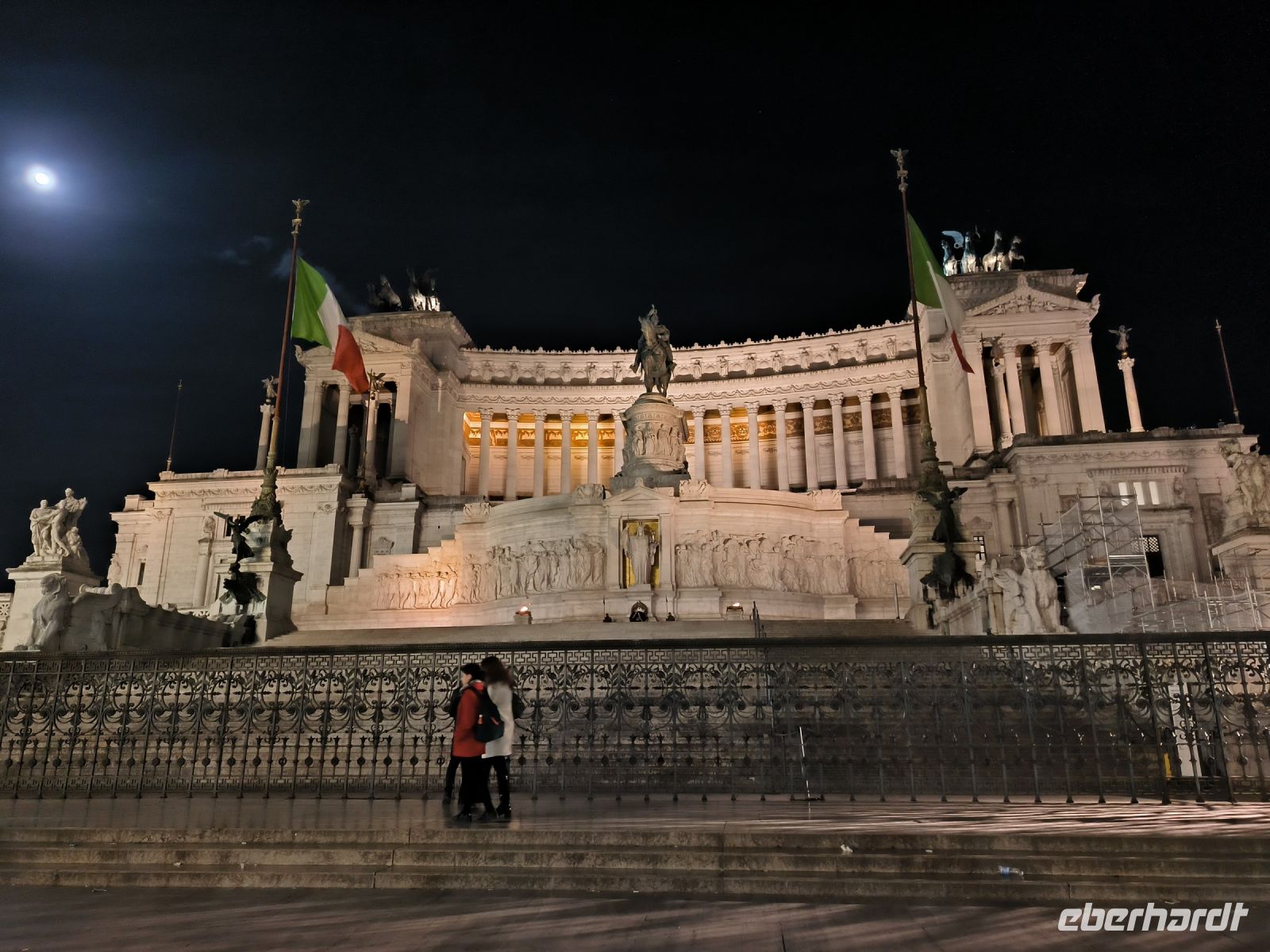 Das Abendessen haben wir heute schon für 17 Uhr bestellt. In der Osteria Buona Forchetta werden wir freundlich begrüßt und lassen uns die leckeren italienischen Gerichte schmecken. Die Stärkung brauchen wir auch, denn heute steht noch ein Abendspaziergang auf dem Programm. So haben wir wieder den Bus 916 genommen, um uns mit Sylvia an der Treppe zum Campidoglio zu treffen. Die Stufen und die Steigung der Treppe waren so konzipiert, dass sie für Reiter zu Pferd tauglich war, für uns das eher anstrengend. Oben sehen wir Kastor und Pollux, in der Mitte das Reiterstandbild des Kaisers Marc Aurel.