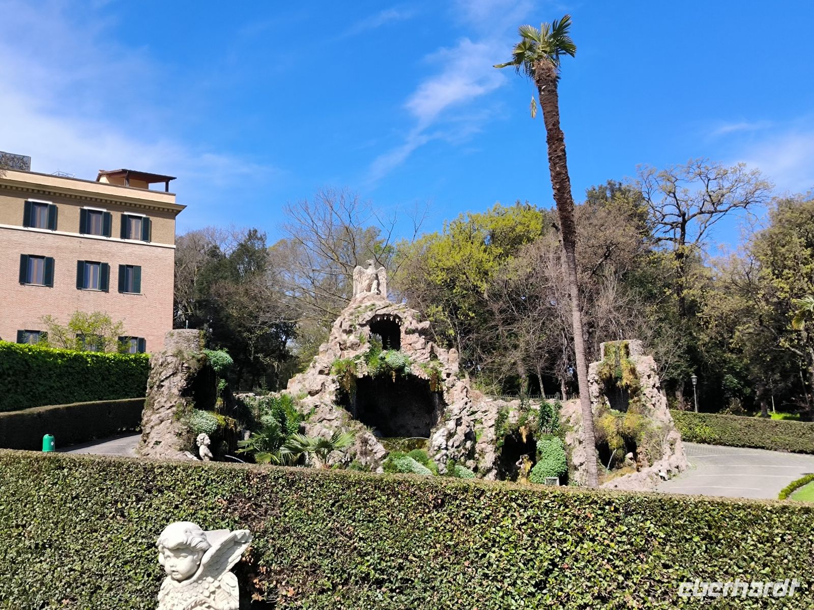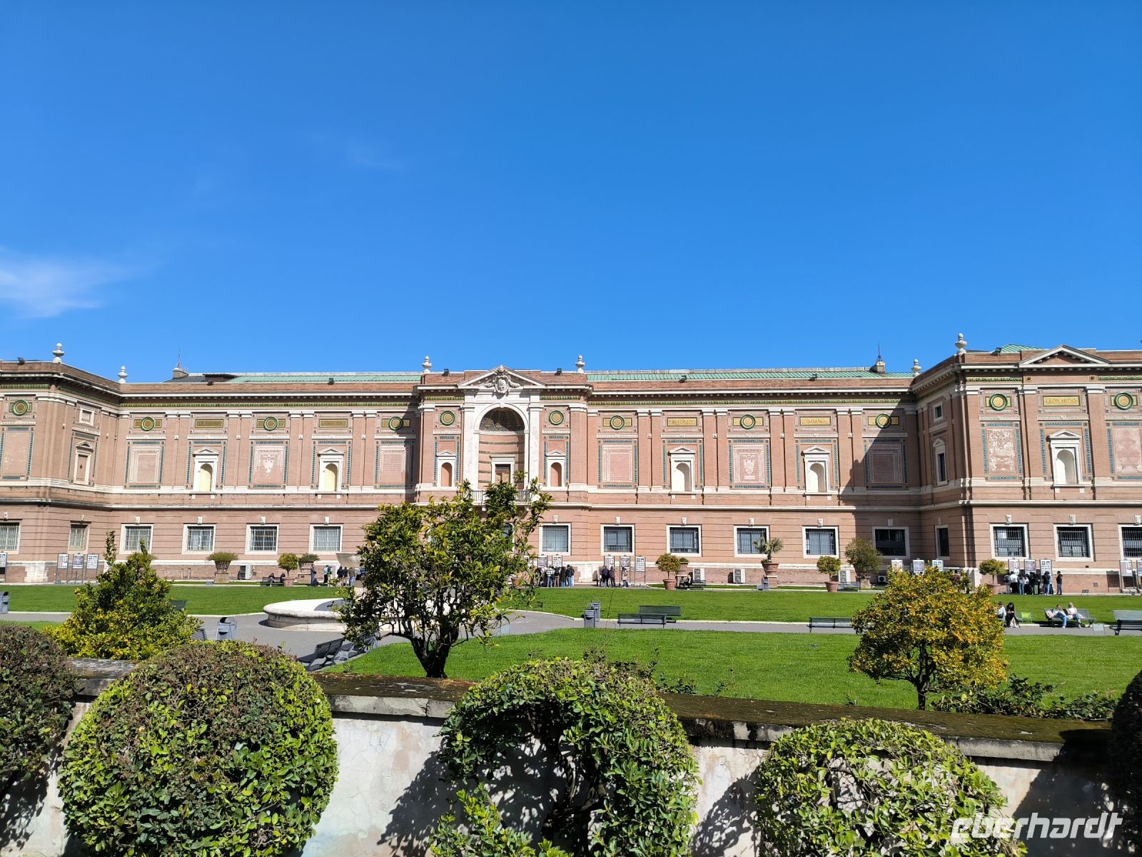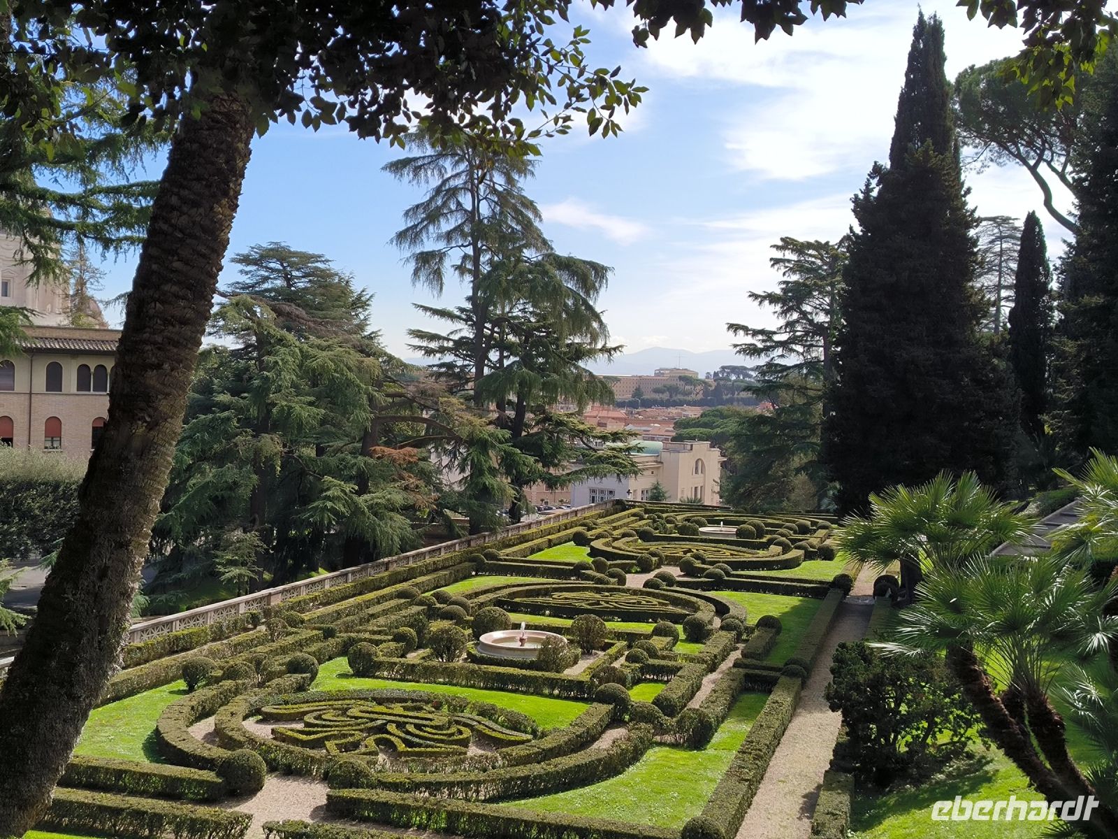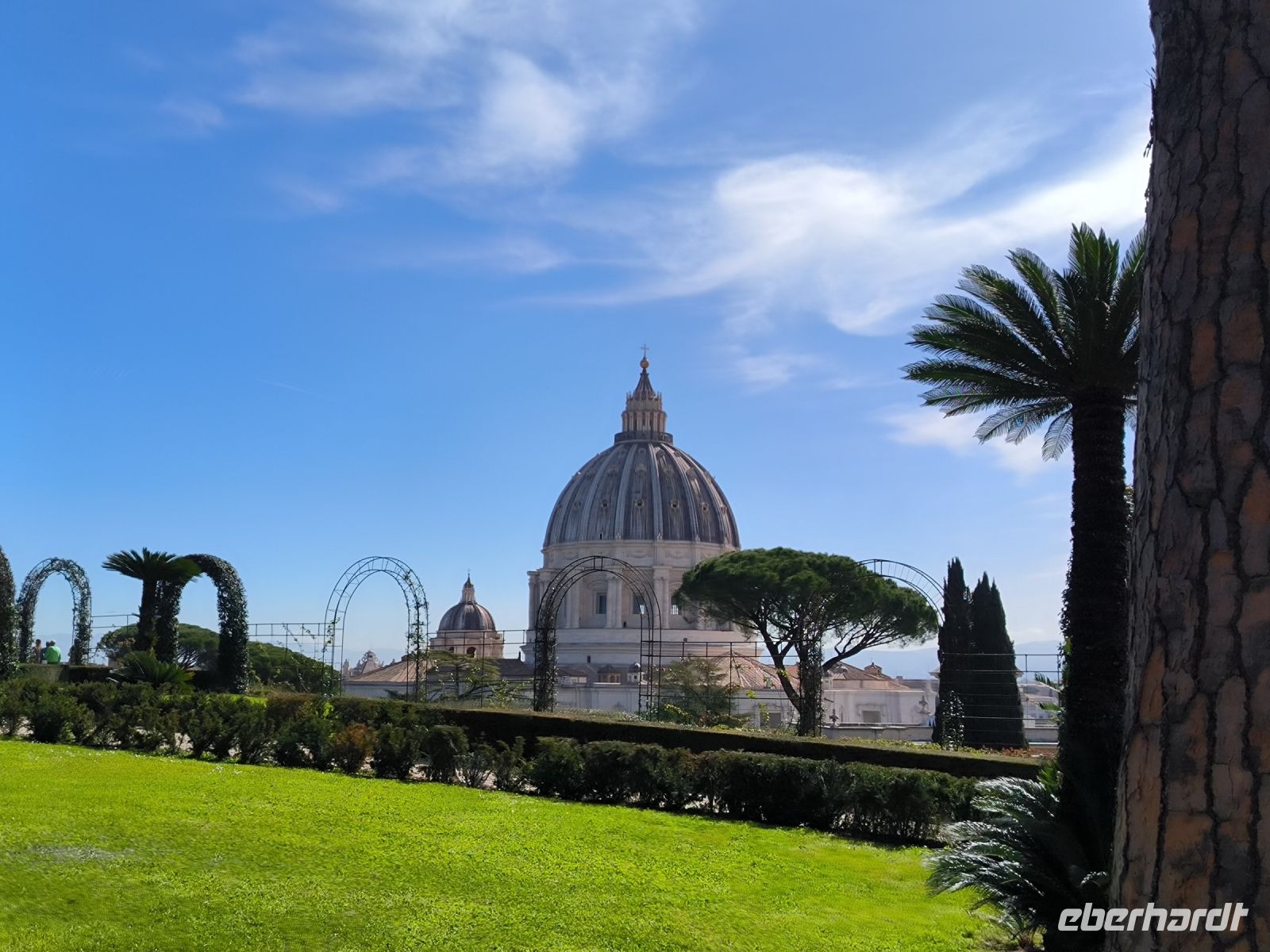 Nach dem Frühstück laufen wir gemeinsam zum Eingang der Vatikanischen Museen, wo wir stolz die langen Schlangen links liegenlassen können. Um die vorgebuchten Tickets abzuholen, müssen alle ihre Ausweiskopien (wir dürfen keine Originale bei uns haben, da die Reiseleiterin vor Taschendieben gewarnt hat) zeigen. Dann werden wir in das Heiligtum und zum Open Bus geführt. Wir ergattern die besten Plätze und dann fahren wir bei schönstem Sonnenschein durch die Gärten der Vatikanstadt. Es gibt Verwaltungsgebäude, einen Bahnhof und den Sitz von Radio Vaticano. Aber vor allem bewundern wir die in verschiedenen Stilen angelegten Gärten, Pflanzungen, exotischen Bäume sowie Brunnen und Skulpturen.
