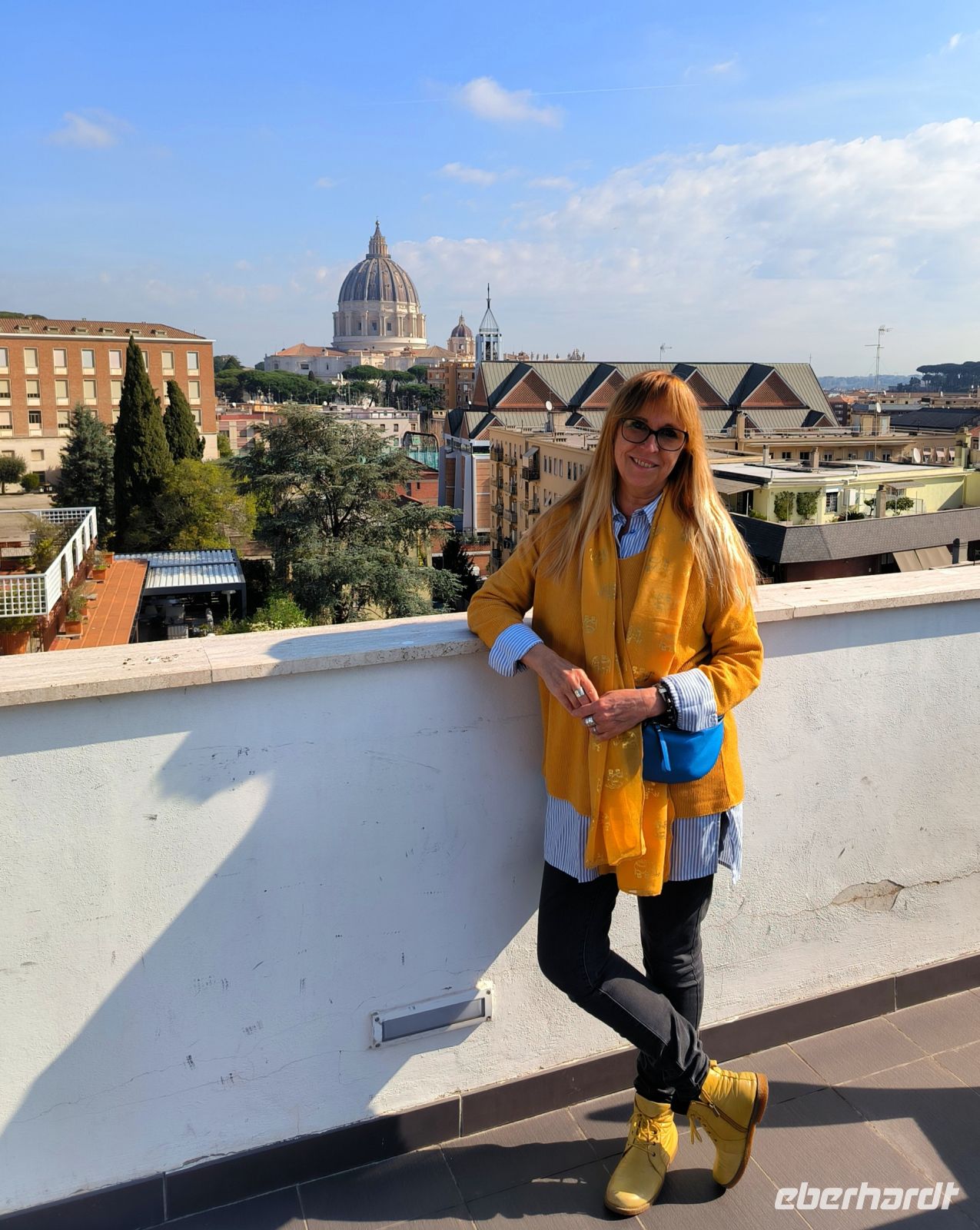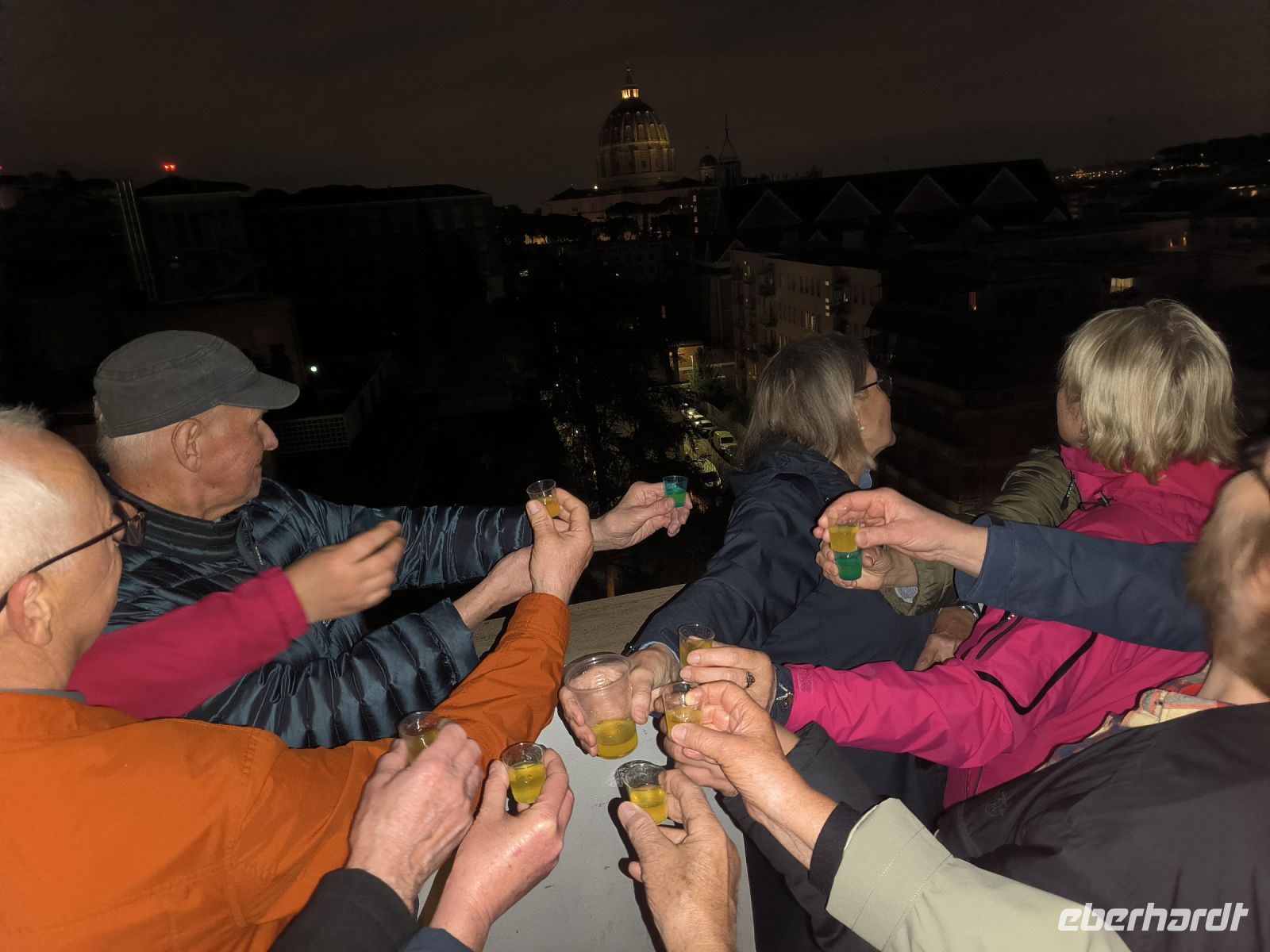 Die Reiseleiterin Heike erwartet die Gäste schon im Hotel Il Cantico und hilft beim Check in. Das erste Treffen mit der gesamten Gruppe findet 17:30 Uhr auf der herrlichen Dachterrasse mit Blick zur Kuppel des Petersdoms statt. Was für ein Panorama! Zur Begrüßung gibt es einen kleinen Lemoncello für alle, so fällt die Vorstellungsrunde doch gleich viel leichter.