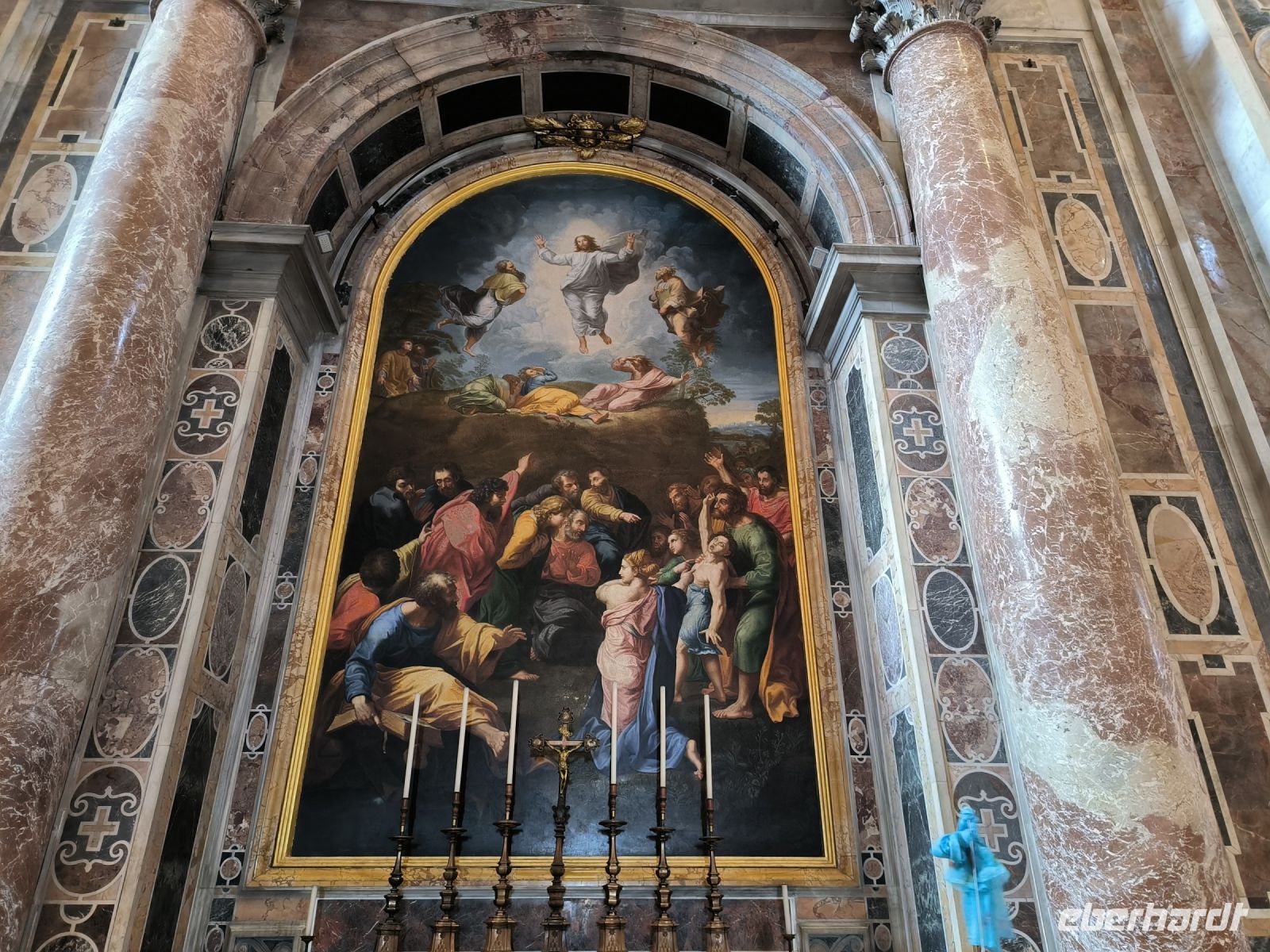 Die „Verklärung“ ist das letzte von Raffaello Sanzio ausgeführte Gemälde und stellt deshalb so etwas wie ein spirituelles Vermächtnis des Künstlers dar. Es wird sogar als “schönstes, göttlichstes und am meisten bewundertes Werk“ erwähnt und wir werden später im Petersdom eine als Mosaik aus tausenden Glassteinchen ausgeführte Kopie sehen.